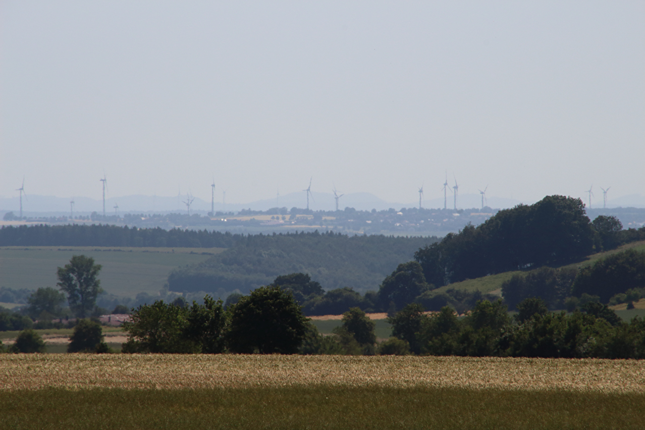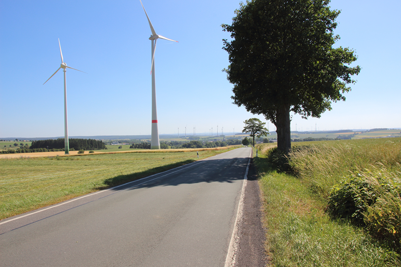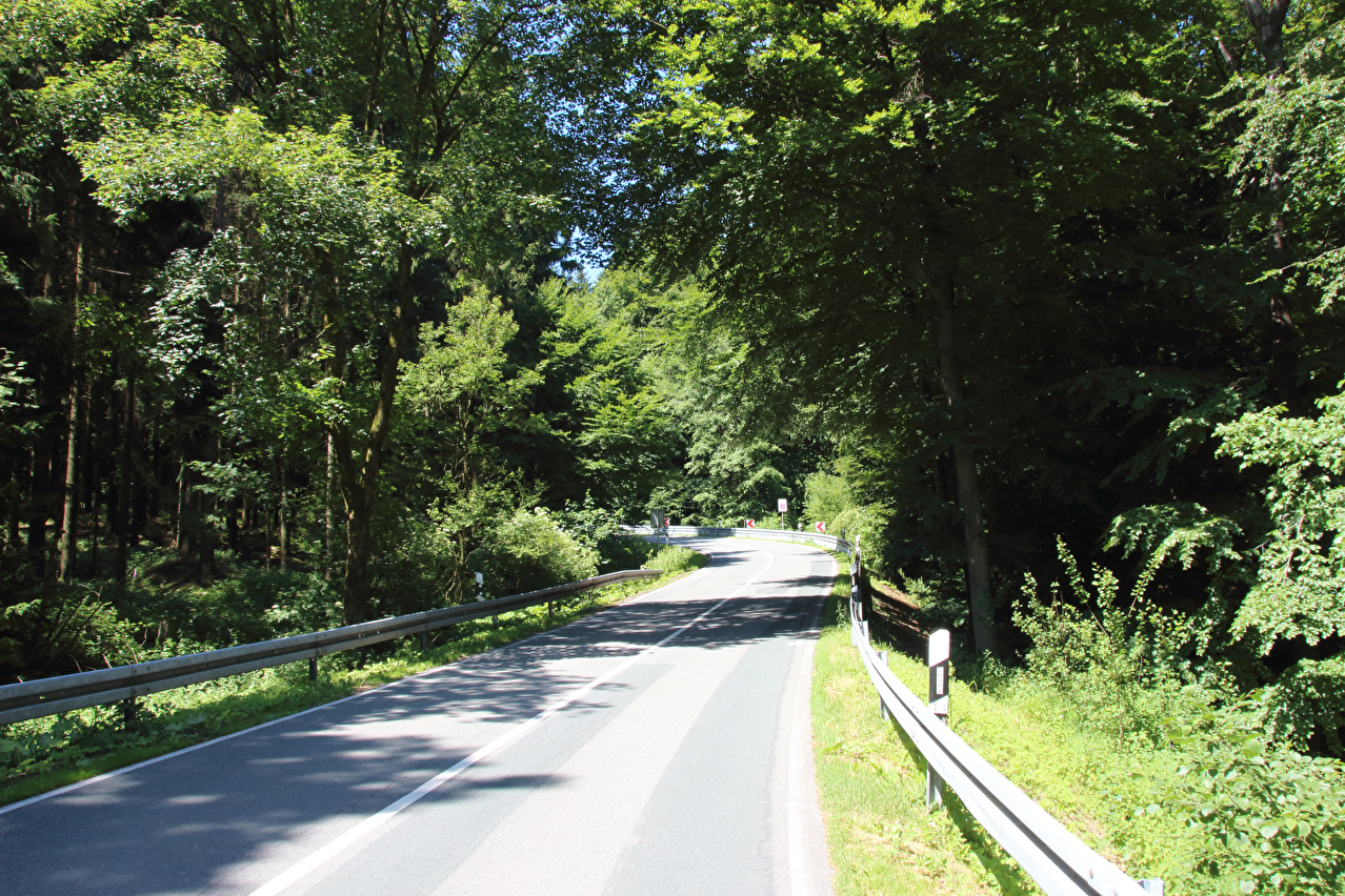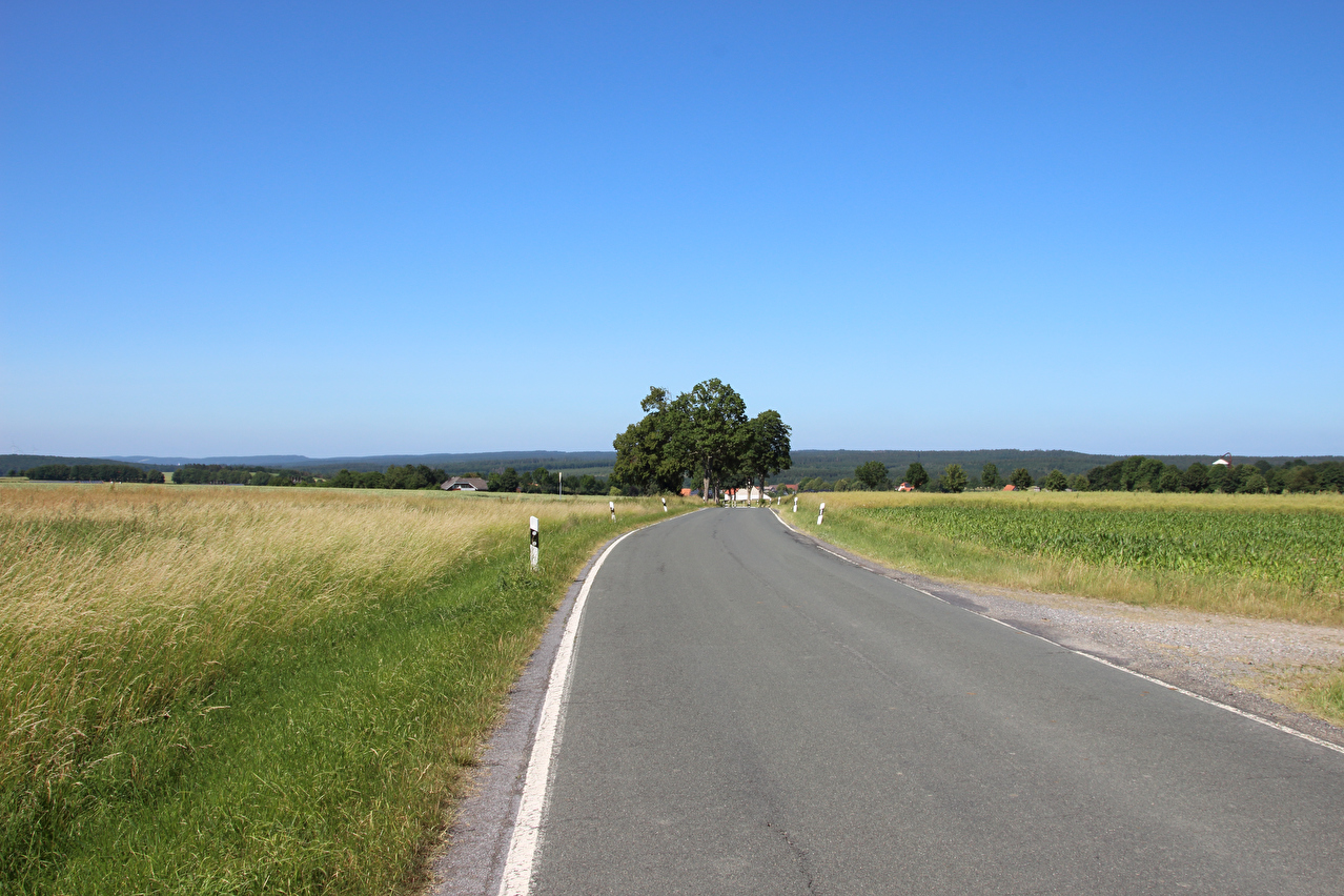 Beschreibung | Das Eggegebirge (kurz: die Egge) war bei den Anfahrten zu früheren Sauerlandtouren immer mit dem Zug durchquert worden und dabei war auch immer mal der Gedanke aufgekommen, dort Fahrrad zu fahren. Wegen der beiden Hitzewellen war statt einer Viertagestour dieses Mal die Entscheidung für zwei Zweitagestouren genau zwischen den Hitzewellen gefallen. Nach der Harztour am Wochenende folgte die erste dreitägige Hitzewelle. Diese zweite Zweitagestour führte nun in die Egge und angrenzende Gebiete und nutzte genau die beiden Tage bis zur nächsten Hitzewelle. Warm war es wegen des wolkenlosen Himmels trotzdem. Die Tour führte notwendigerweise zu Beginn durch die landschaftlich wenig attraktive Steinheimer Börde, da es zwischen Steinheim und Altenbeken keinen S-Bahn-Halt gibt und Überquerung des Eggehauptkamms von Langeland nach Altenbeken nicht ausgelassen werden sollte. Dieser erste Anstieg dieser Etappe war auch der längste. Da der Eggehauptkamm keine tiefen Einkerbungen in seinem Verlauf aufweist, steigen die Passstraßen über die Egge notwendigerweise sehr weit auf, wobei hier " sehr weit" in Relation zur Höhe der Egge und der umliegenden Mittelgebirge zu sehen ist. Die Passhöhe der L755 zwischen Langeland und Altenbeken liegt auf 376 m ü.NHN, der höchste Berg in der Egge ist gerade mal 464 m ü.NHN hoch. In der Westrampe der Passtraße liegen an mehreren Stellen Bremsschwellen quer über die gesamte Fahrbahn. Was der Verkehrsberuhigung dienen soll, stellt tatsächlich eine Gefahr für Zweiradfahrer dar! Von der Passhöhe kommend warnt lediglich ein Schild vor "Fahrbahnunebenheiten". Auch mit einer zur Sturzvermeidung reduzierten Geschwindigkeit sind diese Bremsschwellen oft erst sehr spät zu erkennen. Einen Materialschaden am Fahrrad können diese Bremsschwellen aufgrund ihrer Geometrie schon bei recht niedriger Geschwindigkeit verursachen. Eine Umfahrung ist mit dem Fahrrad selbst mit niedriger Geschwindigkeit nicht möglich, da diese Bremsschwellen sich über die gesamte Fahrbahn erstrecken. Ab Altenbeken, wo Mittag gegessen wurde, verlief diese Etappe mit Generalkurs Süd. Sie bot zwar keine langen Anstiege mehr, die Höhenmeter bergauf läpperten sich vielmehr durch das wellige Streckenprofil zusammen. Der Anstieg von Schwaney nach Herbram enthielt die steilste Rampe dieser Etappe mit bis zu 12 % Steigung. Nördlich oberhalb von Herbram erschienen zum ersten Mal die Berge des Sauerlandes am Südhorizont, davor allerdings zahlreiche Windkraftanlagen der beiden Windparks Asseln und Sintfeld. Die Fahrt führte dann auch durch den Windpark Asseln. Schön anzusehen sind diese Windspargel sicherlich nicht, aber zum einen ist die Paderborner Hochfläche im wesentlichen mit Feldern bestellt, also optisch wenig attraktiv, und zum anderen geht es ohne Windkraft hierzulande nicht, wenn der Strom nicht aus Kohle- und Kernkraftwerken kommen soll, denn "aus der Steckdose" kommt der Strom nun mal nicht. Der letzte, recht unscheinbare Sattelpunkt der Tour bildete auch das "Dach der Tour" kurz vor dem Etappenziel Essentho. |