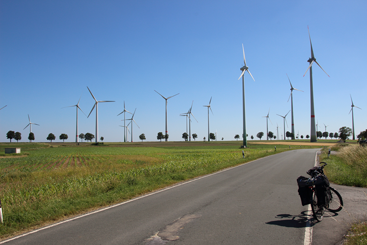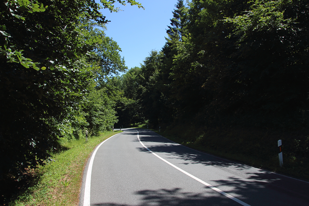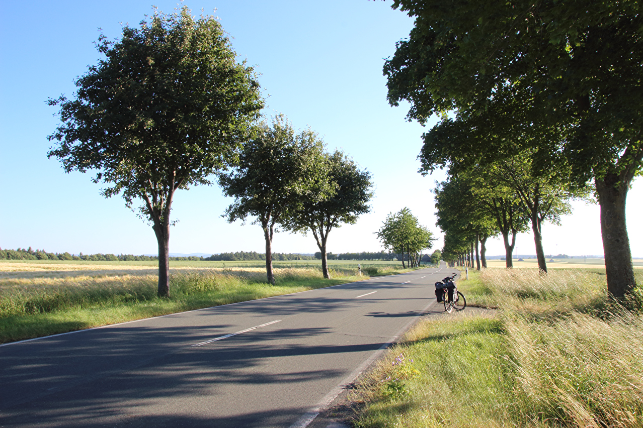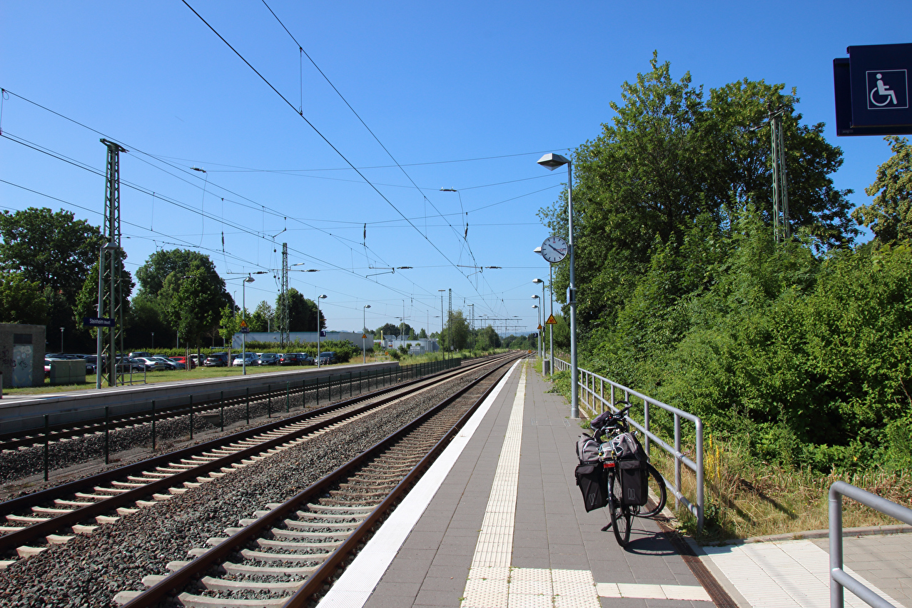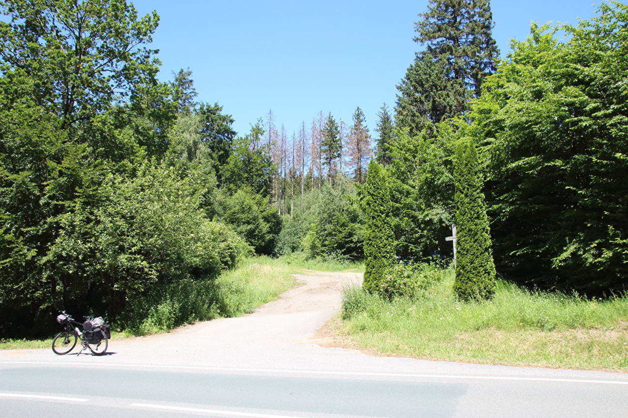 Beschreibung | Das Eggegebirge (kurz: die Egge) war bei den Anfahrten zu früheren Sauerlandtouren immer mit dem Zug durchquert worden und dabei war auch immer mal der Gedanke aufgekommen, dort Fahrrad zu fahren. Wegen der beiden Hitzewellen war statt einer Viertagestour dieses Mal die Entscheidung für zwei Zweitagestouren genau zwischen den Hitzewellen gefallen. Nach der Harztour am Wochenende folgte die erste dreitägige Hitzewelle. Diese zweite Zweitagestour führte nun in die Egge und angrenzende Gebiete und nutzte genau die beiden Tage bis zur nächsten Hitzewelle. Warm war es wegen des wolkenlosen Himmels trotzdem. Die Tour führte notwendigerweise zu Beginn durch die landschaftlich wenig attraktive Steinheimer Börde, da es zwischen Steinheim und Altenbeken keinen S-Bahn-Halt gibt und Überquerung des Eggehauptkamms von Langeland nach Altenbeken nicht ausgelassen werden sollte. Dieser erste Anstieg dieser Etappe war auch der längste. Da der Eggehauptkamm keine tiefen Einkerbungen in seinem Verlauf aufweist, steigen die Passstraßen über die Egge notwendigerweise sehr weit auf, wobei hier " sehr weit" in Relation zur Höhe der Egge und der umliegenden Mittelgebirge zu sehen ist. Die Passhöhe der L755 zwischen Langeland und Altenbeken liegt auf 376 m ü.NHN, der höchste Berg in der Egge ist gerade mal 464 m ü.NHN hoch. In der Westrampe der Passtraße liegen an mehreren Stellen Bremsschwellen quer über die gesamte Fahrbahn. Was der Verkehrsberuhigung dienen soll, stellt tatsächlich eine Gefahr für Zweiradfahrer dar! Von der Passhöhe kommend warnt lediglich ein Schild vor "Fahrbahnunebenheiten". Auch mit einer zur Sturzvermeidung reduzierten Geschwindigkeit sind diese Bremsschwellen oft erst sehr spät zu erkennen. Einen Materialschaden am Fahrrad können diese Bremsschwellen aufgrund ihrer Geometrie schon bei recht niedriger Geschwindigkeit verursachen. Eine Umfahrung ist mit dem Fahrrad selbst mit niedriger Geschwindigkeit nicht möglich, da diese Bremsschwellen sich über die gesamte Fahrbahn erstrecken. Ab Altenbeken, wo Mittag gegessen wurde, verlief diese Etappe mit Generalkurs Süd. Sie bot zwar keine langen Anstiege mehr, die Höhenmeter bergauf läpperten sich vielmehr durch das wellige Streckenprofil zusammen. Der Anstieg von Schwaney nach Herbram enthielt die steilste Rampe dieser Etappe mit bis zu 12 % Steigung. Nördlich oberhalb von Herbram erschienen zum ersten Mal die Berge des Sauerlandes am Südhorizont, davor allerdings zahlreiche Windkraftanlagen der beiden Windparks Asseln und Sintfeld. Die Fahrt führte dann auch durch den Windpark Asseln. Schön anzusehen sind diese Windspargel sicherlich nicht, aber zum einen ist die Paderborner Hochfläche im wesentlichen mit Feldern bestellt, also optisch wenig attraktiv, und zum anderen geht es ohne Windkraft hierzulande nicht, wenn der Strom nicht aus Kohle- und Kernkraftwerken kommen soll, denn "aus der Steckdose" kommt der Strom nun mal nicht. Der letzte, recht unscheinbare Sattelpunkt der Tour bildete auch das "Dach der Tour" kurz vor dem Etappenziel Essentho. |
