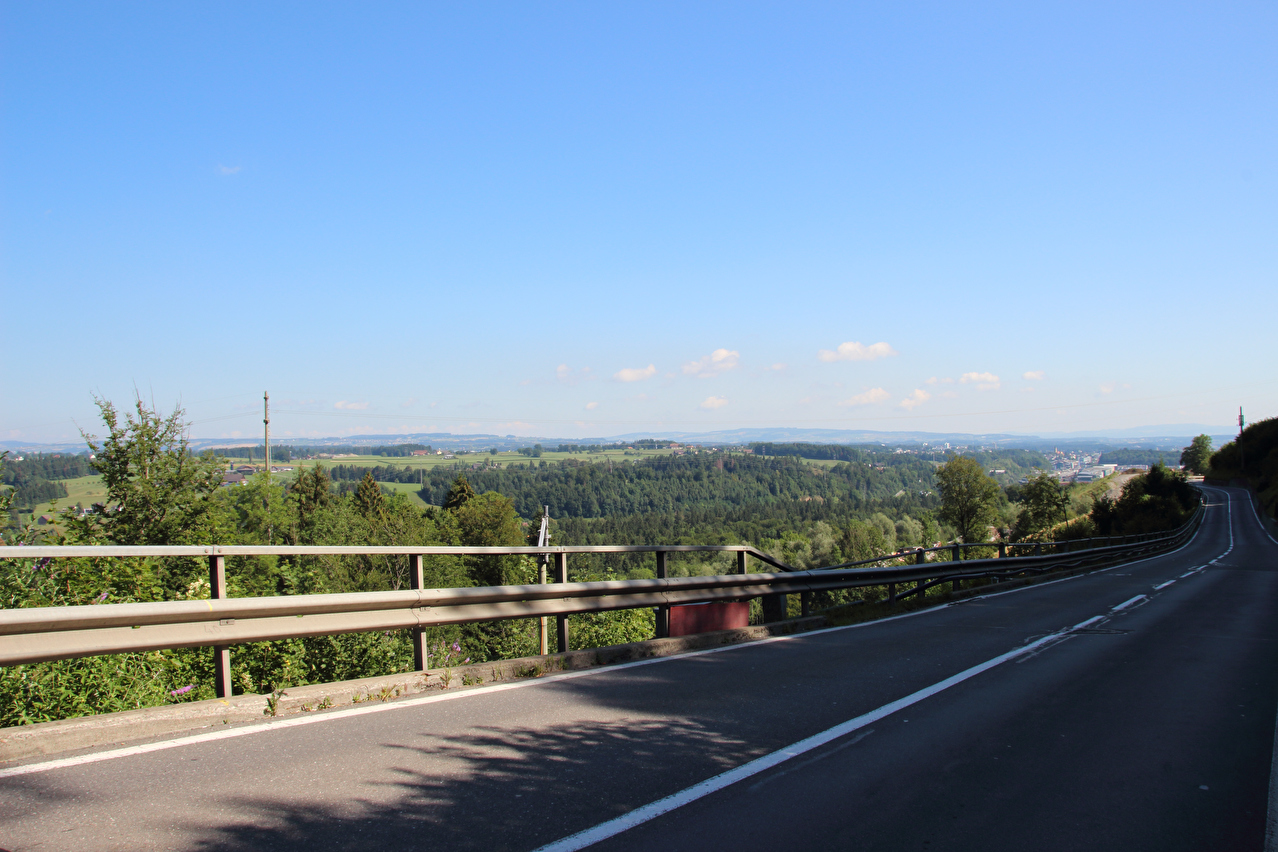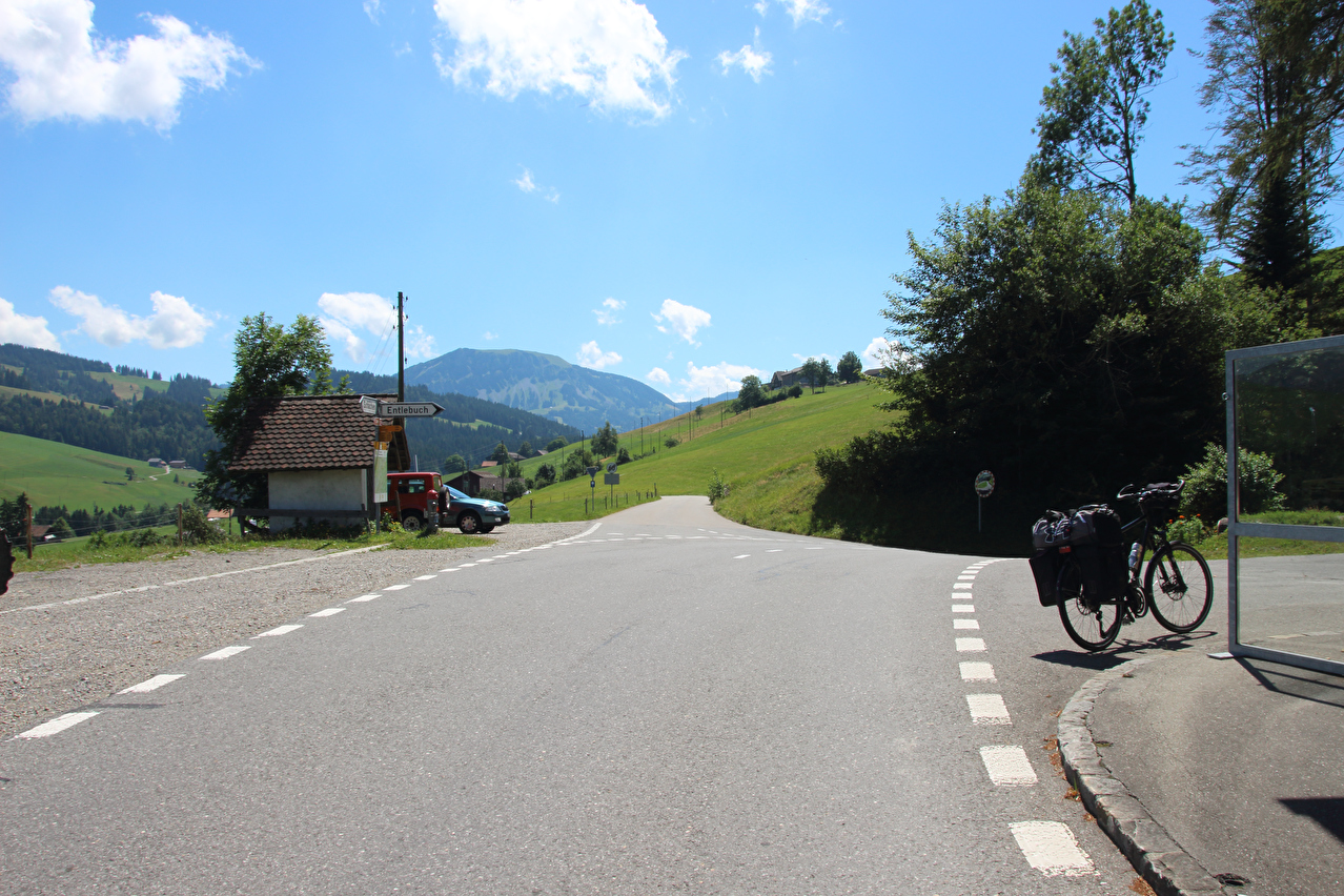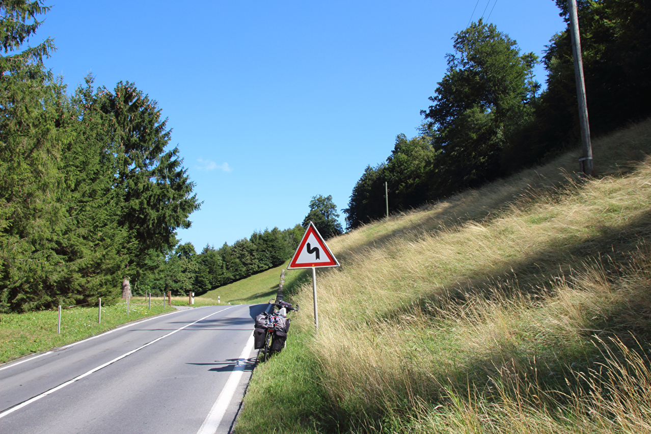 Beschreibung | Diese Etappe war bewusst kurz geplant, wobei die Höhenmeter bergauf zum Einrollen schon passten. Grund für die Kürze der Etappe war die extrem schlechte Erfahrung mit der Bahnanreise in die Schweiz (Hannover → Sargans) am 24.07.2017. Die Länge der Etappe hätte auch einen Start erst am Mittag erlaubt, wenn die Ankunft am Vortag extrem spät erfolgt wäre oder gar Zugverspätungen oder -ausfälle eine Übernachtung unterwegs irgendwo in Südwestdeutschland oder der Nordschweiz erfordert hätten und die Restanreise nach Luzern erst am diesem Vormittag erfolgt wäre. Der erste Pass dieser Tour ist so unscheinbar, dass er nicht einmal einen Namen hat. Dabei trennt er schon recht alpines Gelände im Süden vom ziemlich flachen Vorland im Norden. Somit führte diese Etappe erst mal aus den Alpen raus. Ab Schachen ging es dann wieder in die richtige Richtung, also bergauf und vor allem nach Süden wieder in Richtung Alpen. Der nördliche Teil der Emmentaler Alpen und insbesondere das Entlebuch und die westlich daran angrenzende Gebiete haben noch voralpinen Charakter, sind aber bei weitem nicht so flach wie das Luzerner Hinterland nördlich der Emmentaler Alpen. Bereits ab Malters und dann immer wieder mal kamen Lärm und Dreck von oben. Kampfjets, "Hornets" (McDonnell Douglas F/A-18) der Schweizer Armee waren auf Übungsflug in dem Gebiet unterwegs. Auf der Passhöhe fiel das Mittagessen aus. Der dortige Gasthof machte allen Ernstes Sommerferien! Also folgte gleich die Abfahrt nach Entlebuch (LU). Dort wurde erst mal ein Bäcker angesteuert, da das Hotel, in dem übernachtet werden sollte, erst am späten Nachmittag öffnete und im Ort am frühen Nachmittag auch sonst keine Gelegenheit für die Einnahme einer warmen Mahlzeit vorhanden war. Wettermäßig war diese Etappe eine recht heiße Angelegenheit. Die Sonne schien ungestört vom fast wolkenlosen Himmel und größere Höhen erreichte diese Etappe auch nicht. (LU) hinter dem Ortsnamen Entlebuch steht für "Kanton Luzern" und dient hier der Unterscheidung des Ortes von Naturraum Entlebuch. Diese zweibuchstabigen Abkürzen für die Schweizer Kantone werden immer dann hinter die Namen von Ortschaften gesetzt, wenn gleichnamige Ortschaften in anderen Kantonen oder andere gleichnamige geografische Objekte in der Schweiz existieren. |