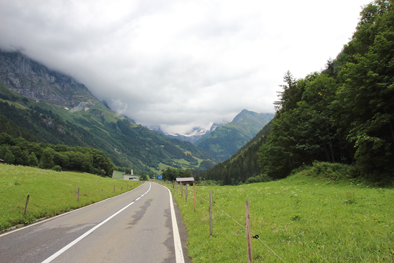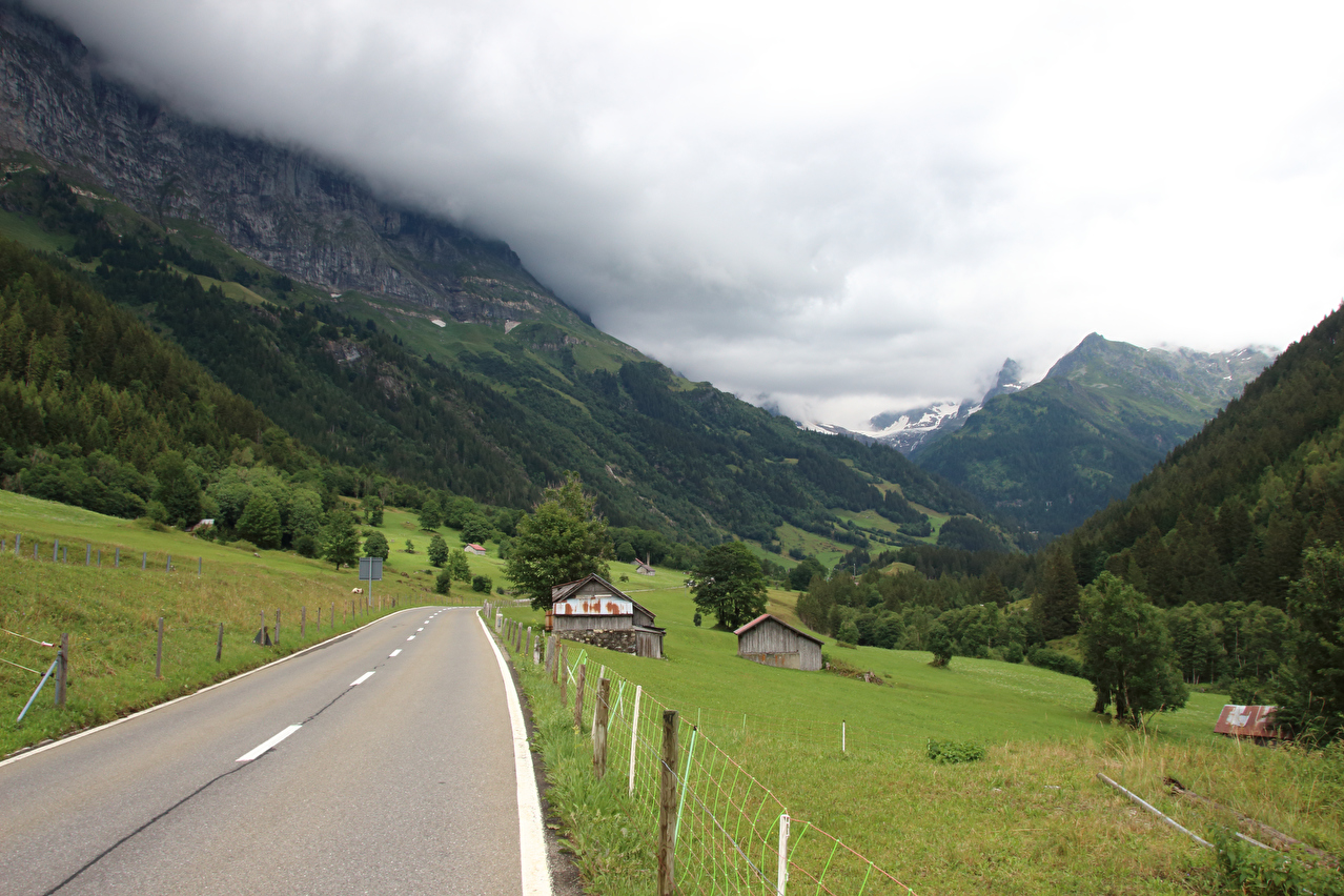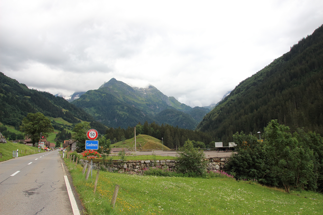 Beschreibung | Der erste Abschnitt dieser Etappe bis Innertkirchen war eine inverse Streckewiederholung. In der Gegenrichtung war diese Strecke im Rahmen der letzten Etappe der Alpentour am 03.08.2011 gefahren worden. Gestartet wurde bei Dauerregen. Die wenigen Fotos wurden entweder von Unterständen aus geschossen oder in "Westernmanier": Ziel anvisieren, schnell ziehen, paar Mal abdrücken, schnell wieder weg stecken. Diese Art des Fotografierens, die auch nur bis zu einer gewissen Regenintensität funktioniert ohne die Kamera zu beschädigen, musste bei dieser Tour noch mehrfach angewendet werden. In Innertkirchen wurde Mittag gegessen. Danach erfolgte die Auffahrt auf die Westrampe des Sustenpasses, deren unteres Ende in Innertkirchen mit dem unteren Ende der Nordrampe des Grimselpasses zusammentrifft. Während der Fahrt im Gadmertal ließ der Regen allmählich nach und hörte irgendwann ganz auf. Die Berge verbargen sich jedoch bis zum Ende der Etappe größtenteils in den Wolken. In Gadmen erfolgte die erste Bergankunft dieser Tour. |
