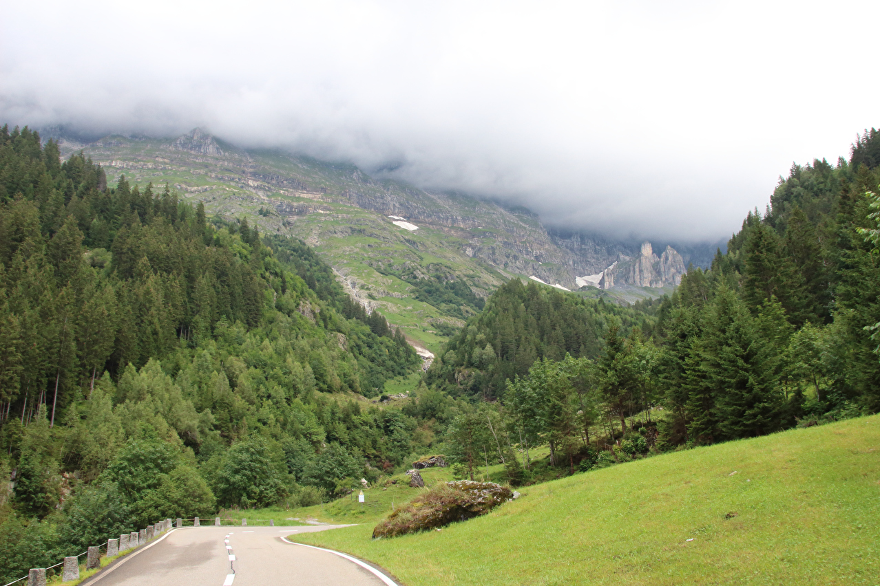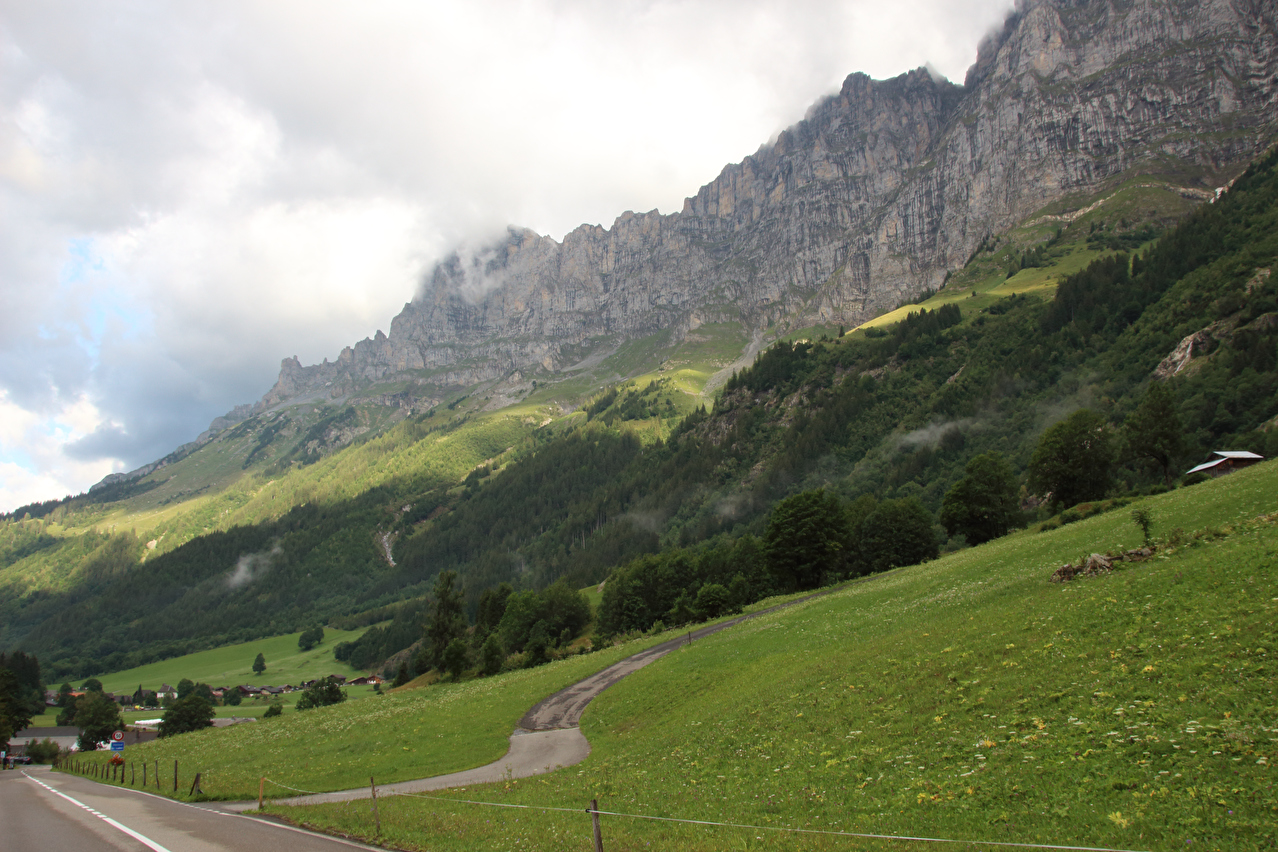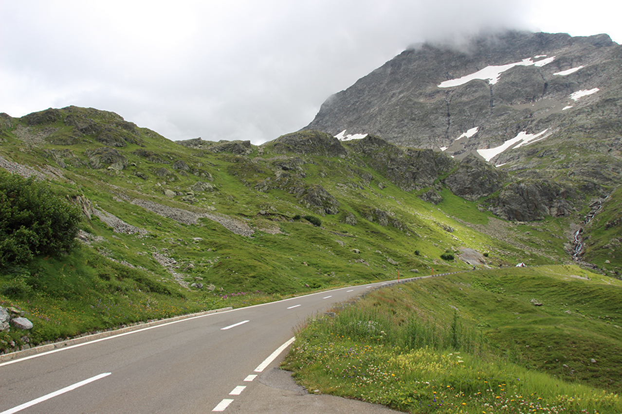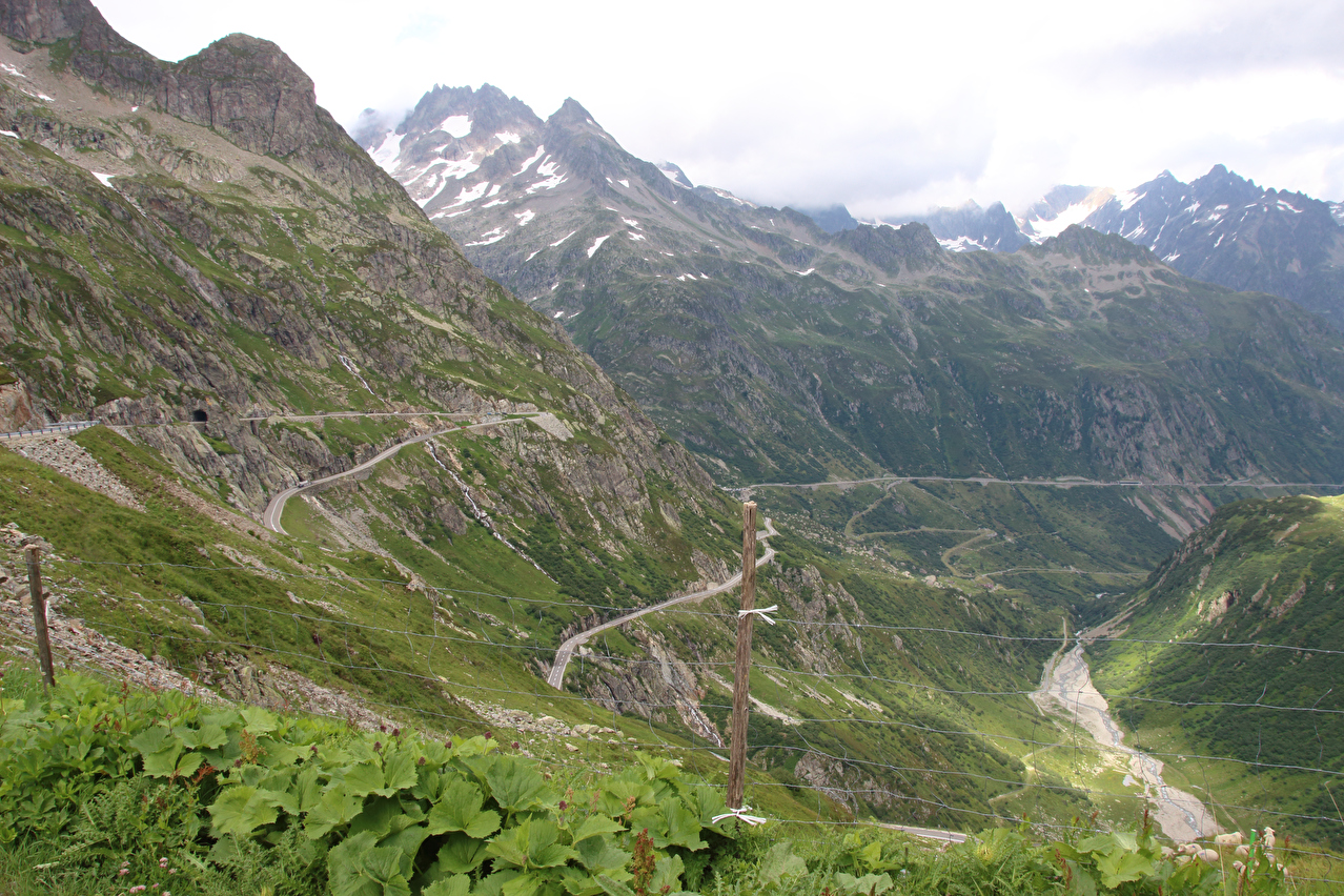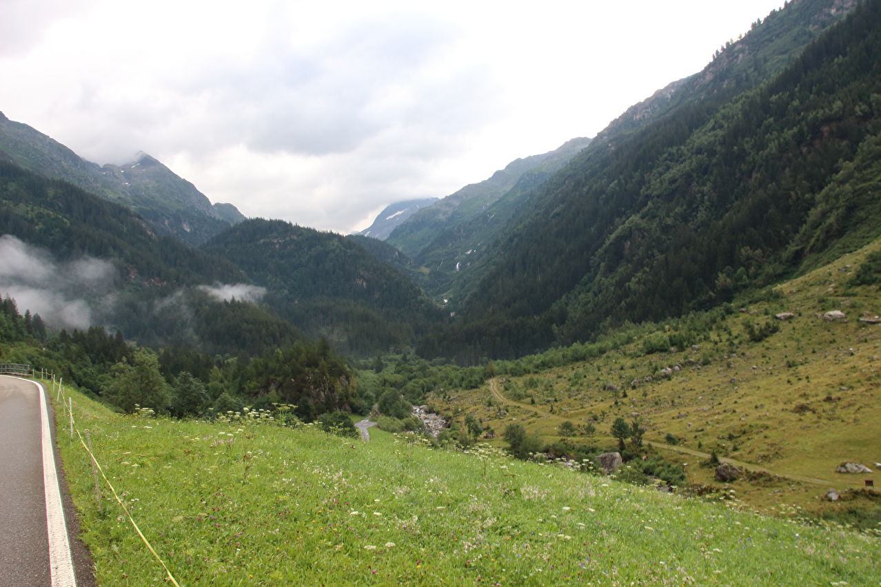 Blick über eine Kehre bergauf zur immer noch wolkenverhangenen Gadmerflue ![]() 300 dpi JPEG |