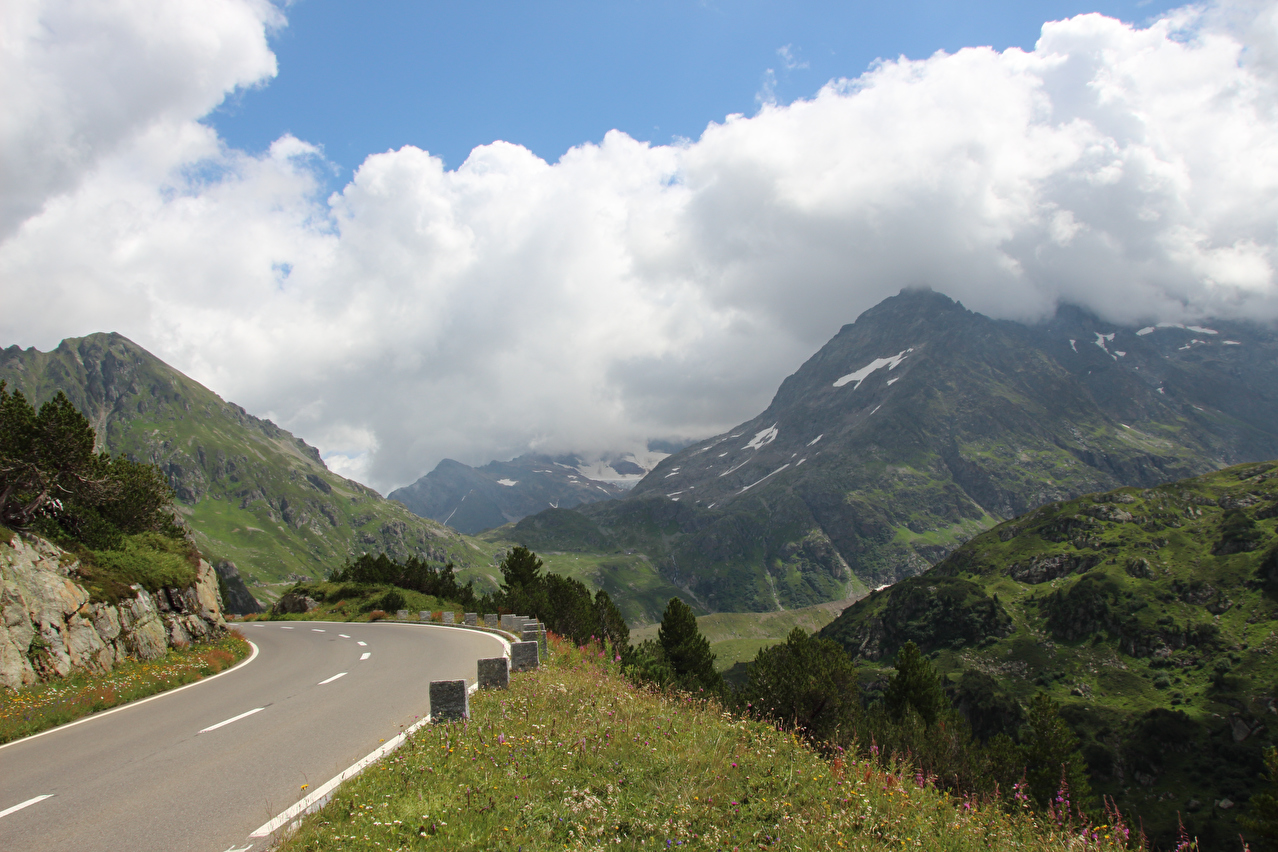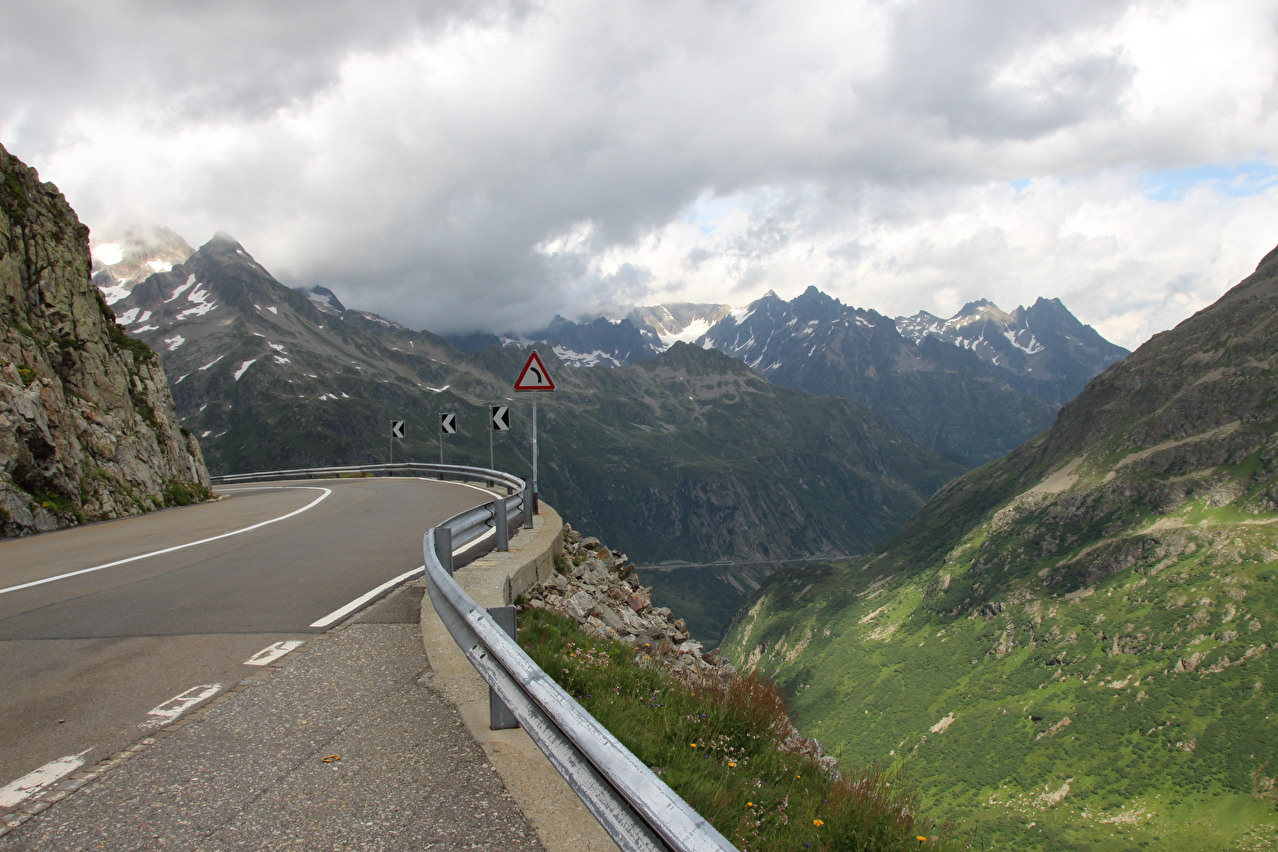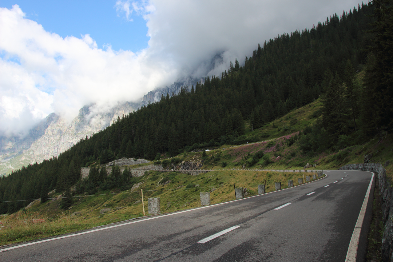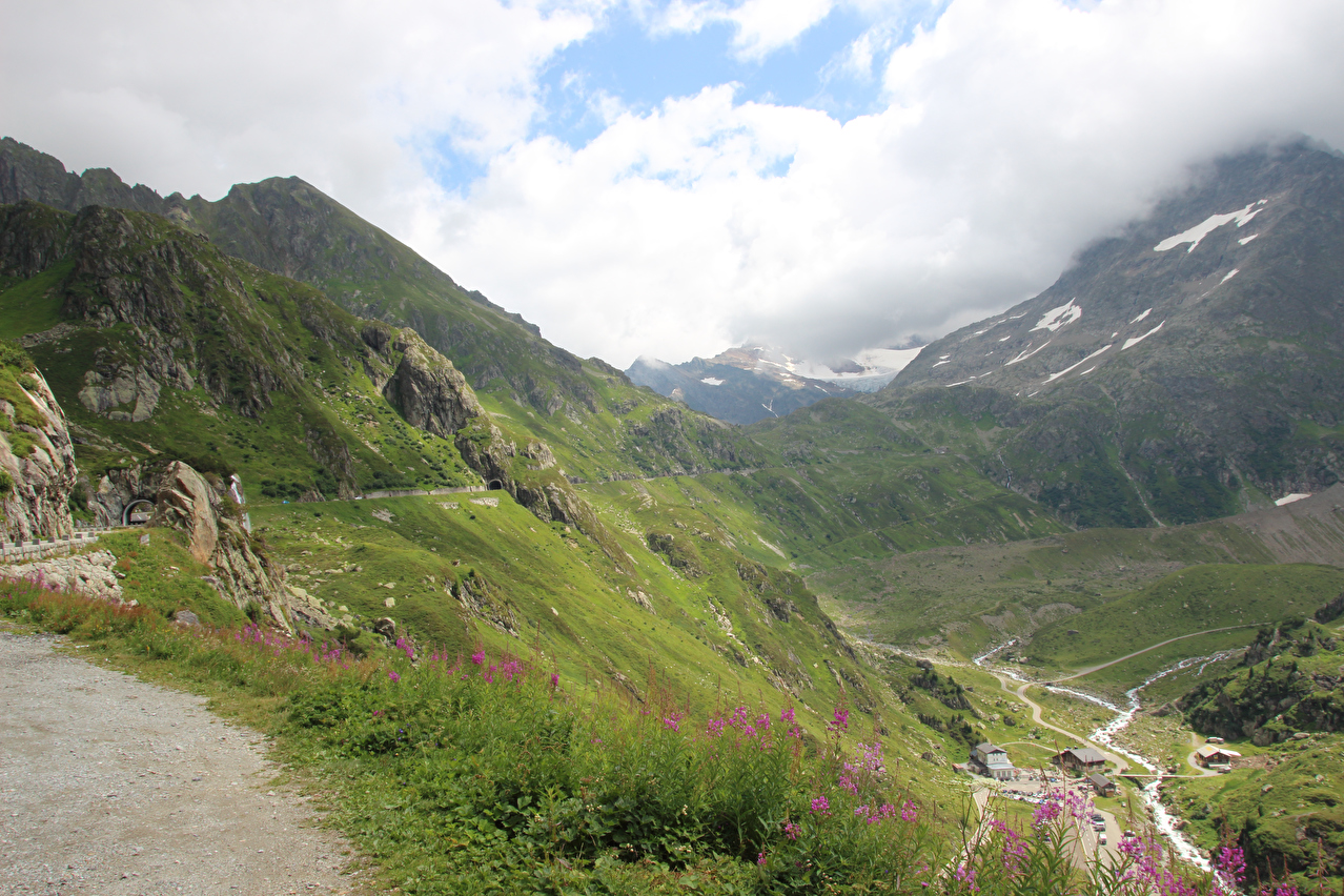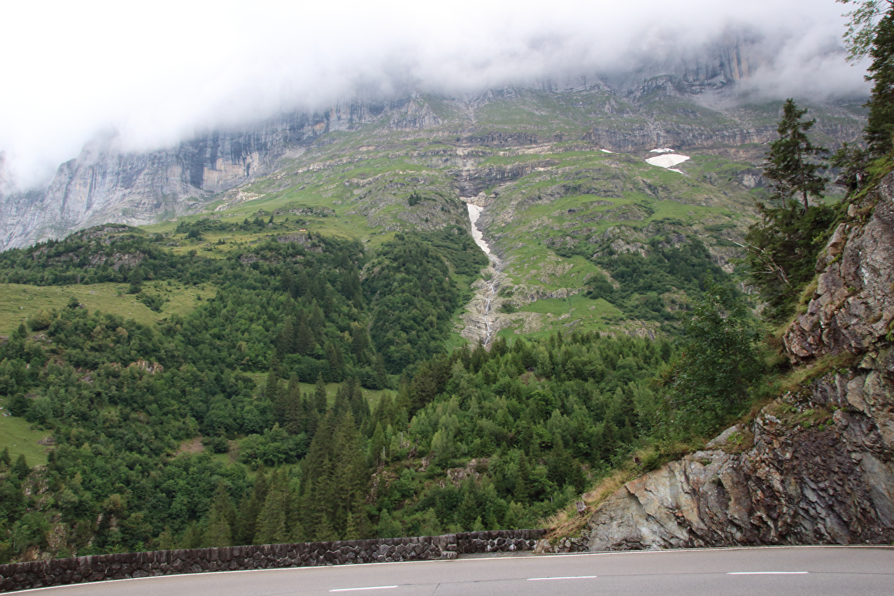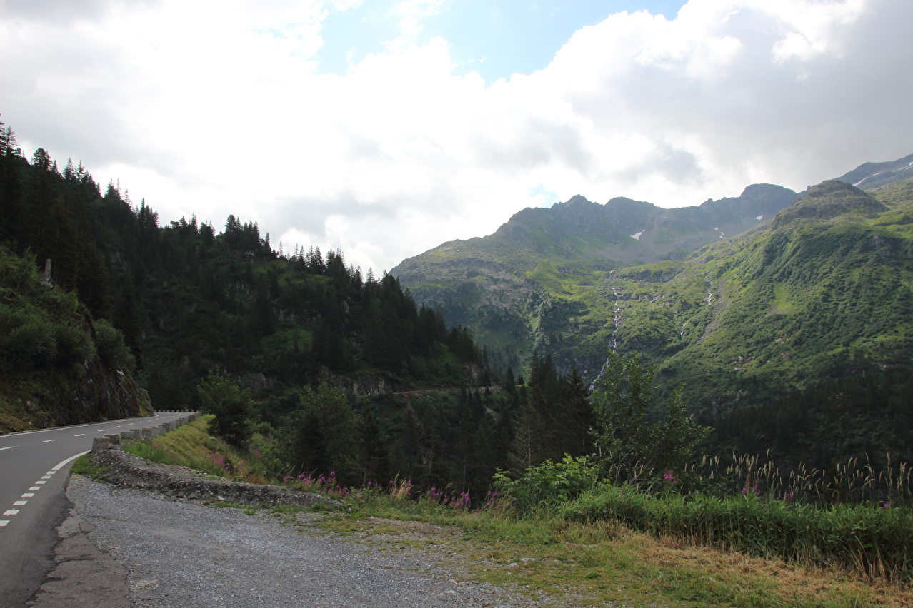 Blick über eine Kehre bergauf zur immer noch wolkenverhangenen Gadmerflue ![]() 300 dpi JPEG |