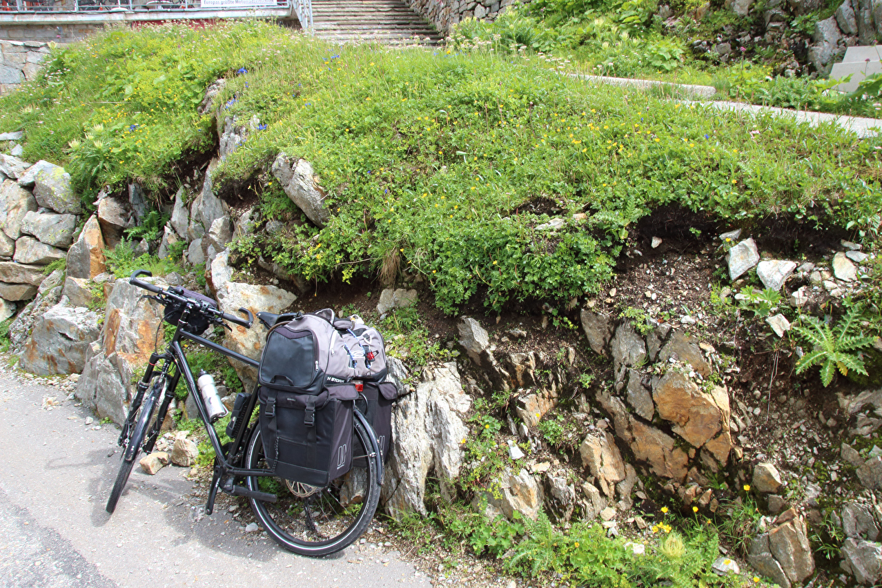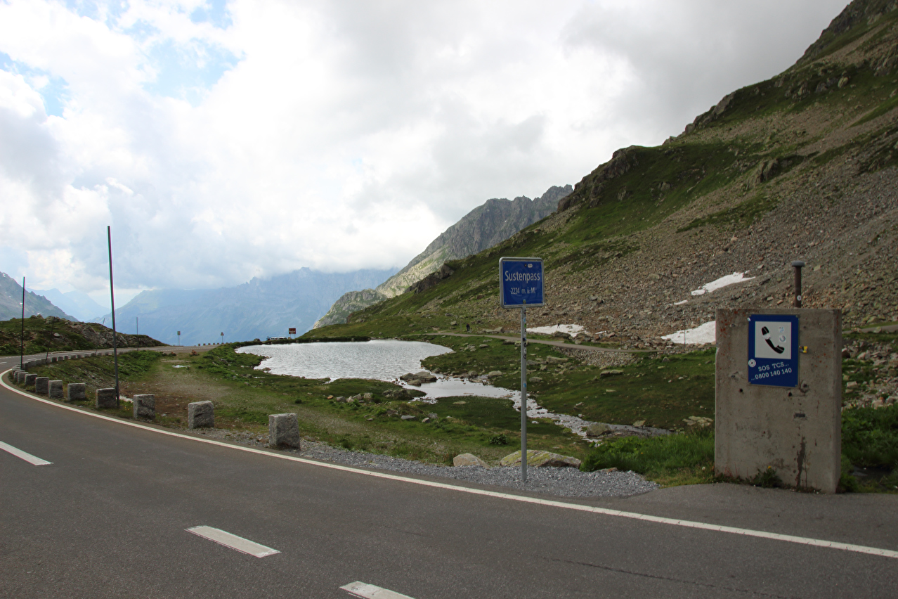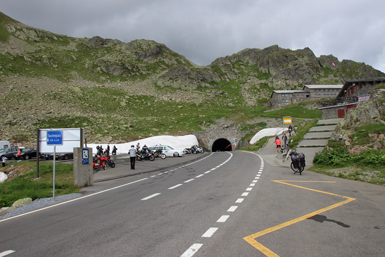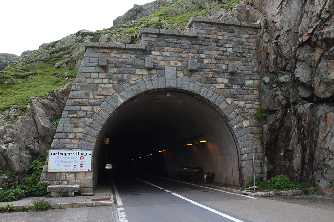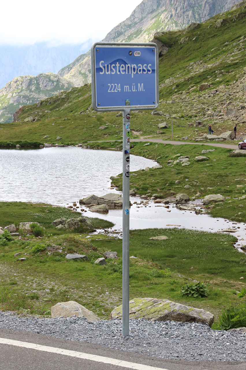 Beschreibung | Nachfolgend wird die Schreibweise "Straße" nur allgemein für Straßen verwendet. Wenn eine bestimmte Straße in der Schweiz genannt wird, wird die schweizerdeutsche Schreibweise "Strasse" verwendet. Diese Etappe war nicht nur die Königsetappe, sondern führte auch über das "Dach der Tour", den Sustenpass. Bei zunächst stark bewölktem Himmel ging es wenigstens trocken los. Regen blieb bei dieser Etappe aus, und die Sonne kam mehr und mehr durch die Wolken durch. Viele Berggipfel blieben aber wolkenverhangen. Die neue Sustenstrasse enthält auf der Westrampe einige Passagen, die gewöhnungsbedürftig dicht am Abgrund entlang führen. Die alte Sustenstrasse ist mittlerweile ein Wanderweg und bleibt somit Fußgängern vorbehalten. Die neue Sustenstrasse ist eine stark frequentierte Töffstrecke (Motorradstrecke), aber auch Rennvelofahrer waren einige unterwegs. In Steingletscher (BE) wurde Mittag gegessen. Oberhalb der Ortschaft bietet die Passtraße immer wieder extrem gute Sicht auf den Steingletscher, weshalb es von dieser Etappe auch etwas mehr Fotos gibt. Auf 2060 m ü. M. ist an der neuen Sustenstrasse ein Aussichtspunkt mit Blick auf den Steingletscher eingerichtet. An diesem Tag waren allerdings der oberste Teil des Steingletschers und die Berggipfel darüber von Wolken verdeckt. Der Steingletscher ist weniger stark vom durch die Erderwärmung verursachten Gletscherrückgang betroffen als die meisten anderen Gletscher in den Alpen. Dafür gibt es mehrere Gründe. Der Steingletscher liegt ziemlich weit nördlich in den Alpen und liegt hoch genug. Er liegt an einem Nordhang. Das umgebende Gelände liegt durchweg sehr hoch und enthält weitere Gletscher, im Süden grenzt der höchste Teil der Urner Alpen, der mit dem Dammastock bis auf 3630 m ü. M. aufsteigt, an den Steingletscher. Somit gibt es in der näheren Umgebung keine tief liegenden Täler, aus denen warme Luft zum Gletscher aufsteigen könnte. Der Sustenpass ist etwas seltsam. Die neue Sustenstrasse unterquert die geographische, auf 2304 m liegende Passhöhe, die auf der alten Sustenstrasse nur zu Fuß überquert werden kann, mit einem Scheiteltunnel. Der Kulminationspunkt der neuen Sustenstrasse liegt allerdings nicht im Scheiteltunnel, sondern im Freien direkt westlich des Westportals des Scheiteltunnels. Am Kulminationspunkt der neuen Sustenstrasse steht das Passhöhenschild. Dieser Bereich wird meist als Passhöhe des Sustenpasses bezeichnet. Im Scheiteltunnel fällt die Straße vom Westportal zum Ostportal ab. Somit bildet der Scheiteltunnel den obersten Teil der Ostrampe der neuen Sustenstrasse. Auch auf der Ostrampe enthält die neue Sustenstrasse vor allem im oberen Bereich einige Passagen, die doch sehr nah am Abgrund verlaufen. Zum Ende der Etappe mit der Einfahrt ins Reusstal hatte die Sonne endlich die Oberhand über die Wolken gewonnen. (BE) steht für "Kanton Bern" und dient hier der Unterscheidung der Ortschaft vom gleichnamigen Gletscher. |