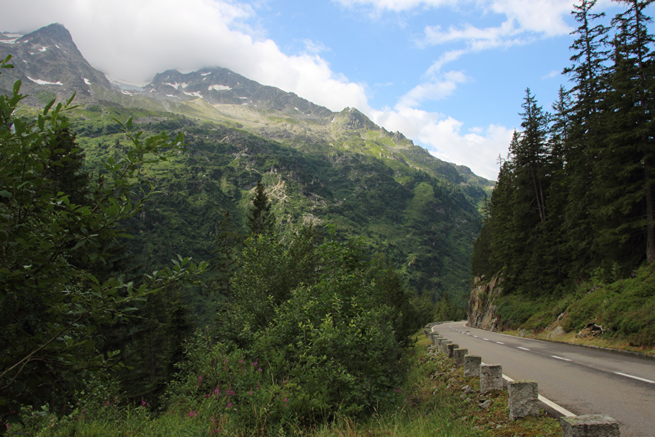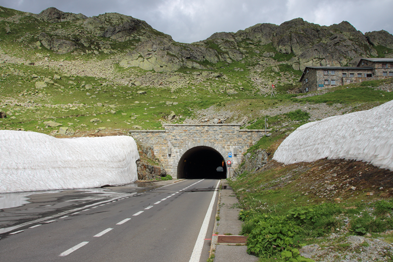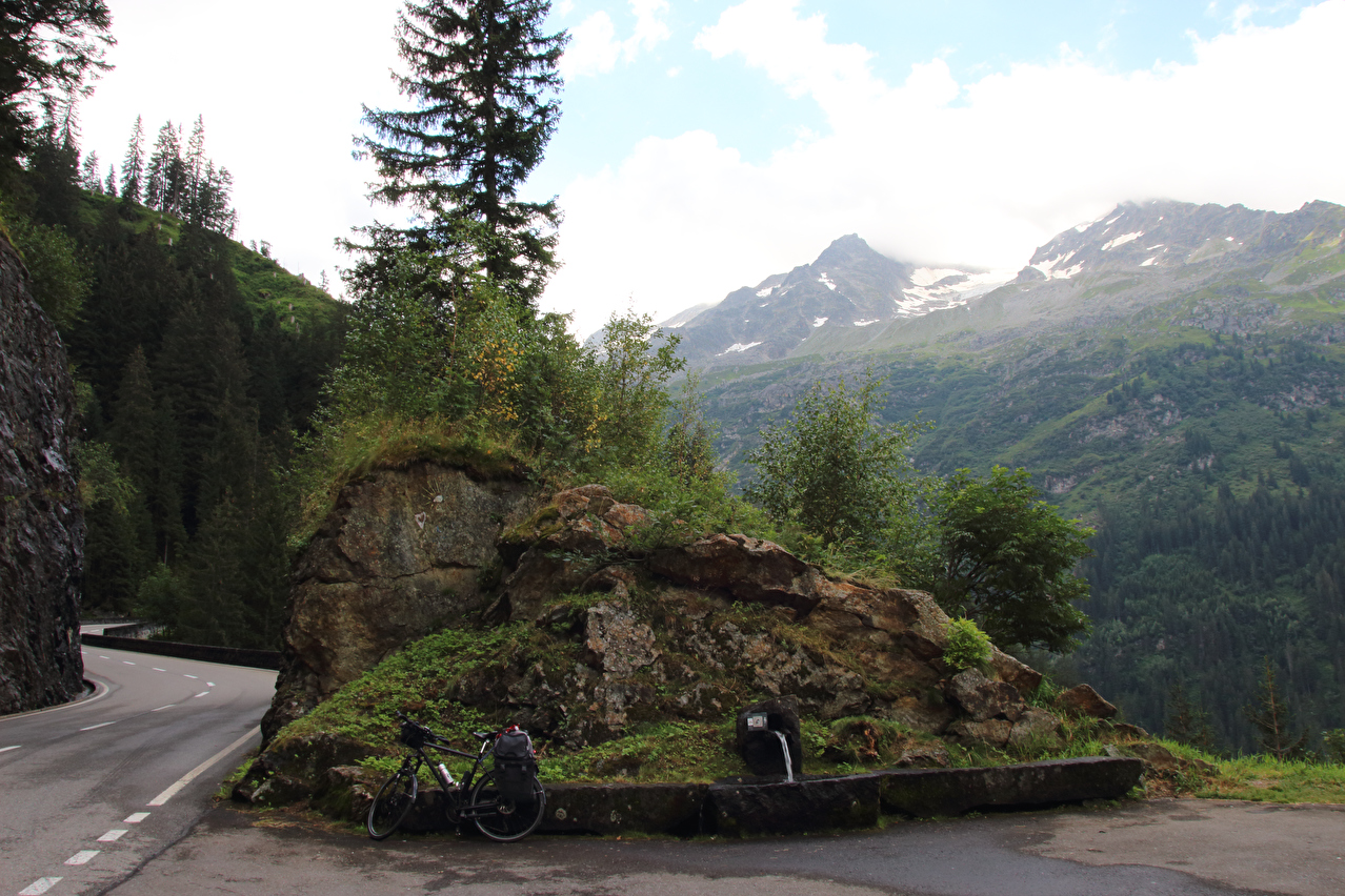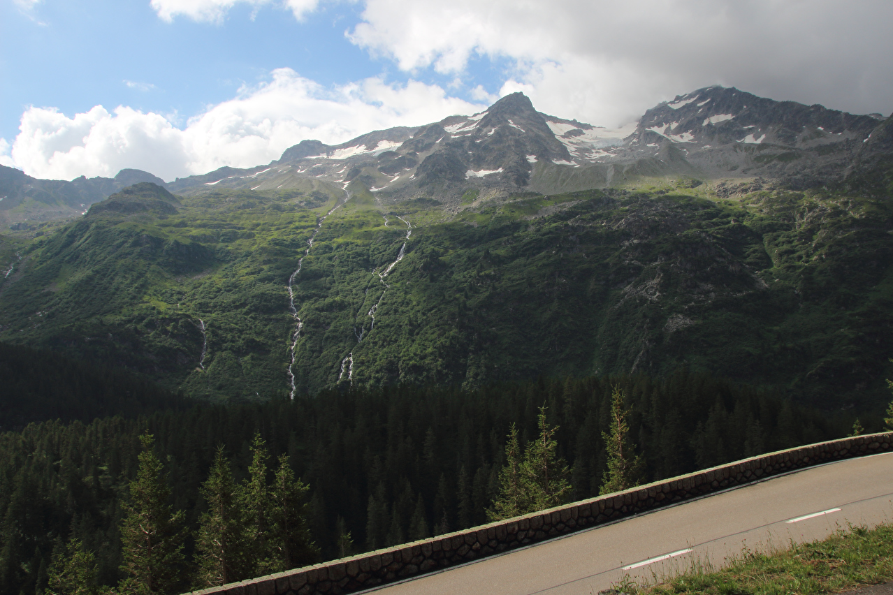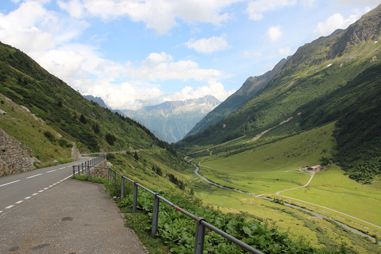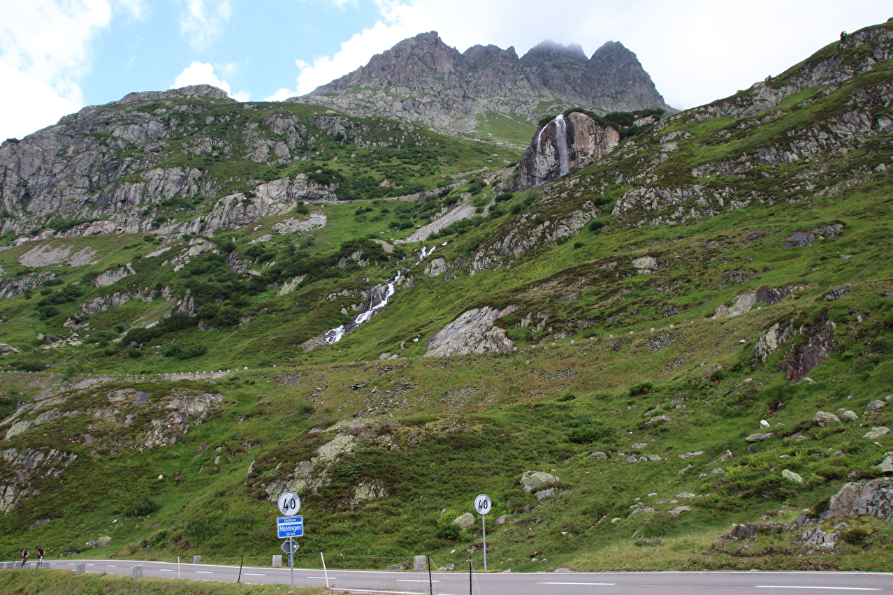 Beschreibung | Nachfolgend wird die Schreibweise "Straße" nur allgemein für Straßen verwendet. Wenn eine bestimmte Straße in der Schweiz genannt wird, wird die schweizerdeutsche Schreibweise "Strasse" verwendet. Diese Etappe war nicht nur die Königsetappe, sondern führte auch über das "Dach der Tour", den Sustenpass. Bei zunächst stark bewölktem Himmel ging es wenigstens trocken los. Regen blieb bei dieser Etappe aus, und die Sonne kam mehr und mehr durch die Wolken durch. Viele Berggipfel blieben aber wolkenverhangen. Die neue Sustenstrasse enthält auf der Westrampe einige Passagen, die gewöhnungsbedürftig dicht am Abgrund entlang führen. Die alte Sustenstrasse ist mittlerweile ein Wanderweg und bleibt somit Fußgängern vorbehalten. Die neue Sustenstrasse ist eine stark frequentierte Töffstrecke (Motorradstrecke), aber auch Rennvelofahrer waren einige unterwegs. In Steingletscher (BE) wurde Mittag gegessen. Oberhalb der Ortschaft bietet die Passtraße immer wieder extrem gute Sicht auf den Steingletscher, weshalb es von dieser Etappe auch etwas mehr Fotos gibt. Auf 2060 m ü. M. ist an der neuen Sustenstrasse ein Aussichtspunkt mit Blick auf den Steingletscher eingerichtet. An diesem Tag waren allerdings der oberste Teil des Steingletschers und die Berggipfel darüber von Wolken verdeckt. Der Steingletscher ist weniger stark vom durch die Erderwärmung verursachten Gletscherrückgang betroffen als die meisten anderen Gletscher in den Alpen. Dafür gibt es mehrere Gründe. Der Steingletscher liegt ziemlich weit nördlich in den Alpen und liegt hoch genug. Er liegt an einem Nordhang. Das umgebende Gelände liegt durchweg sehr hoch und enthält weitere Gletscher, im Süden grenzt der höchste Teil der Urner Alpen, der mit dem Dammastock bis auf 3630 m ü. M. aufsteigt, an den Steingletscher. Somit gibt es in der näheren Umgebung keine tief liegenden Täler, aus denen warme Luft zum Gletscher aufsteigen könnte. Der Sustenpass ist etwas seltsam. Die neue Sustenstrasse unterquert die geographische, auf 2304 m liegende Passhöhe, die auf der alten Sustenstrasse nur zu Fuß überquert werden kann, mit einem Scheiteltunnel. Der Kulminationspunkt der neuen Sustenstrasse liegt allerdings nicht im Scheiteltunnel, sondern im Freien direkt westlich des Westportals des Scheiteltunnels. Am Kulminationspunkt der neuen Sustenstrasse steht das Passhöhenschild. Dieser Bereich wird meist als Passhöhe des Sustenpasses bezeichnet. Im Scheiteltunnel fällt die Straße vom Westportal zum Ostportal ab. Somit bildet der Scheiteltunnel den obersten Teil der Ostrampe der neuen Sustenstrasse. Auch auf der Ostrampe enthält die neue Sustenstrasse vor allem im oberen Bereich einige Passagen, die doch sehr nah am Abgrund verlaufen. Zum Ende der Etappe mit der Einfahrt ins Reusstal hatte die Sonne endlich die Oberhand über die Wolken gewonnen. (BE) steht für "Kanton Bern" und dient hier der Unterscheidung der Ortschaft vom gleichnamigen Gletscher. |