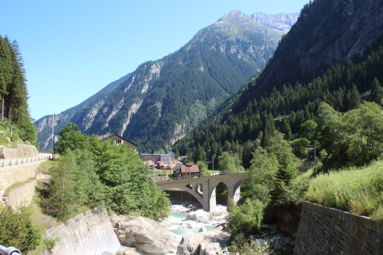 Brücke der Gotthardstrasse über die Göschener Reuss, Blick zu den höchsten Bergen der Urner Alpen ![]() 300 dpi JPEG |