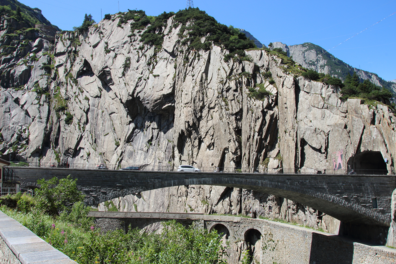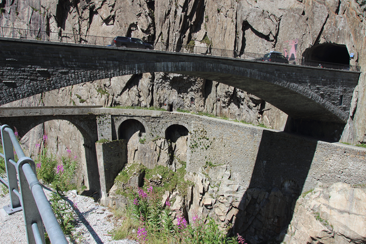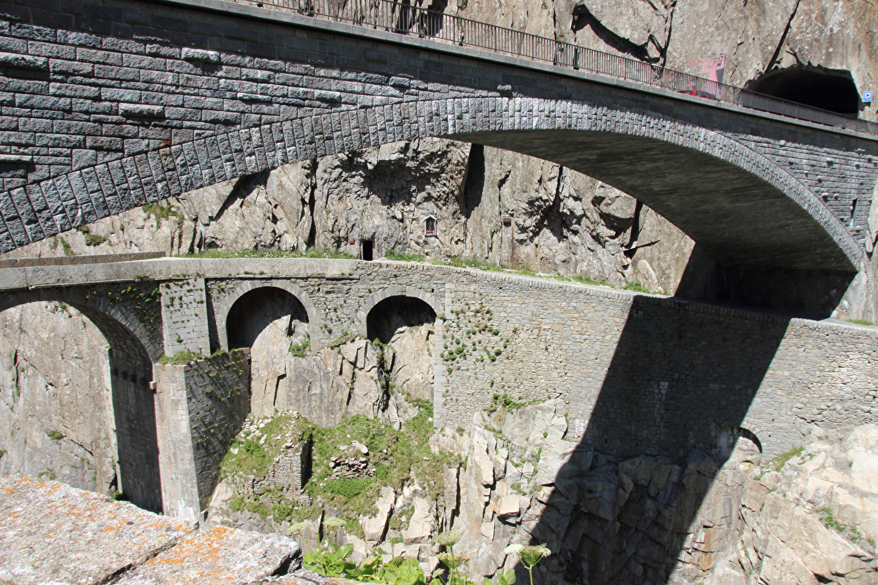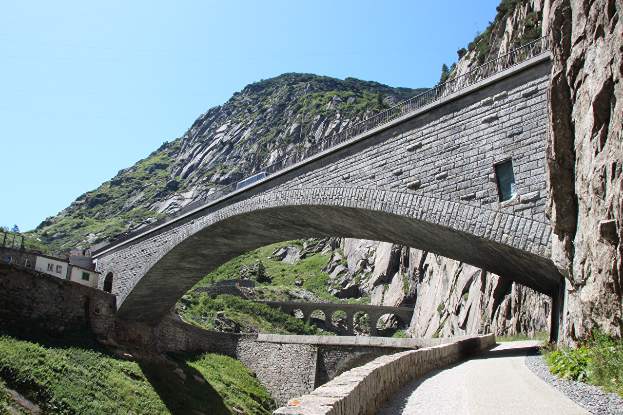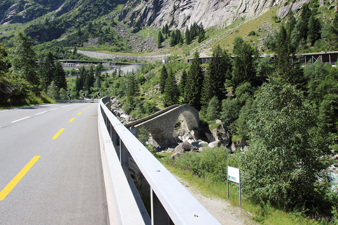 Veloroute über die zweite Teufelsbrücke, darüber die dritte Teufelsbrücke für den Stinkeverkehr, dahinter die Brücke der Schöllenenbahn ![]() 300 dpi JPEG |
