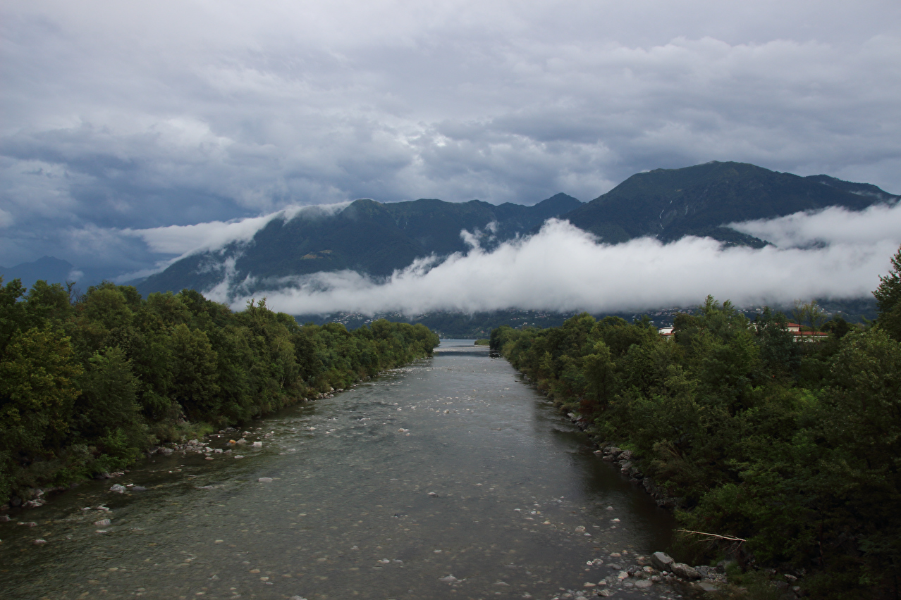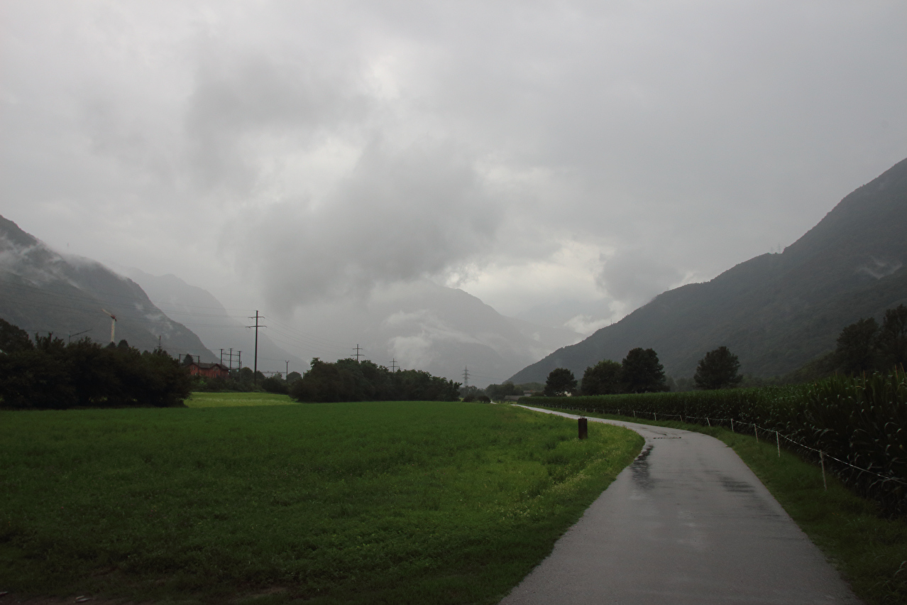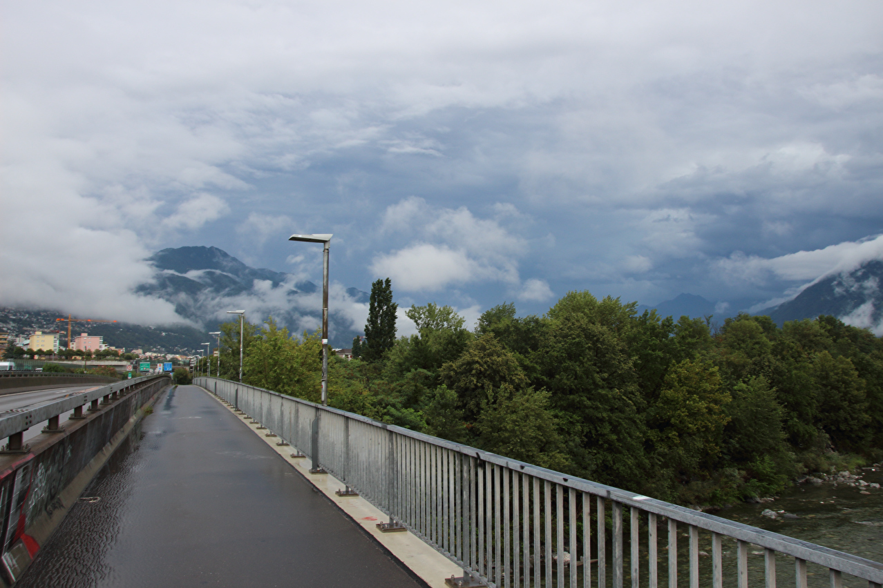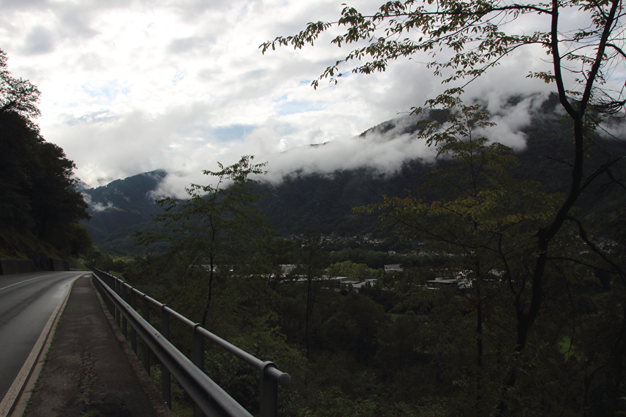 Beschreibung | Wasserschlacht, Tag zwei! ☹ Wegen der Wärme wurde nur die Regenjacke übergezogen, der Rest wurde nass, und zwar richtig. Bergpanorama gab es natürlich auch keines. Nach der etwas unübersichtlichen Ausfahrt aus Biasca wurde in Lodrino auf eine Veloroute gewechselt. Die enthielt zwar einige Abschnitte mit " wassergebundenem Belag", der bei dem Dauerregen entsprechend weich und matschig war, sowie einen Abschnitt mit Kopfsteinpflaster im mittelalterlich wirkenden Ortskern von Moleno mit sich. Dafür ersparte die Veloroute vom Stinkeverkehr verteiltes Spritzwasser und aufgewirbelte Gischt. War das "Dach der Tour", also der orographisch höchste Punkt der Tour bereits mit dem Sustenpass passiert worden, wurde nun mit dem Nordufer des Lago Maggiore in Locarno der "Keller der Tour", also der orographisch tiefste Punkt der Tour erreicht. Und dieser Tiefpunkt war wetterbedingt nicht nur orographischer Natur. Vom Lago Maggiore war nur das ufernahe Wasser zu sehen, darüber lag ein graues Nichts. Zwischen Locarno und Ascona hörte der Regen endlich auf, aber für eine Rückfahrt zum Seeufer hätte die Zeit nicht gereicht, da es bis zum Etappenziel noch etwas hin war und kurz davor noch ein kurzer, aber knackiger Schlussanstieg lag. Die Chinesische Hanfpalme (Trachycarpus fortunei) ist aus den Gärten heraus mittlerweile verwildert, worüber die Schweizer offiziell nicht glücklich sind. Deshalb steht die auch "Tessinerpalme" gennante Pflanze in der Schweiz mittlerweile auf der Schwarzen Liste invasiver Neophyten. Optisch trägt sie jedoch schon zum mediterranen Charakter der tief gelegenen Regionen des Tessins bei. Das Centovalli weist direkt unterhalb von Intragna eine markante Talstufe auf. Der Teil des Centovalli unterhalb dieser Talstufe wird auch Pedemonte genannt. Die Straße von Golino nach Intragna war ab der unteren Kehre mit bis zu 15 % Steigung zu steil zum Fahren. Somit wurden die letzten paar hundert Meter zum Etappenziel schiebend zurück gelegt. In Intragna erfolgte die dritte Bergankunft dieser Tour. |