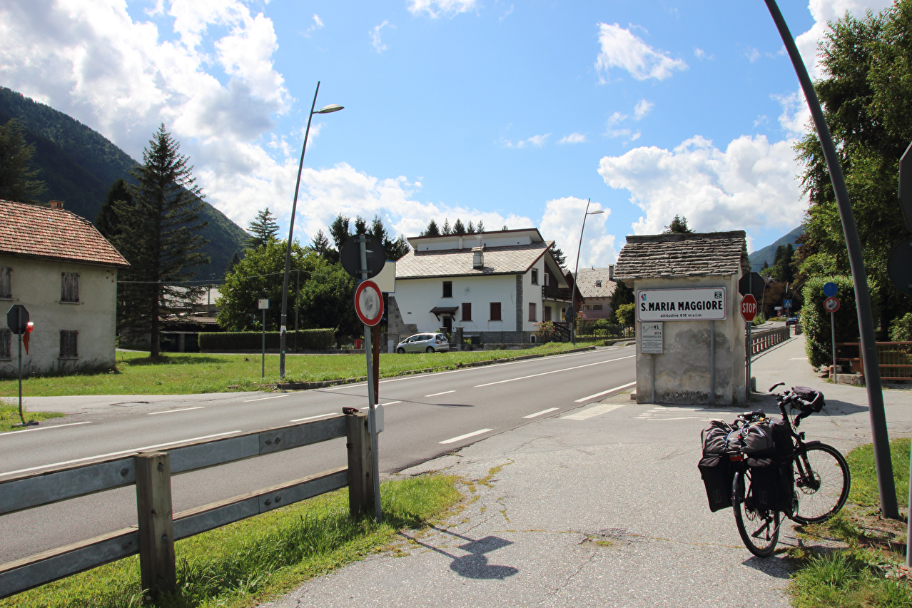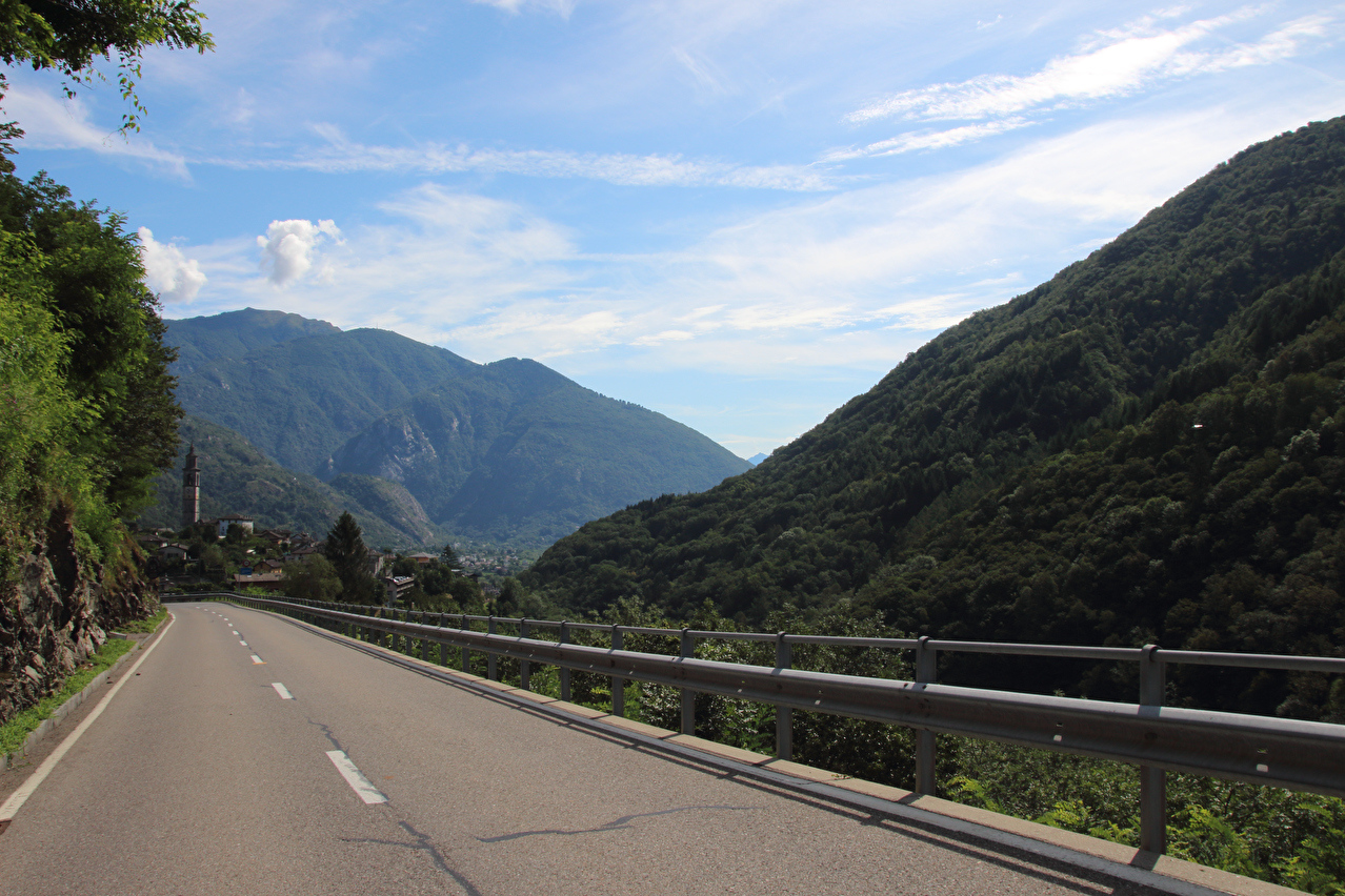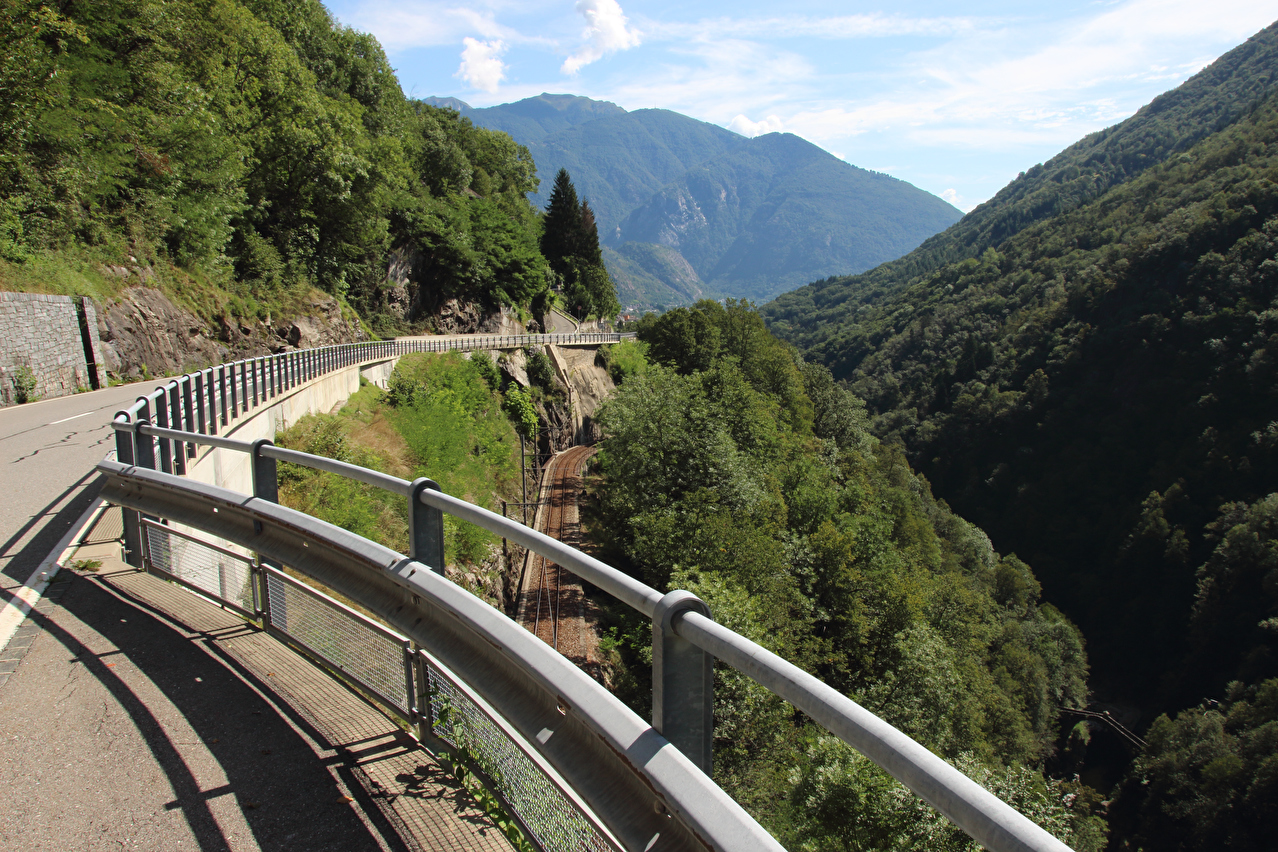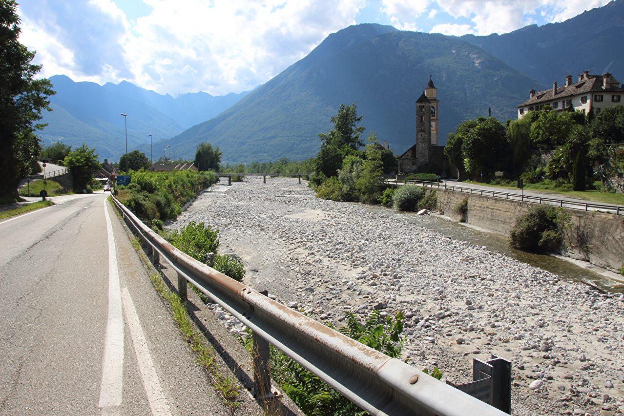 Beschreibung | Anders als an den beiden Vortagen war es sehr sonnig und in der tiefen Lage auf der Alpensüdseite erwartungsgemäß sehr warm. Gleich am Anfang der Etappe lag in Intragna eine steile Rampe auf dem Weg, die geschoben wurde. Die bis zur Ponte di Pioda im Südhang verlaufende Straße ist aufgrund ihrer Lage sonennexponiert. Da das Tal im unteren Bereich aber nahezu komplett bewaldet ist, warf der eine oder andere Baum seinen Schatten auf die Straße. Die Straße von Intragna verläuft, obwohl es nominell nur bergauf geht, bis Malesco recht wellig. Dafür kommt sie mit wenigen Kunstbauten aus. Neben den unvermeidlichen Brücken über Seitentäler gibt es nur einen kurzen Tunnel zwischen Ribellasca und der Ponte di Pioda, dem einzigen größeren Kunstbau. Diese Brücke, die den Melezzo orientale in einem weiten Bogen zweimal überquert, ist jüngeren Datums. Am unteren Ende der Brücke lässt der gesperrte Rest der alten aufgegebenen Straße erahnen, dass diese wie der Rest der Straße ab Intragna hier ursprünglich im Südhang verlief und den Fluss in diesem Bereich nicht überquerte. Die erste Flussüberquerung zur Anbindung einer Ortschaft erfolgt bei Malesco, das der tiefstgelegene Ort auf dem Talboden des Valle Vigezzo ist. Talabwärts liegen alle Ortschaften bis Intragna in den Hängen, da das Tal in diesem Bereich tief eingeschnitten und entsprechend eng ist. Die meterspurige Bahntrasse, die ohne Zahnstangen auskommt, also als reine Adhäsionsbahn betrieben wird, verläuft mal unterhalb und mal oberhalb der Straße mit vielen Kunstbauten in Form von Tunneln, Brücken und Viadukten. Die Grenze zwischen der Schweiz und Italien, an der es auf beiden Seiten an der Straße zumindest keine offensichtlichen Grenzkontrollen mehr gibt, bringt mehrere Namenswechsel mit. Das Tal selbst heißt in der Schweiz Centovalli, in Italien Valle Vigezzo. Der Fluss durch das Tal heißt in der Schweiz Melezza, in Italien Melezzo orientale. Die zwischen Locarno und Domodossola verkehrende Eisenbahn wird in der Schweiz Centovallina genannt, in Italien Vigezzina. Unterhalb von Re fiel der Blick von der Straße auf die "Basilica della Beata Vergine Maria del Sangue di Re", die aus einem eher unscheinbaren älteren Teil, erbaut von 1606 bis 1628, und einen sehr auffälligen neueren Teil, erbaut von 1922 bis 1958 besteht. Der sehr massige, im neobyzantinischen Stil gestaltete Baukörper des neueren Teils mag sich nicht so recht in das Orts- uind Landschaftsbild einfügen. In Re wurde Mittag gegessen. Oberhalb von Re wird das Valle Vigezzo allmählich weiter und der Melezzo orientale schneidet sich nicht mehr so tief ein. Von Malesco bis Druogno verlief die Fahrt fast nur durch besiedeltes Gebiet, da Malesco, Santa Maria Maggiore und Druogno fast nahtlos ineinander übergehen. Durch Druogno verläuft die Talwasserscheide, die die Einzugsgebiete von Melezzo orientale (Schweiz: Melezza) und Melezzo occidentale trennt. Zwischen Druogno und Masera weist die Straße eine im Mittel deutlich größere Neigung auf als zwischen Intragna und Druogno. Die Straße fällt von Druogno bis Masera durchgängig ab, weist also keine Gegensteigungen auf. Die wenigen Ortschaften zwischen Druogno und Masera liegen im Hang abseits der Straße. Das Valle Vigezzo, das hier vom Melezzo occidentale durchflossen wird, wird nach Masera hin sehr eng. Die mehr oder weniger auf dem Talboden verlaufende Straße benötigt daher recht viele Kunstbauten, darunter mehrere Tunnel. Das nahezu vollständig mit Laubwald bestandene Tal (Centovalli → Valle Vigezzo), die wenigen Ausblicke auf hohe Berge, das wellige Streckenprofil bis Malesco und die geringe erreichte Höhe vermittelten den voralpinen Charakter dieser Etappe bis Domodossola. Mit der Einfahrt ins Val Divedro bei Crevoladossola wurde für den Rest der Tour Generalkurs Nordwest eingeschlagen. Damit einhergehend änderte sich das Landschaftsbild deutlich. Mediterrane und voralpine Landschaften gehörten nun der Vergangenheit an. Bereits im untersten Bereich wirkt das Val Divedro alpin und bot einen ersten Vorgeschmack auf die daran anschließende Gondoschlucht. Ganz am Ende der Etappe lag noch eine steile Rampe unmittelbar vor der vierten Bergankunft dieser Tour in Varzo. Was sich unterwegs schon angedeutet hatte, wurde im Hotel in Varzo zur Gewissheit. Der Fahrradcomputer hatte die beiden vorhergegangenen Regenetappen nicht schadlos überstanden. Daher fehlen ab dieser Etappe bis zum Ende der Alpentour die Angaben zu Fahrzeit, Schnitt und Spitze. |