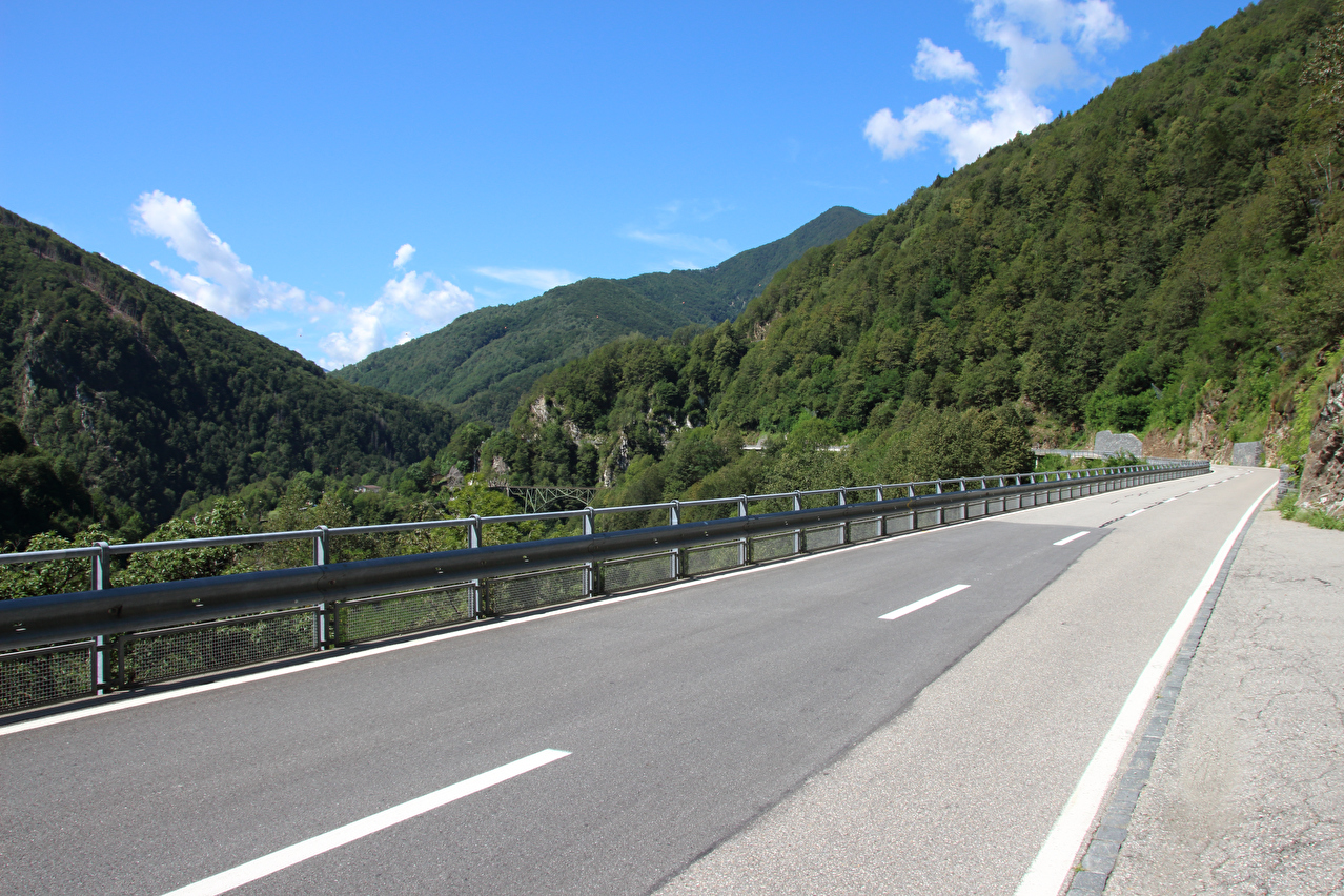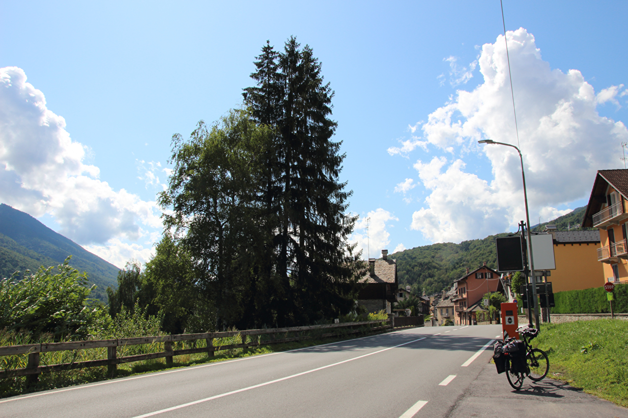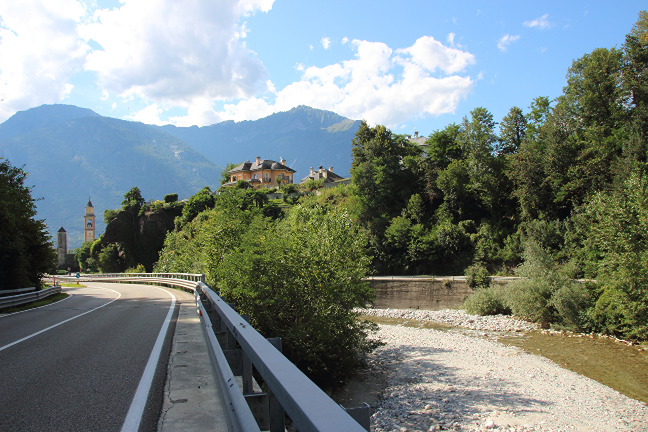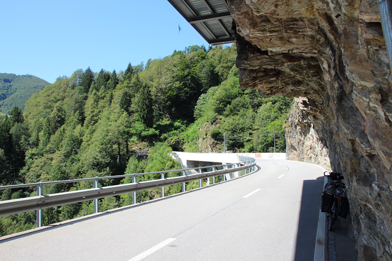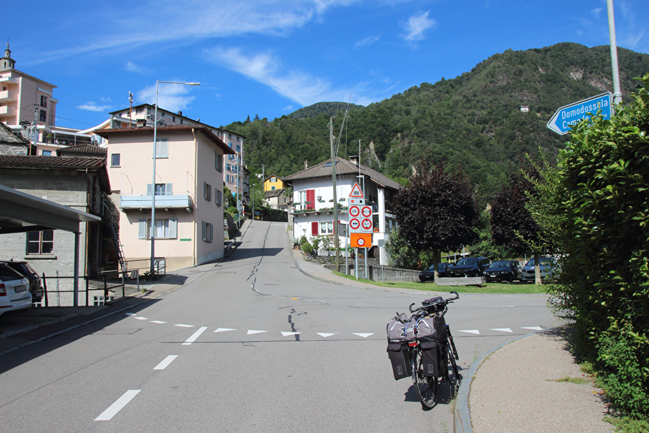 Beschreibung | Anders als an den beiden Vortagen war es sehr sonnig und in der tiefen Lage auf der Alpensüdseite erwartungsgemäß sehr warm. Gleich am Anfang der Etappe lag in Intragna eine steile Rampe auf dem Weg, die geschoben wurde. Die bis zur Ponte di Pioda im Südhang verlaufende Straße ist aufgrund ihrer Lage sonennexponiert. Da das Tal im unteren Bereich aber nahezu komplett bewaldet ist, warf der eine oder andere Baum seinen Schatten auf die Straße. Die Straße von Intragna verläuft, obwohl es nominell nur bergauf geht, bis Malesco recht wellig. Dafür kommt sie mit wenigen Kunstbauten aus. Neben den unvermeidlichen Brücken über Seitentäler gibt es nur einen kurzen Tunnel zwischen Ribellasca und der Ponte di Pioda, dem einzigen größeren Kunstbau. Diese Brücke, die den Melezzo orientale in einem weiten Bogen zweimal überquert, ist jüngeren Datums. Am unteren Ende der Brücke lässt der gesperrte Rest der alten aufgegebenen Straße erahnen, dass diese wie der Rest der Straße ab Intragna hier ursprünglich im Südhang verlief und den Fluss in diesem Bereich nicht überquerte. Die erste Flussüberquerung zur Anbindung einer Ortschaft erfolgt bei Malesco, das der tiefstgelegene Ort auf dem Talboden des Valle Vigezzo ist. Talabwärts liegen alle Ortschaften bis Intragna in den Hängen, da das Tal in diesem Bereich tief eingeschnitten und entsprechend eng ist. Die meterspurige Bahntrasse, die ohne Zahnstangen auskommt, also als reine Adhäsionsbahn betrieben wird, verläuft mal unterhalb und mal oberhalb der Straße mit vielen Kunstbauten in Form von Tunneln, Brücken und Viadukten. Die Grenze zwischen der Schweiz und Italien, an der es auf beiden Seiten an der Straße zumindest keine offensichtlichen Grenzkontrollen mehr gibt, bringt mehrere Namenswechsel mit. Das Tal selbst heißt in der Schweiz Centovalli, in Italien Valle Vigezzo. Der Fluss durch das Tal heißt in der Schweiz Melezza, in Italien Melezzo orientale. Die zwischen Locarno und Domodossola verkehrende Eisenbahn wird in der Schweiz Centovallina genannt, in Italien Vigezzina. Unterhalb von Re fiel der Blick von der Straße auf die "Basilica della Beata Vergine Maria del Sangue di Re", die aus einem eher unscheinbaren älteren Teil, erbaut von 1606 bis 1628, und einen sehr auffälligen neueren Teil, erbaut von 1922 bis 1958 besteht. Der sehr massige, im neobyzantinischen Stil gestaltete Baukörper des neueren Teils mag sich nicht so recht in das Orts- uind Landschaftsbild einfügen. In Re wurde Mittag gegessen. Oberhalb von Re wird das Valle Vigezzo allmählich weiter und der Melezzo orientale schneidet sich nicht mehr so tief ein. Von Malesco bis Druogno verlief die Fahrt fast nur durch besiedeltes Gebiet, da Malesco, Santa Maria Maggiore und Druogno fast nahtlos ineinander übergehen. Durch Druogno verläuft die Talwasserscheide, die die Einzugsgebiete von Melezzo orientale (Schweiz: Melezza) und Melezzo occidentale trennt. Zwischen Druogno und Masera weist die Straße eine im Mittel deutlich größere Neigung auf als zwischen Intragna und Druogno. Die Straße fällt von Druogno bis Masera durchgängig ab, weist also keine Gegensteigungen auf. Die wenigen Ortschaften zwischen Druogno und Masera liegen im Hang abseits der Straße. Das Valle Vigezzo, das hier vom Melezzo occidentale durchflossen wird, wird nach Masera hin sehr eng. Die mehr oder weniger auf dem Talboden verlaufende Straße benötigt daher recht viele Kunstbauten, darunter mehrere Tunnel. Das nahezu vollständig mit Laubwald bestandene Tal (Centovalli → Valle Vigezzo), die wenigen Ausblicke auf hohe Berge, das wellige Streckenprofil bis Malesco und die geringe erreichte Höhe vermittelten den voralpinen Charakter dieser Etappe bis Domodossola. Mit der Einfahrt ins Val Divedro bei Crevoladossola wurde für den Rest der Tour Generalkurs Nordwest eingeschlagen. Damit einhergehend änderte sich das Landschaftsbild deutlich. Mediterrane und voralpine Landschaften gehörten nun der Vergangenheit an. Bereits im untersten Bereich wirkt das Val Divedro alpin und bot einen ersten Vorgeschmack auf die daran anschließende Gondoschlucht. Ganz am Ende der Etappe lag noch eine steile Rampe unmittelbar vor der vierten Bergankunft dieser Tour in Varzo. Was sich unterwegs schon angedeutet hatte, wurde im Hotel in Varzo zur Gewissheit. Der Fahrradcomputer hatte die beiden vorhergegangenen Regenetappen nicht schadlos überstanden. Daher fehlen ab dieser Etappe bis zum Ende der Alpentour die Angaben zu Fahrzeit, Schnitt und Spitze. |