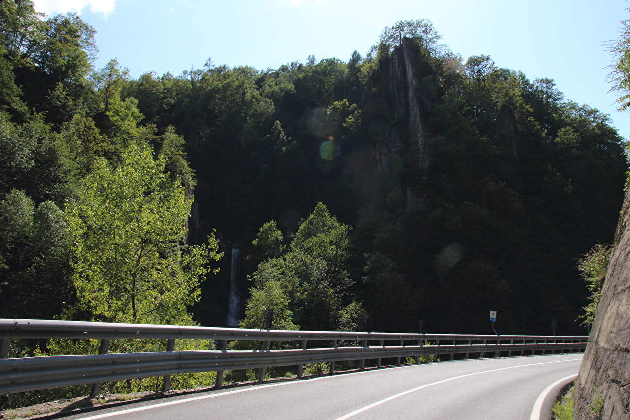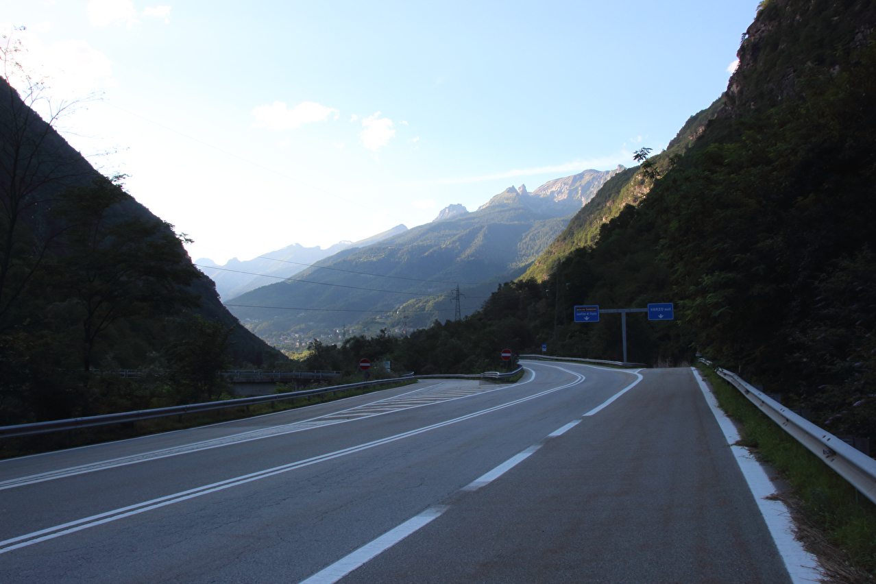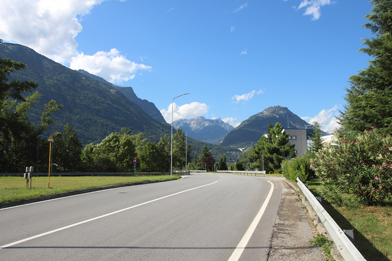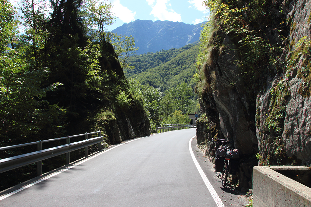 Beschreibung | Anders als an den beiden Vortagen war es sehr sonnig und in der tiefen Lage auf der Alpensüdseite erwartungsgemäß sehr warm. Gleich am Anfang der Etappe lag in Intragna eine steile Rampe auf dem Weg, die geschoben wurde. Die bis zur Ponte di Pioda im Südhang verlaufende Straße ist aufgrund ihrer Lage sonennexponiert. Da das Tal im unteren Bereich aber nahezu komplett bewaldet ist, warf der eine oder andere Baum seinen Schatten auf die Straße. Die Straße von Intragna verläuft, obwohl es nominell nur bergauf geht, bis Malesco recht wellig. Dafür kommt sie mit wenigen Kunstbauten aus. Neben den unvermeidlichen Brücken über Seitentäler gibt es nur einen kurzen Tunnel zwischen Ribellasca und der Ponte di Pioda, dem einzigen größeren Kunstbau. Diese Brücke, die den Melezzo orientale in einem weiten Bogen zweimal überquert, ist jüngeren Datums. Am unteren Ende der Brücke lässt der gesperrte Rest der alten aufgegebenen Straße erahnen, dass diese wie der Rest der Straße ab Intragna hier ursprünglich im Südhang verlief und den Fluss in diesem Bereich nicht überquerte. Die erste Flussüberquerung zur Anbindung einer Ortschaft erfolgt bei Malesco, das der tiefstgelegene Ort auf dem Talboden des Valle Vigezzo ist. Talabwärts liegen alle Ortschaften bis Intragna in den Hängen, da das Tal in diesem Bereich tief eingeschnitten und entsprechend eng ist. Die meterspurige Bahntrasse, die ohne Zahnstangen auskommt, also als reine Adhäsionsbahn betrieben wird, verläuft mal unterhalb und mal oberhalb der Straße mit vielen Kunstbauten in Form von Tunneln, Brücken und Viadukten. Die Grenze zwischen der Schweiz und Italien, an der es auf beiden Seiten an der Straße zumindest keine offensichtlichen Grenzkontrollen mehr gibt, bringt mehrere Namenswechsel mit. Das Tal selbst heißt in der Schweiz Centovalli, in Italien Valle Vigezzo. Der Fluss durch das Tal heißt in der Schweiz Melezza, in Italien Melezzo orientale. Die zwischen Locarno und Domodossola verkehrende Eisenbahn wird in der Schweiz Centovallina genannt, in Italien Vigezzina. Unterhalb von Re fiel der Blick von der Straße auf die "Basilica della Beata Vergine Maria del Sangue di Re", die aus einem eher unscheinbaren älteren Teil, erbaut von 1606 bis 1628, und einen sehr auffälligen neueren Teil, erbaut von 1922 bis 1958 besteht. Der sehr massige, im neobyzantinischen Stil gestaltete Baukörper des neueren Teils mag sich nicht so recht in das Orts- uind Landschaftsbild einfügen. In Re wurde Mittag gegessen. Oberhalb von Re wird das Valle Vigezzo allmählich weiter und der Melezzo orientale schneidet sich nicht mehr so tief ein. Von Malesco bis Druogno verlief die Fahrt fast nur durch besiedeltes Gebiet, da Malesco, Santa Maria Maggiore und Druogno fast nahtlos ineinander übergehen. Durch Druogno verläuft die Talwasserscheide, die die Einzugsgebiete von Melezzo orientale (Schweiz: Melezza) und Melezzo occidentale trennt. Zwischen Druogno und Masera weist die Straße eine im Mittel deutlich größere Neigung auf als zwischen Intragna und Druogno. Die Straße fällt von Druogno bis Masera durchgängig ab, weist also keine Gegensteigungen auf. Die wenigen Ortschaften zwischen Druogno und Masera liegen im Hang abseits der Straße. Das Valle Vigezzo, das hier vom Melezzo occidentale durchflossen wird, wird nach Masera hin sehr eng. Die mehr oder weniger auf dem Talboden verlaufende Straße benötigt daher recht viele Kunstbauten, darunter mehrere Tunnel. Das nahezu vollständig mit Laubwald bestandene Tal (Centovalli → Valle Vigezzo), die wenigen Ausblicke auf hohe Berge, das wellige Streckenprofil bis Malesco und die geringe erreichte Höhe vermittelten den voralpinen Charakter dieser Etappe bis Domodossola. Mit der Einfahrt ins Val Divedro bei Crevoladossola wurde für den Rest der Tour Generalkurs Nordwest eingeschlagen. Damit einhergehend änderte sich das Landschaftsbild deutlich. Mediterrane und voralpine Landschaften gehörten nun der Vergangenheit an. Bereits im untersten Bereich wirkt das Val Divedro alpin und bot einen ersten Vorgeschmack auf die daran anschließende Gondoschlucht. Ganz am Ende der Etappe lag noch eine steile Rampe unmittelbar vor der vierten Bergankunft dieser Tour in Varzo. Was sich unterwegs schon angedeutet hatte, wurde im Hotel in Varzo zur Gewissheit. Der Fahrradcomputer hatte die beiden vorhergegangenen Regenetappen nicht schadlos überstanden. Daher fehlen ab dieser Etappe bis zum Ende der Alpentour die Angaben zu Fahrzeit, Schnitt und Spitze. |