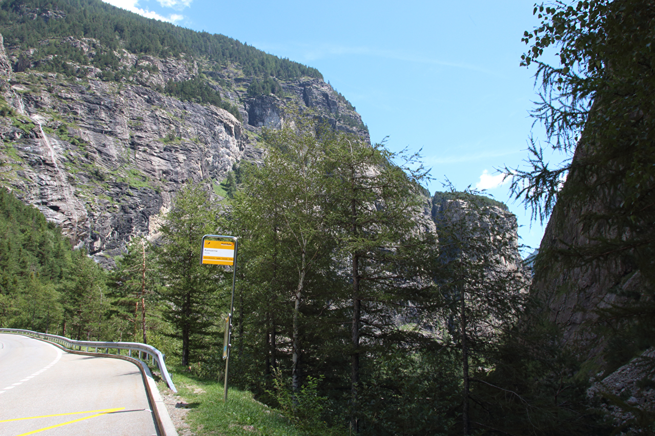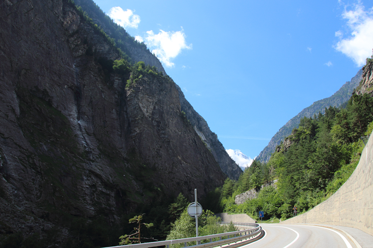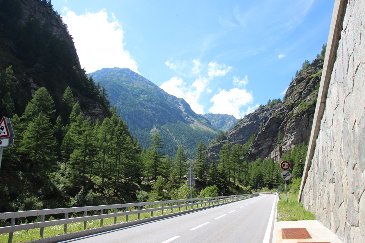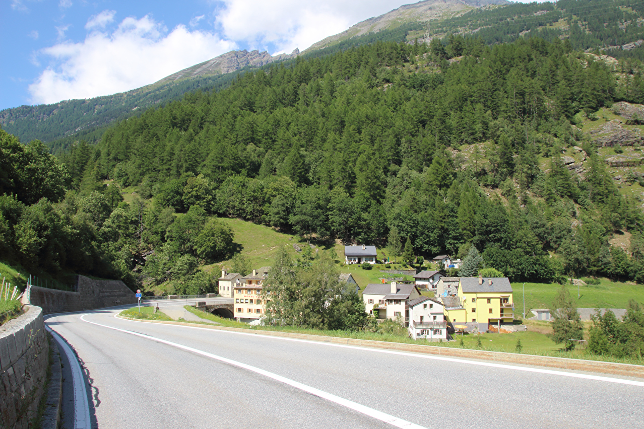 Beschreibung | Nach der recht langen Etappe am Vortag stand mit dieser Etappe eine kurze Etappe an, die aber reichlich Höhenmeter bergauf enthielt. Die Sonne schien den ganzen Tag über weitgehend ungestört von Wolken. Durch den Höhengewinn verlief diese Etappe aber nicht in einer Wärme wie die Etappe am Vortag. Das Val Divedro ist schon über seine ganze Länge recht eng, da sich die Diveria tief eingeschnitten hat. An den wenigen etwas weiteren Stellen liegen Ortschaften auf dem Talboden. Die sich bergwärts an das Val Divedro anschließende Gondoschlucht zwischen den Ortschaften Gondo am unteren Ende und Gabi am oberen Ende ist so eng, dass dort nur der Fluss, die Straße mit diversen Kunstbauten und der Stockalperweg, ein alter Saumpfad, heute Wanderweg, Platz finden. Ramserna ist keine Ortschaft, sondern nicht mehr als eine Postautohaltestelle etwa mittig zwischen zwei Kehren. Oberhalb von Gabi weitet sich das hier Chastelberg genannte Tal deutlich auf. Der durch das Tal fließende Fluss hat gleich drei Namen. In Italien heißt er Diveria, in der Schweiz von Gabi bis zur Grenze Doveria und oberhalb von Gabi Chrummbach. Der Namenswechsel in der Schweiz beruht darauf, dass zwischen Gabi und Gstein die inoffizielle Sprachgrenze zwischen italienisch und deutsch liegt. Italienisch ist zwar eine der Amtssprachen in der Schweiz, aber keine Amtssprache auf kantonaler Ebene im Kanton Wallis. Anders als an der Grenze zwischen Camedo (Schweiz) und Ribellasca (Italien), die am Vortag passiert worden war, sind hier auf beiden Seiten die Grenzkontrollstellen in Betrieb. In Italien gibt es deren zwei. Die Grenzkontrollstelle direkt an der Grenze in Paglino wurde aufgegeben, dafür wurde eine Grenzkontrollstelle im talabwärts gelegenen Iselle eingerichtet. Zwischen Iselle und Gondo vermittelte die Fahrt zwischen den beiden in Betrieb befindlichen Grenzkontrollstellen einen Hauch von Niemandsland. Daran schloss sich die Durchquerung der Gondoschlucht an. Im Bereich des in die Doveria einmündenden Alpjerbachs ist von einer Galerie kurz vor dem Übergang in einen Tunnel zu sehen, dass hier der Straßenverlauf mal geändert wurde. In früheren Zeiten wurden Straßentunnel so kurz wie möglich gebaut und dafür der Bau zusätzlicher Brücken sowie ein kurviger Straßenverlauf mit teilweise steinschlaggefährdeten Bereichen in Kauf genommen. In jüngerer Zeit werden an solchen Stellen oft längere Tunnel mit geraderem Straßenverlauf gebaut, wodurch Brücken eingespart werden. Auch wird die Straße dadurch wintersicherer und weniger durch Steinschlag gefährdet, wobei dies auch auf der alten Straße durch Galerien hätte erreicht werden können. Nachteilig an den neuen Tunneln sind die längeren Fahrzeiten im Tunnel und die durch den geraderen Streckenverlauf höheren möglichen und auch viel zu oft ausgenutzten Geschwindigkeiten des Stinkeverkehrs. Mit der Ausfahrt aus der Hofstättengalerie, der letzten Galerie im Verlauf dieser Etappe wurde alpines Gelände erreicht. Die Abfahrt von der Neuen Simplonstrasse auf die Alte Simplonstrasse gestaltete sich baustellenbedingt etwas unübersichtlich. In Simplon-Dorf erfolgte die fünfte und letzte Bergankunft dieser Tour. Der Versuch, den Fahrradcomputer zu reaktivieren, indem dieser "unten offen", also ohne Batterie und Batteriefachdeckel während der Etappe am Lenker befestigt und somit Luft und Sonne ausgesetzt war, scheiterte. Durchgetrocknet war er sicherlich, aber im Hotel lies sich der Fahrradcomputer nach dem Wiedereinsetzen der Batterie nicht reaktivieren. |