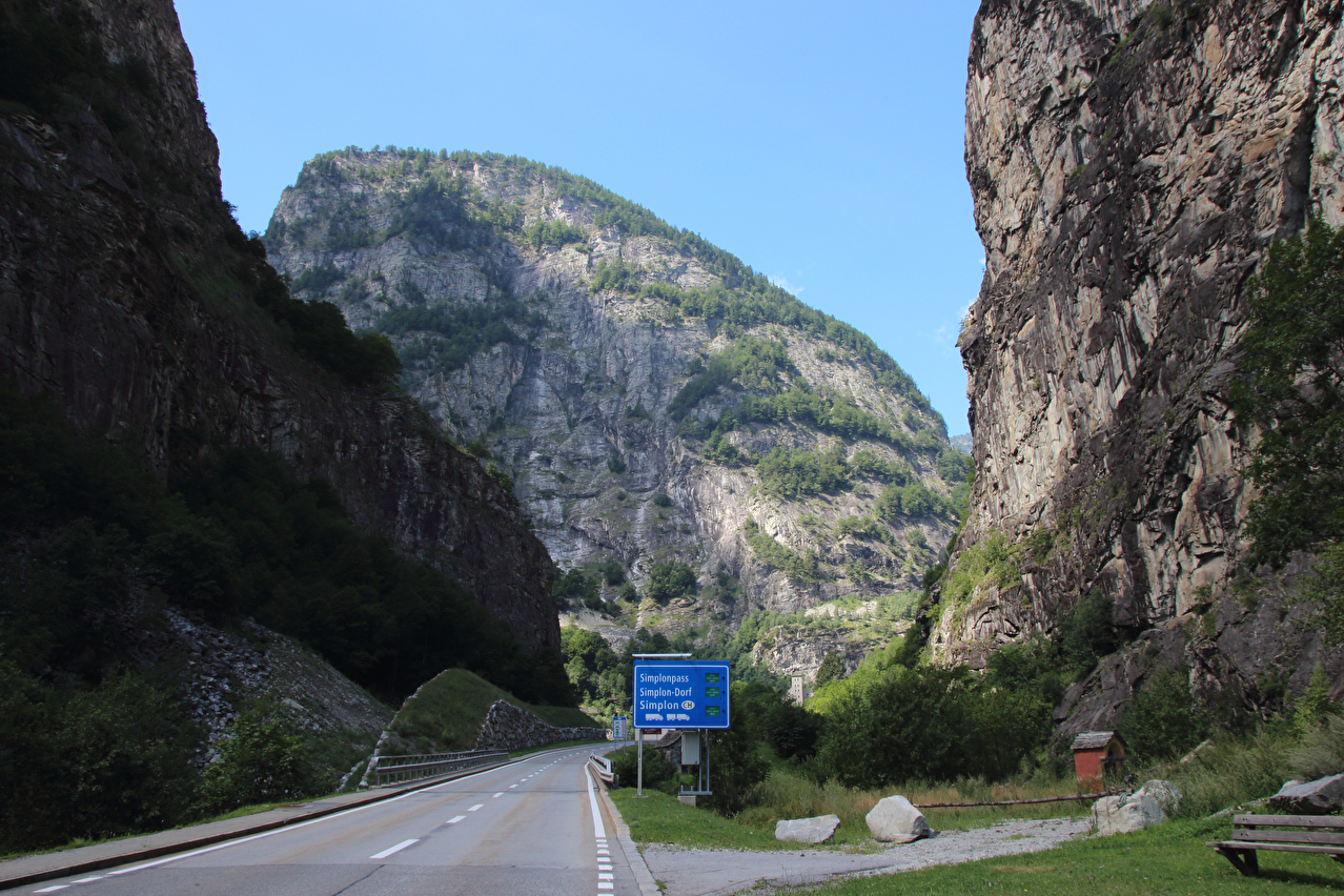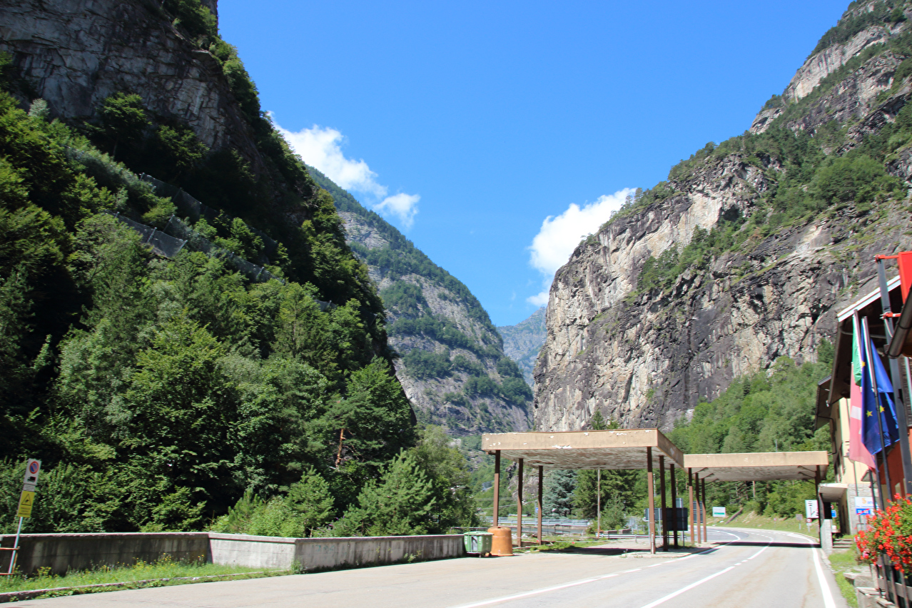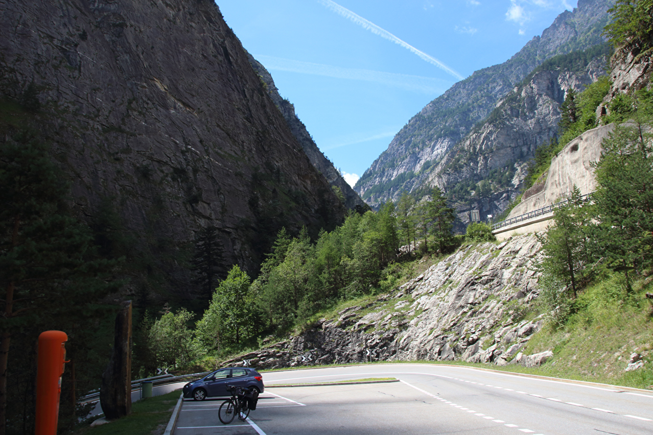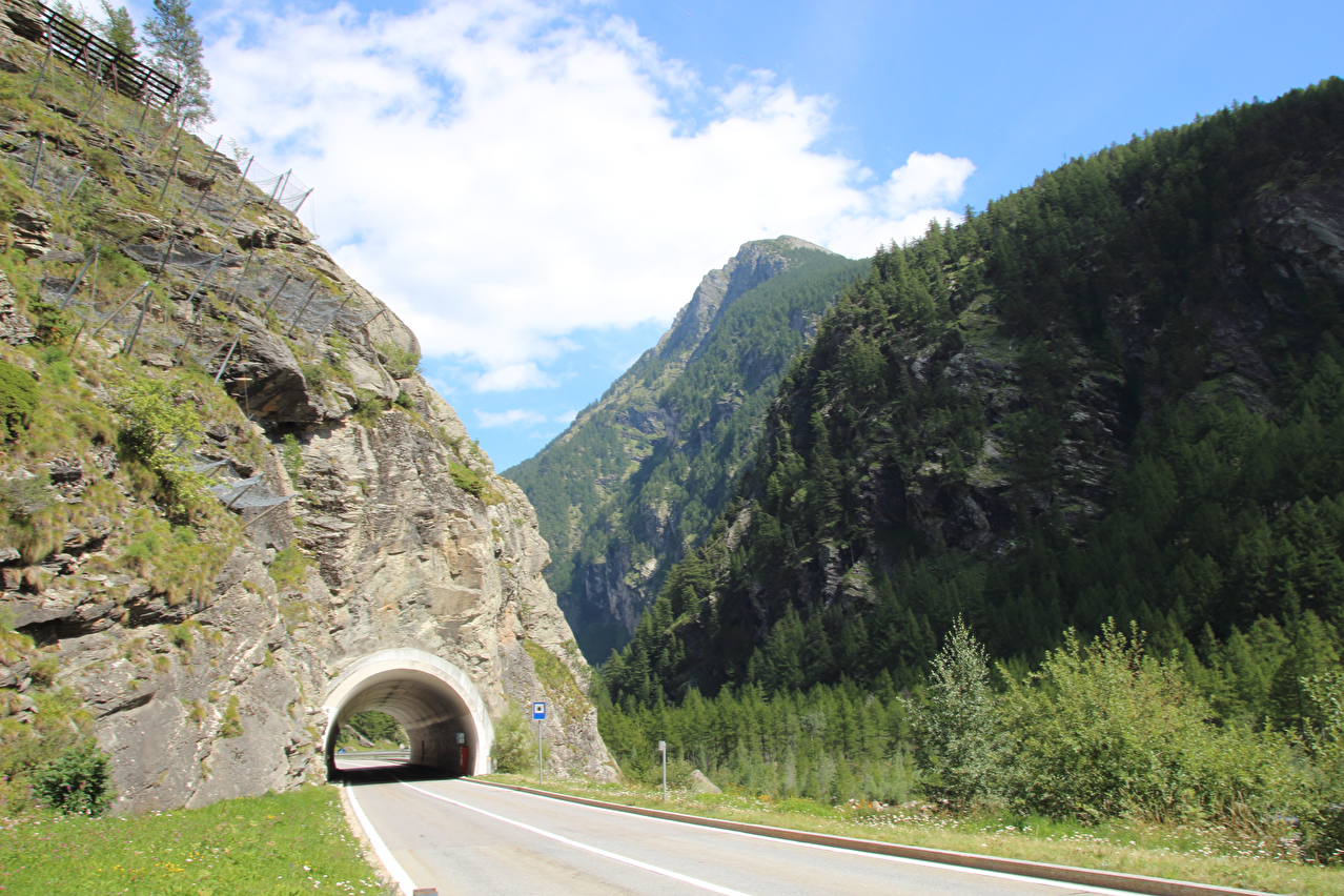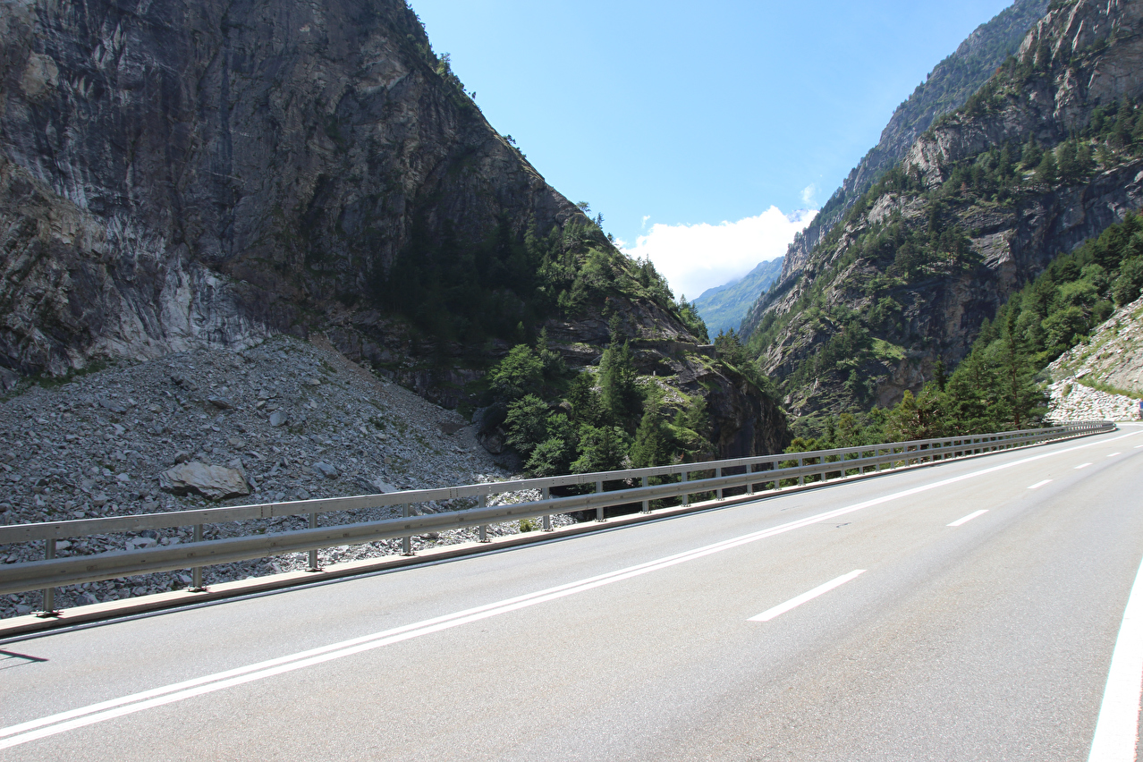 Beschreibung | Nach der recht langen Etappe am Vortag stand mit dieser Etappe eine kurze Etappe an, die aber reichlich Höhenmeter bergauf enthielt. Die Sonne schien den ganzen Tag über weitgehend ungestört von Wolken. Durch den Höhengewinn verlief diese Etappe aber nicht in einer Wärme wie die Etappe am Vortag. Das Val Divedro ist schon über seine ganze Länge recht eng, da sich die Diveria tief eingeschnitten hat. An den wenigen etwas weiteren Stellen liegen Ortschaften auf dem Talboden. Die sich bergwärts an das Val Divedro anschließende Gondoschlucht zwischen den Ortschaften Gondo am unteren Ende und Gabi am oberen Ende ist so eng, dass dort nur der Fluss, die Straße mit diversen Kunstbauten und der Stockalperweg, ein alter Saumpfad, heute Wanderweg, Platz finden. Ramserna ist keine Ortschaft, sondern nicht mehr als eine Postautohaltestelle etwa mittig zwischen zwei Kehren. Oberhalb von Gabi weitet sich das hier Chastelberg genannte Tal deutlich auf. Der durch das Tal fließende Fluss hat gleich drei Namen. In Italien heißt er Diveria, in der Schweiz von Gabi bis zur Grenze Doveria und oberhalb von Gabi Chrummbach. Der Namenswechsel in der Schweiz beruht darauf, dass zwischen Gabi und Gstein die inoffizielle Sprachgrenze zwischen italienisch und deutsch liegt. Italienisch ist zwar eine der Amtssprachen in der Schweiz, aber keine Amtssprache auf kantonaler Ebene im Kanton Wallis. Anders als an der Grenze zwischen Camedo (Schweiz) und Ribellasca (Italien), die am Vortag passiert worden war, sind hier auf beiden Seiten die Grenzkontrollstellen in Betrieb. In Italien gibt es deren zwei. Die Grenzkontrollstelle direkt an der Grenze in Paglino wurde aufgegeben, dafür wurde eine Grenzkontrollstelle im talabwärts gelegenen Iselle eingerichtet. Zwischen Iselle und Gondo vermittelte die Fahrt zwischen den beiden in Betrieb befindlichen Grenzkontrollstellen einen Hauch von Niemandsland. Daran schloss sich die Durchquerung der Gondoschlucht an. Im Bereich des in die Doveria einmündenden Alpjerbachs ist von einer Galerie kurz vor dem Übergang in einen Tunnel zu sehen, dass hier der Straßenverlauf mal geändert wurde. In früheren Zeiten wurden Straßentunnel so kurz wie möglich gebaut und dafür der Bau zusätzlicher Brücken sowie ein kurviger Straßenverlauf mit teilweise steinschlaggefährdeten Bereichen in Kauf genommen. In jüngerer Zeit werden an solchen Stellen oft längere Tunnel mit geraderem Straßenverlauf gebaut, wodurch Brücken eingespart werden. Auch wird die Straße dadurch wintersicherer und weniger durch Steinschlag gefährdet, wobei dies auch auf der alten Straße durch Galerien hätte erreicht werden können. Nachteilig an den neuen Tunneln sind die längeren Fahrzeiten im Tunnel und die durch den geraderen Streckenverlauf höheren möglichen und auch viel zu oft ausgenutzten Geschwindigkeiten des Stinkeverkehrs. Mit der Ausfahrt aus der Hofstättengalerie, der letzten Galerie im Verlauf dieser Etappe wurde alpines Gelände erreicht. Die Abfahrt von der Neuen Simplonstrasse auf die Alte Simplonstrasse gestaltete sich baustellenbedingt etwas unübersichtlich. In Simplon-Dorf erfolgte die fünfte und letzte Bergankunft dieser Tour. Der Versuch, den Fahrradcomputer zu reaktivieren, indem dieser "unten offen", also ohne Batterie und Batteriefachdeckel während der Etappe am Lenker befestigt und somit Luft und Sonne ausgesetzt war, scheiterte. Durchgetrocknet war er sicherlich, aber im Hotel lies sich der Fahrradcomputer nach dem Wiedereinsetzen der Batterie nicht reaktivieren. |