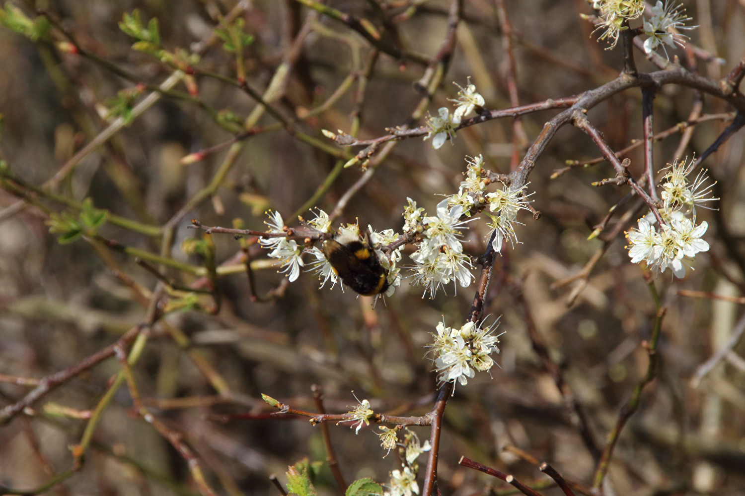 Schlehdorn (Prunus spinosa), darauf eine Dunkle Erdhummel (Bombus terrestris) ![]() 300 dpi JPEG |