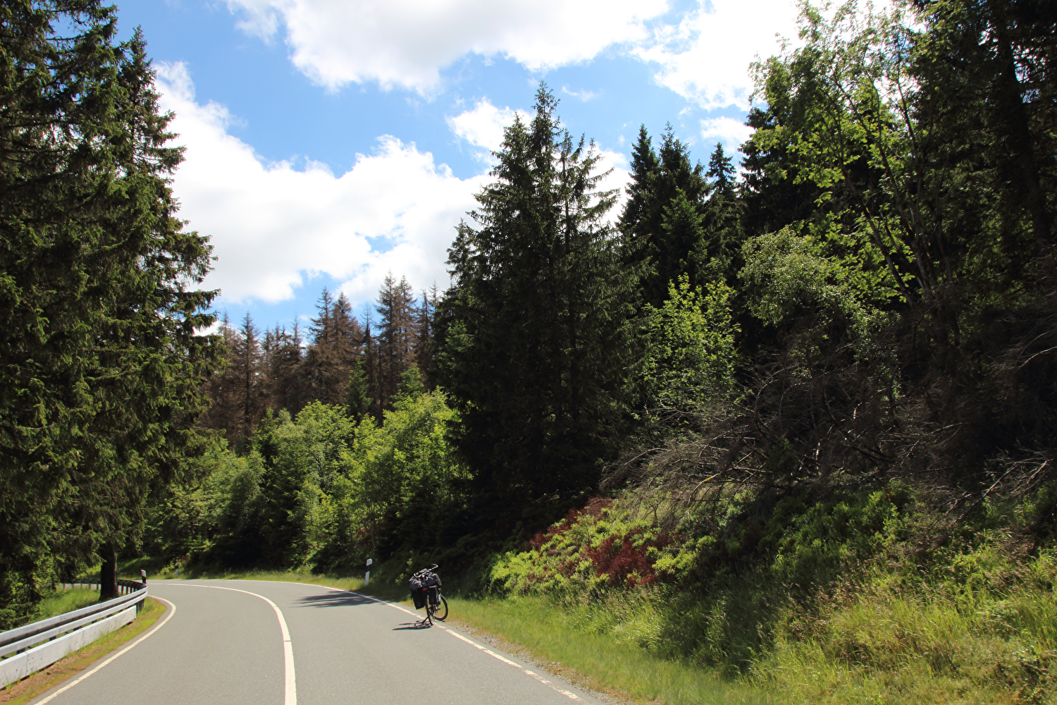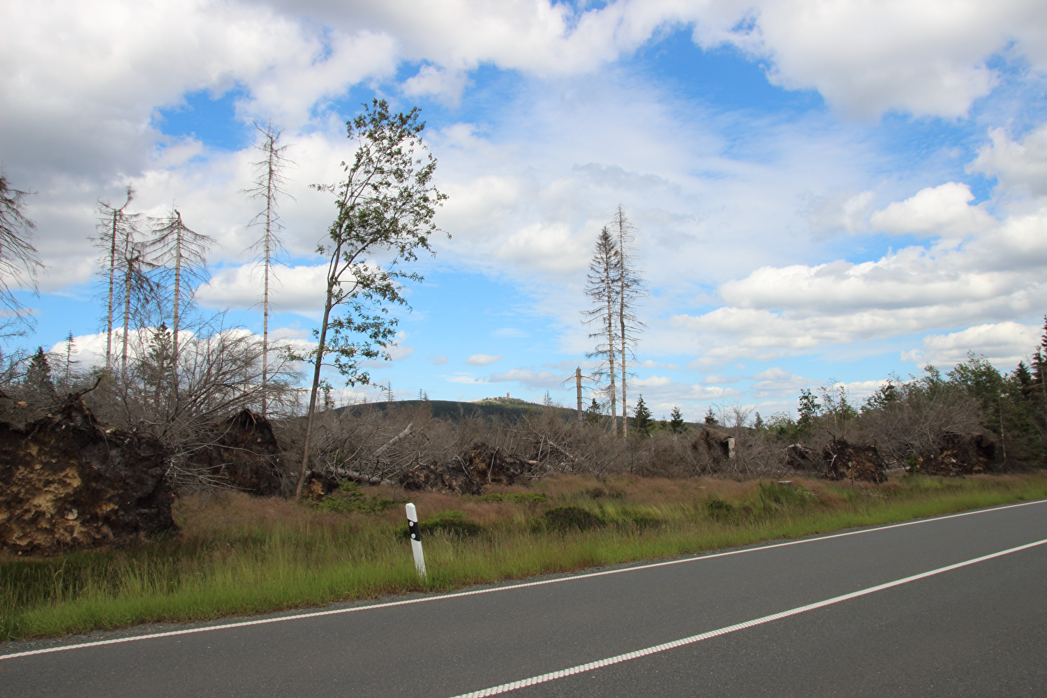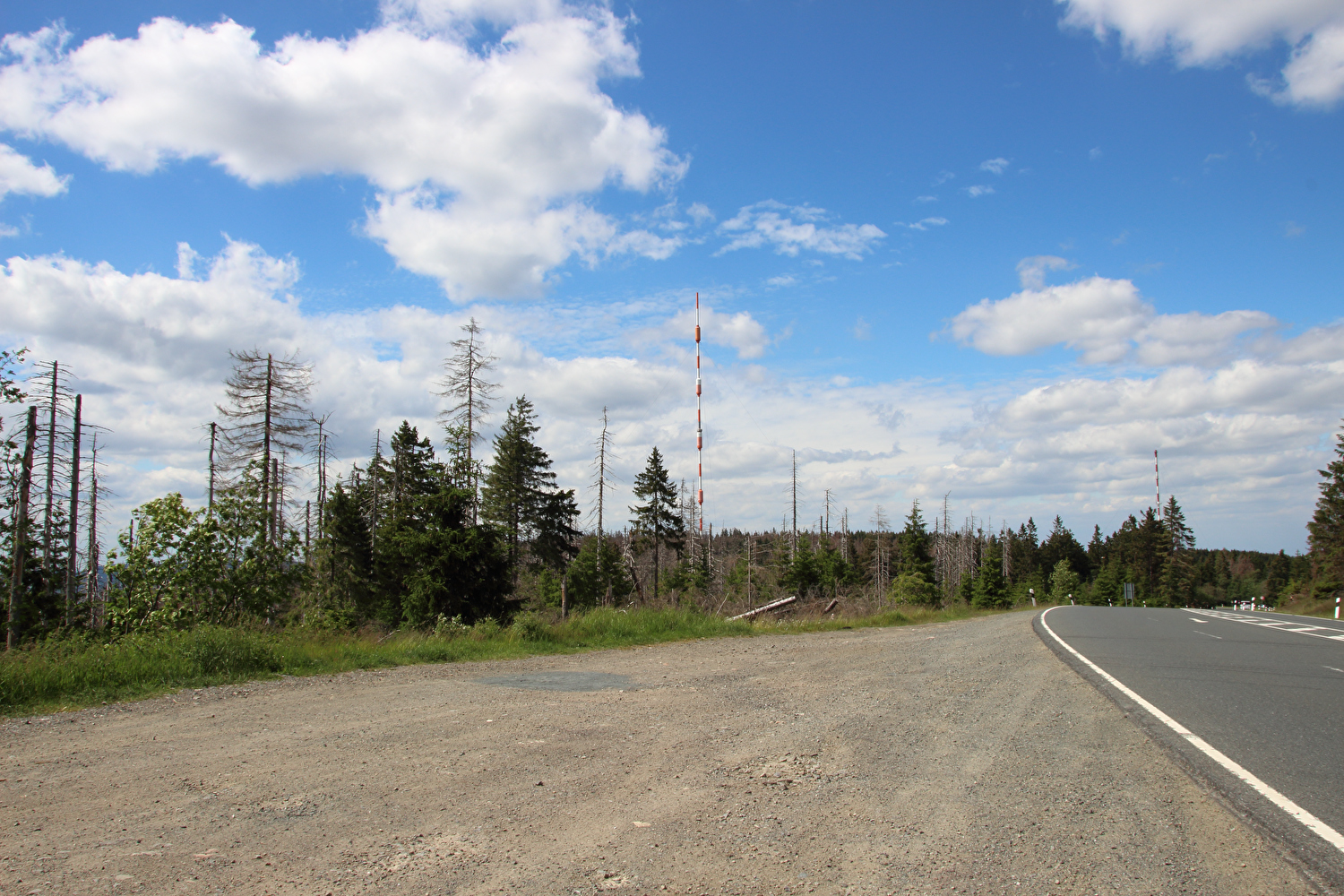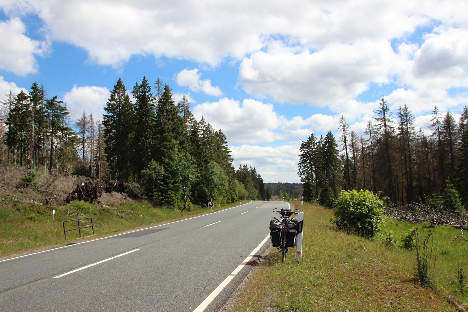 Beschreibung | Die Routenwahl dieser Viertagestour erfolgte aus mehreren Gründen. Zum einen sollte diese Tour reichlich Höhenmeter bergauf „auf der Straße“ enthalten. Zum anderen sollten Bahnan- und abreise kurz ausfallen, um vier Etappen mit Tageslänge fahren zu können. Zudem war Bahnfahren wegen des „Maskenballs“ (Pflicht zum Tragen einer Mund-Nase-Bedeckung) in den Zügen besonders unattraktiv. Bei der Routenwahl wurde in Kauf genommen, dass die beiden ersten Etappen bis auf Kleinigkeiten den am 22.06.2019 und 23.06.2019 gefahrenen Etappen entsprachen. Diese Etappe verlief bei trockenem Wetter und sehr starkem Südwestwind, der durch die Richtwirkung des Tals im Okertal von vorne blies. Auf dem Okerstausee erzeugte der Wind Wellen mit Schaumkronen. Das Wetter war nicht unfreundlich. Nachmittags verdichteten sich die Wolken aber zunehmend. Am Abend in Wernigerode fielen erste Regentropfen und deuteten einen Wetterwechsel an. Die L504 zwischen Altenau und Torfhaus war bei Altenau immer noch gesperrt, woraus sich eine ruhige Auffahrt nach Torfhaus ergab. Obwohl am westlichen Ortsausgang von Torfhaus auf diese Sperrung hingewiesen wurde, wollten es einige Kraftfahrer einfach nicht glauben: Also erstmal die Straße runter stinken und dann kurze Zeit später wieder hoch stinken – einfach nur dämlich. Im Hochharz stand nun noch viel mehr Totwald als im letzten Jahr, und das nur weil die Nationalparkverwaltung sich weigerte und nach wie vor weigert den Borkenkäfer zu bekämpfen. Dass toter Wald gefolgt von endlos öden Buchenwäldern, die schon die meisten norddeutschen Mittelgebirge dominieren, nicht gerade Besucher in den Harz lockt, scheint die Nationalparkverwaltung nicht zu interessieren oder aber genau das ist gewollt. |