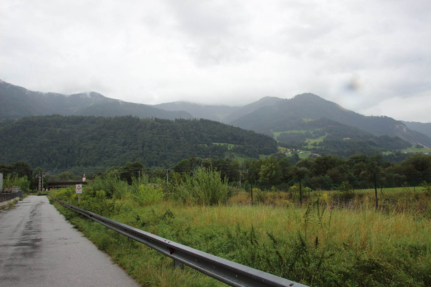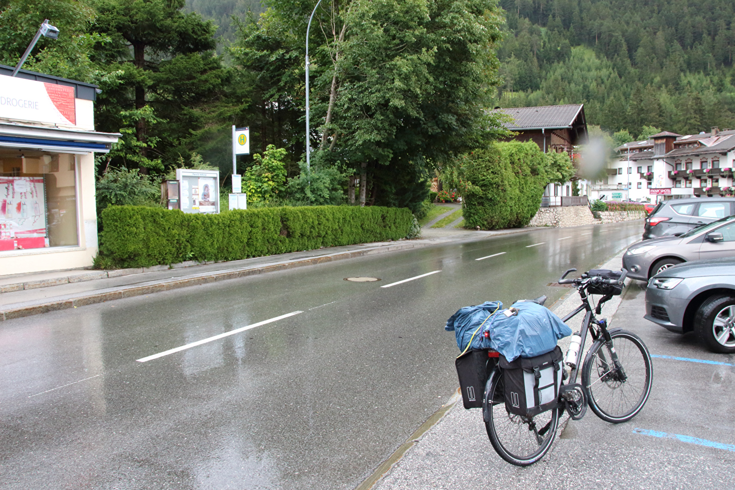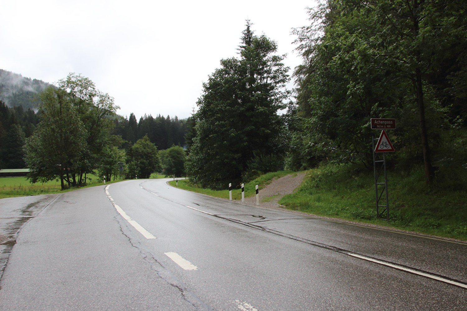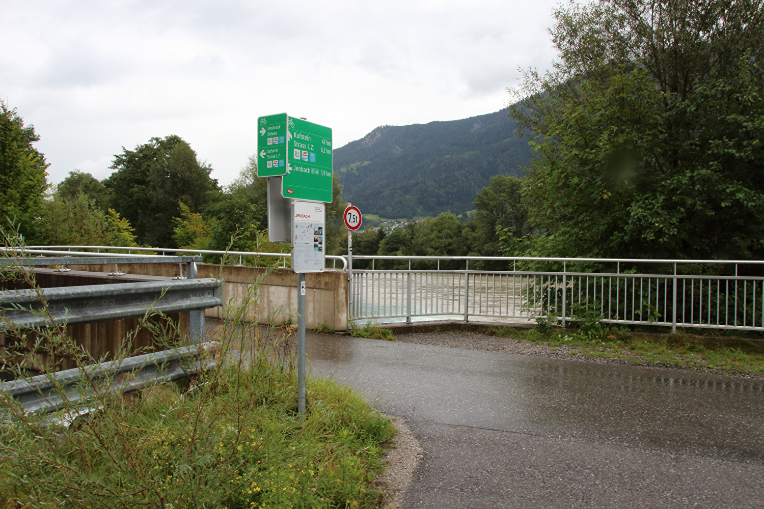 Beschreibung | Seit dem Vorabend fiel ergiebiger Dauerregen. Ein Ende desselben war an diesem Tag nicht absehbar. Das Gepäck war regenfest verstaut und die Kamera steckte in einem Gefrierbeutel, um überhaupt ein paar Fotos unabhängig von irgendwelchen Unterständen machen zu können. Da es zudem recht kalt war, wurde mit Ausnahme der Regenüberhandschuhe in norddeutscher Trachtenkleidung (Regen-Helmüberzieher, Regenjacke, Regenhose, Regengamaschen) gefahren, was insbesondere bergauf nicht zu den Spaßbringern zählte. Am Südufer des Tegernsees fiel der Blick auf die Mündung der Weißach, dem größten Zufluss des Tegernsees. Gefühlt begann hier mit dem Verlassen des Südufers des Tegernsees die Alpenüberquerung. Topografisch betrachtet hatte sie bereits am Vortag am Westufer des Tegernsees bei Reit begonnen. Mit dem Achenpass wurde der erste Bergpass der Tour erreicht. Allerdings bildete dieser nicht das „Dach der Etappe“, da Maurach noch etwas höher liegt. Etwa 1 km südlich des Achenpasses wurde die Grenze von Deutschland nach Österreich überquert. Mehr als ein paar Schilder beiderseits der Grenze wiesen nicht darauf hin, dass gerade eine Staatsgrenze überquert wurde. Am Achensee steht am Westufer ein Leuchtturm. Das ist nun schon der zweite Leuchtturm in den Alpen nach dem Leuchtturm auf dem Oberalppass. Leuchttürme gehören doch eigentlich ans Meer, und das ist vom Achensee wie auch vom Oberalppass weit weg. Zweifelsohne ist es einfacher einen Leuchtturm in den Alpen zu bauen als Berge etwa an der Nordsee. Von Maurach aus fällt die Straße ins Inntal steil ab mit maximalem Gefälle von 16 % und längeren Abschnitten mit Gefälle über 10 %. Die Straße durchquert dabei Jenbach, dass vom Talboden des Inntals aus in den Hang aufsteigt. Im Inntal wurde auf den Inn-Radweg gewechselt. Der verläuft zwischen Jenbach und Stans allerdings wenig romantisch direkt neben der Inntal Autobahn. Einige Kilometer vor dem Etappenziel hörte es endlich auf zu regnen. Diese zum Einrollen gedachte Etappe verlief wegen des Dauerregens weniger entspannt als angedacht, und Bergpanorama fiel auch aus. |