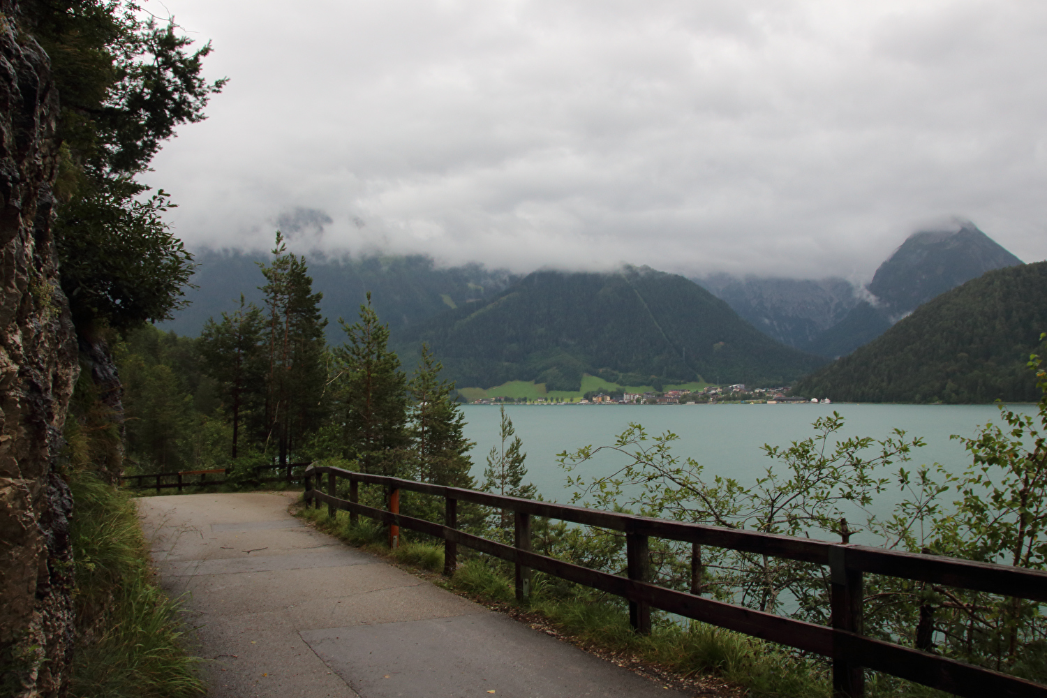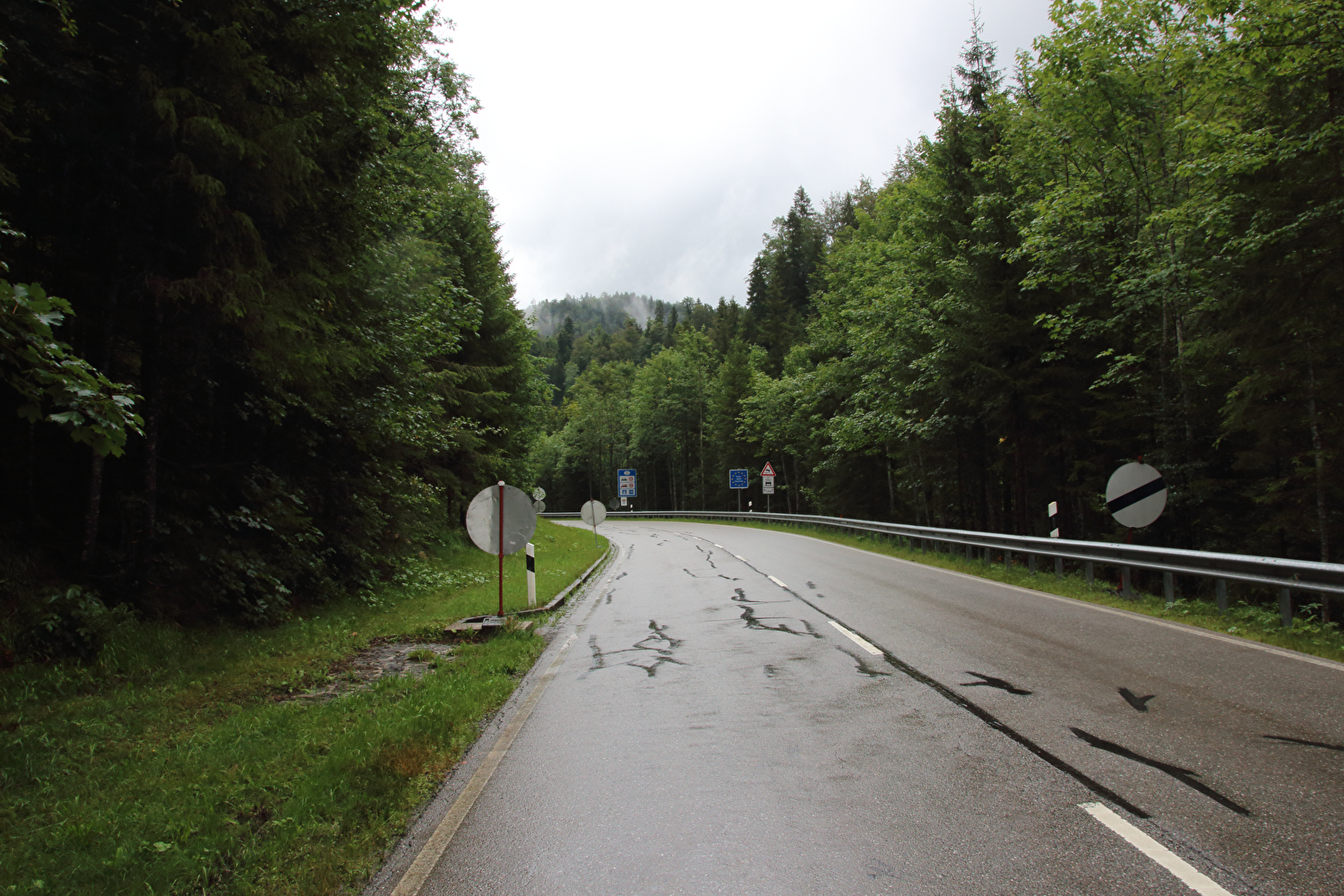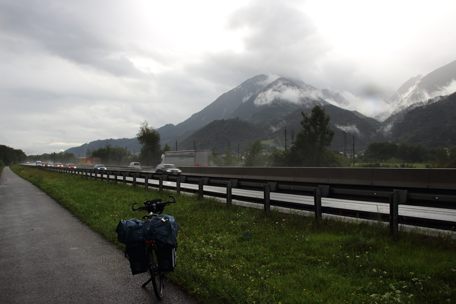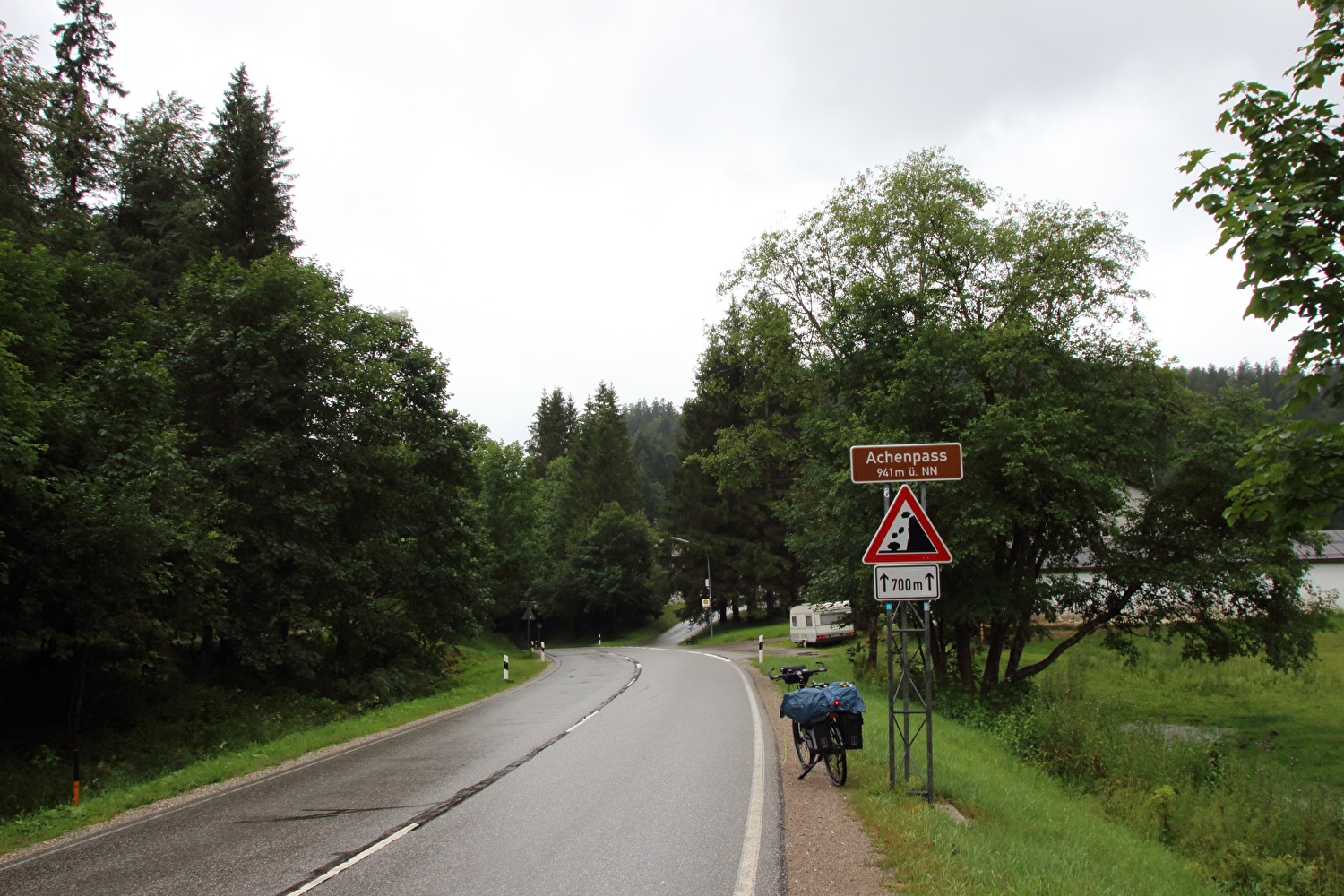 Beschreibung | Seit dem Vorabend fiel ergiebiger Dauerregen. Ein Ende desselben war an diesem Tag nicht absehbar. Das Gepäck war regenfest verstaut und die Kamera steckte in einem Gefrierbeutel, um überhaupt ein paar Fotos unabhängig von irgendwelchen Unterständen machen zu können. Da es zudem recht kalt war, wurde mit Ausnahme der Regenüberhandschuhe in norddeutscher Trachtenkleidung (Regen-Helmüberzieher, Regenjacke, Regenhose, Regengamaschen) gefahren, was insbesondere bergauf nicht zu den Spaßbringern zählte. Am Südufer des Tegernsees fiel der Blick auf die Mündung der Weißach, dem größten Zufluss des Tegernsees. Gefühlt begann hier mit dem Verlassen des Südufers des Tegernsees die Alpenüberquerung. Topografisch betrachtet hatte sie bereits am Vortag am Westufer des Tegernsees bei Reit begonnen. Mit dem Achenpass wurde der erste Bergpass der Tour erreicht. Allerdings bildete dieser nicht das „Dach der Etappe“, da Maurach noch etwas höher liegt. Etwa 1 km südlich des Achenpasses wurde die Grenze von Deutschland nach Österreich überquert. Mehr als ein paar Schilder beiderseits der Grenze wiesen nicht darauf hin, dass gerade eine Staatsgrenze überquert wurde. Am Achensee steht am Westufer ein Leuchtturm. Das ist nun schon der zweite Leuchtturm in den Alpen nach dem Leuchtturm auf dem Oberalppass. Leuchttürme gehören doch eigentlich ans Meer, und das ist vom Achensee wie auch vom Oberalppass weit weg. Zweifelsohne ist es einfacher einen Leuchtturm in den Alpen zu bauen als Berge etwa an der Nordsee. Von Maurach aus fällt die Straße ins Inntal steil ab mit maximalem Gefälle von 16 % und längeren Abschnitten mit Gefälle über 10 %. Die Straße durchquert dabei Jenbach, dass vom Talboden des Inntals aus in den Hang aufsteigt. Im Inntal wurde auf den Inn-Radweg gewechselt. Der verläuft zwischen Jenbach und Stans allerdings wenig romantisch direkt neben der Inntal Autobahn. Einige Kilometer vor dem Etappenziel hörte es endlich auf zu regnen. Diese zum Einrollen gedachte Etappe verlief wegen des Dauerregens weniger entspannt als angedacht, und Bergpanorama fiel auch aus. |