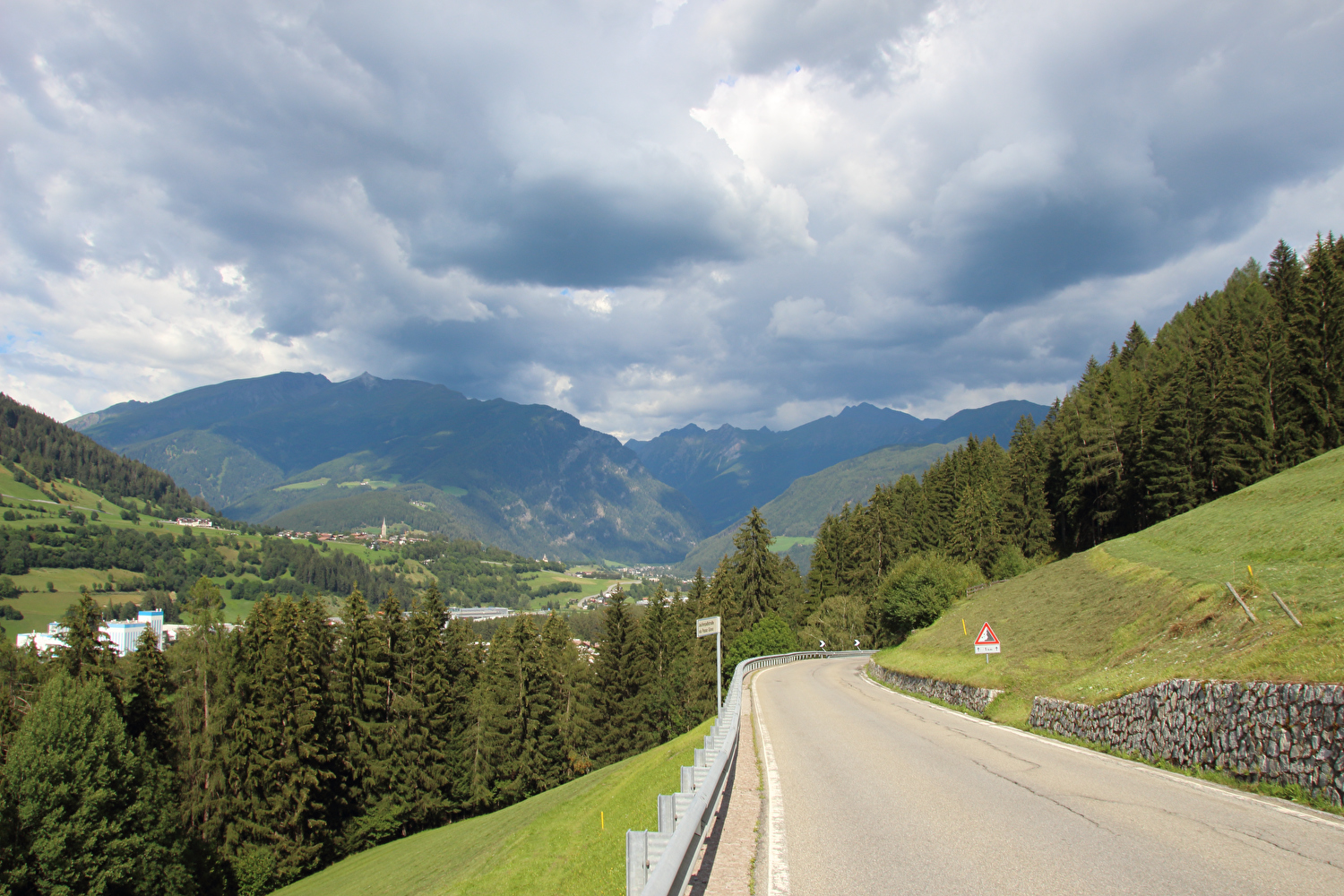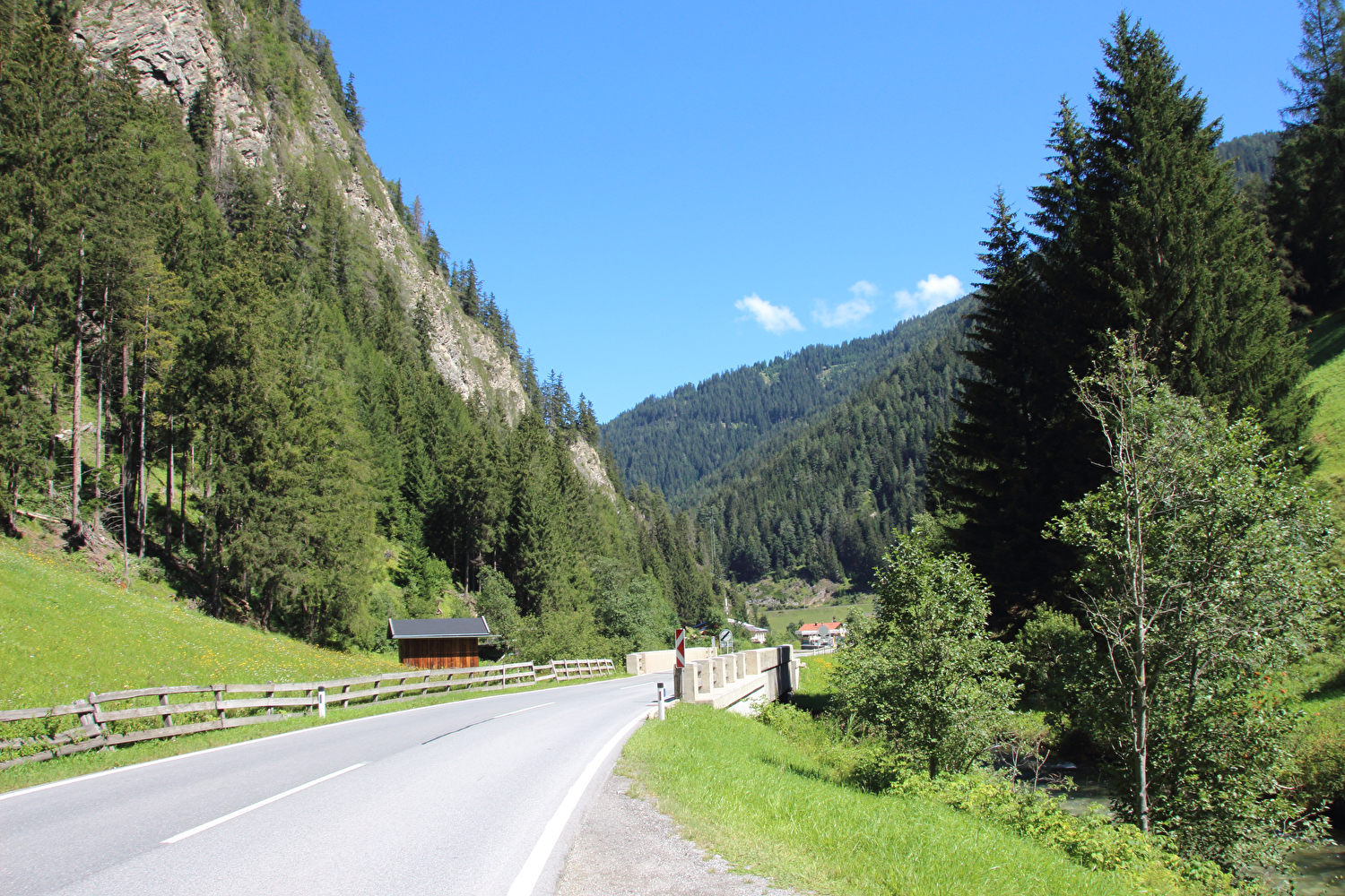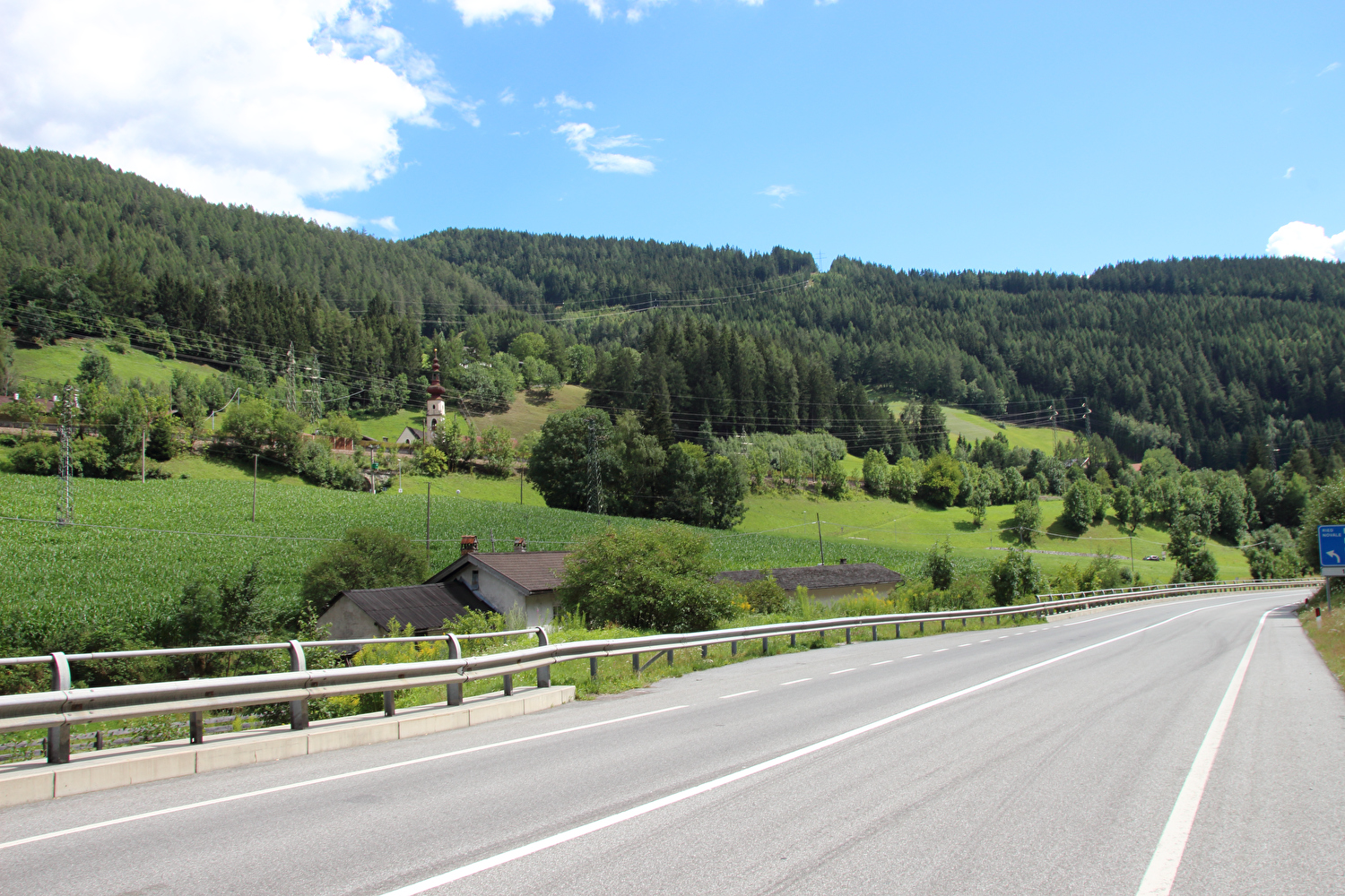 Beschreibung | Das Wetter hielt. Bei fast wolkenlosem Himmel verlief diese Etappe. Wie schon zwei Tage zuvor bildete die Passhöhe des überquerten Bergpasses, hier der Brennerpass nicht das „Dach der Etappe“, da mit der Bergankunft in Kalch ein höher gelegener Ort erreicht wurde. Der Bernnerpass wurde schon im Rahmen mehrerer Alpentouren überquert. Dies liegt darin begründet, dass er den Alpenhauptkamm überquert und zudem sehr zentral liegt. Das äußert sich auch darin, dass über den Brennerpass eine Straße, eine Autobahn und eine Eisenbahnlinie – noch mit Nah-, Fern- und Güterverkehr, nach der Fertigstellung und Inbetriebnahme des Brenner-Basistunnels wohl nur noch mit Nahverkehr – führen. Zudem beginnt auf der Passhöhe auf italinischer Seite ein Fernradweg. Eine Durchbindung dieses Fernradweges nach Norden scheitert am sehr begrenzten Platz im Wipptal nördlich des Brennerpasses. Das Wipptal ist etwas seltsam, denn hydrogeografisch sind es zwei Täler. Der Abschnitt zwischen Brennerpass und Innsbruck wird auch als Unteres Wipptal oder Silltal bezeichnet, der Abschnitt zwischen Brennerpass und Franzenfeste als Oberes Wipptal oder Oberes Eisacktal. Über den Brennerpass verläuft die Inn-Etsch-Wasserscheide. Die Sill und ihre Zuflüsse entwässern über den Inn und die Donau ins Schwarze Meer, die Eisack und ihre Zuflüsse über die Etsch in die Adria. Ab der Brennerpasshöhe wurde auf den Brennerradweg gewechselt, der zwischen Passhöhe und Vallming streckenweise auf der stillgelegten alten Trasse der Brennerbahn, welche diesen Bereich nunmehr in einem Tunnel umfährt, geführt wird. Bei Vallming erreicht der Radweg den Talboden des Pflerschtals. Ab hier wurde bis Sterzing auf die Straße gewechselt. Die bis Gossensaß verkehrsarme Straße verläuft auf dem Talboden, steigt in Gossensaß nur wenige Meter zur Brennerstaatsstraße an und diese fällt dann durchgängig bis Sterzing ab. Der Radweg hingegen weißt zwischen Vallming und Gossensaß ein welliges Profil auf und hat zwischen Gossensaß und Sterzing bei Ried eine üble Gegensteigung. Der Radweg weist in beiden Richtungen nach Ried Steigungen bis zu 17 % auf. So sollte ein Fernradweg nicht trassiert werden! In Sterzing wieder dem Radweg folgend führte die Fahrt mitten durch die Innenstadt. Am Südrand von Sterzing wurde der Radweg Richtung Gasteig verlassen, wo dann der Schlussanstieg der Etappe auf der Jaufenpassstraße bis zum Etappenziel Kalch begann. |