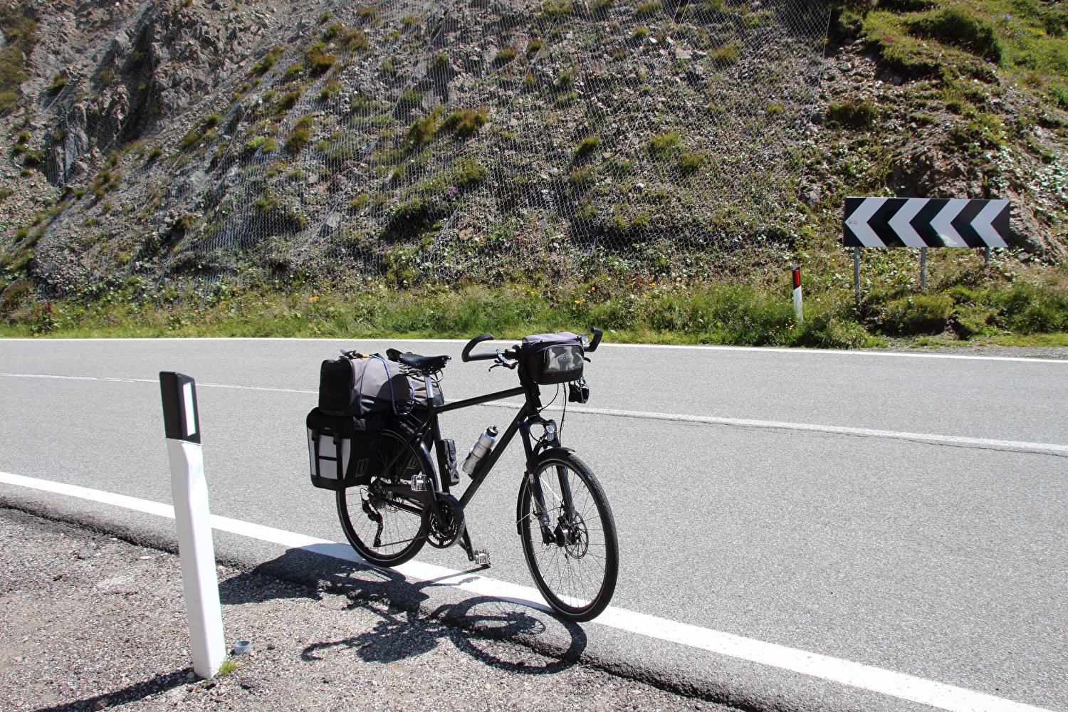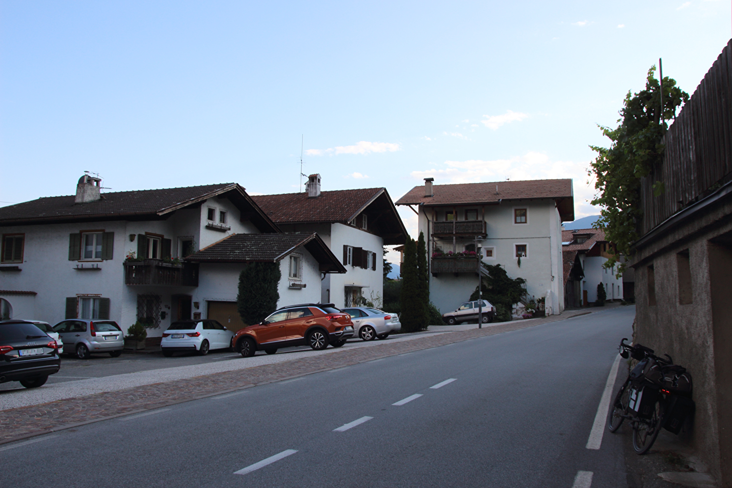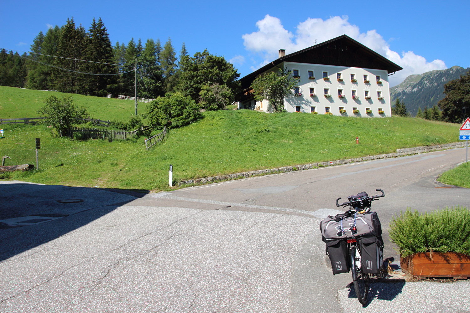 Beschreibung | Mit dem Jaufenpass standen der erste über 2000 Meter hoch gelegene Bergpass der Tour und somit auch die erste Fahrt oberhalb der montanen Baumgrenze an. An der Ostrampe liegen montane Waldgrenze und montane Baumgrenze eng beieinander. Nach einer Linkskurve noch im Wald ist plötzlich der Blick frei auf baumfreie Hochgebirgslandschaft. Weiter oben bieten sich Fernsichten auf die Stubaier Alpen und die Zillertaler Alpen. Die Passhöhe ist recht ausgeprägt. Nach deren Überquerung reicht die Fernsicht bis zu den Ötztaler Alpen. An der Westrampe liegen montane Baumgrenze und montane Waldgrenze weit auseinander. Der Andrang auf der Passhöhe war überschaubar. Allerdings pausierten dort mehr Motorradfahrer als Fahrradfahrer. Der Fahrradverkehr auf der Jaufenpassstraße beschränkte sich im wesentlichen auf Rennräder. Die Abfahrt vom Jaufenpass bis Meran, das am folgenden Tag erreicht wurde, überwindet eine Höhendifferenz von 1769 m. Davon entfallen 1405 m auf die Jaufenpassstraße zwischen Passhöhe und Sankt Leonhard in Passeier. Vom Radweg Passeiertal südlich von Sankt Leonhard in Passeier auf etwa 660 m s.l.m. reichte der Blick bis zur Passhöhe. Dieser Radweg ersparte zwar jede Menge Stinkeverkehr, da auf der Straße bereits der nachmittägliche Pendlerverkehr rollte, hatte dafür aber den entscheidenden Nachteil, dass das Etappenziel Riffian etwa 70 m oberhalb des Radweges liegt. Der Abzweig vom Radweg nach Riffian ist schlecht beschildert und zudem sehr steil mit Steigungen teilweise über 10 %. Somit gab es zum Ende der Etappe doch noch Schiebepassagen. |