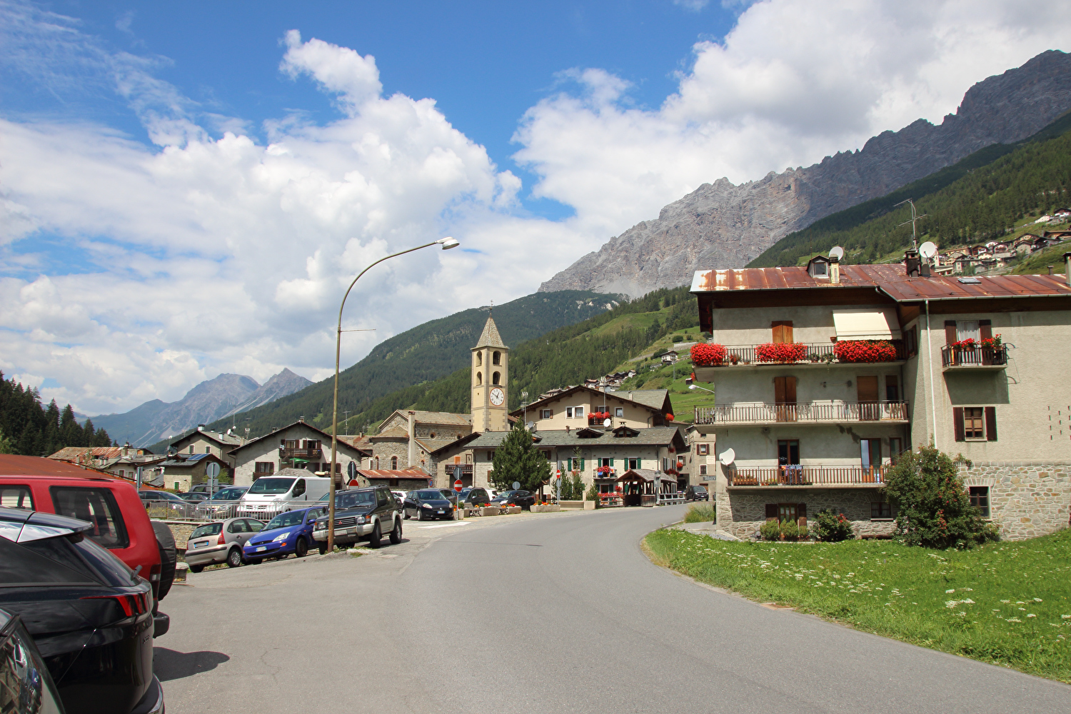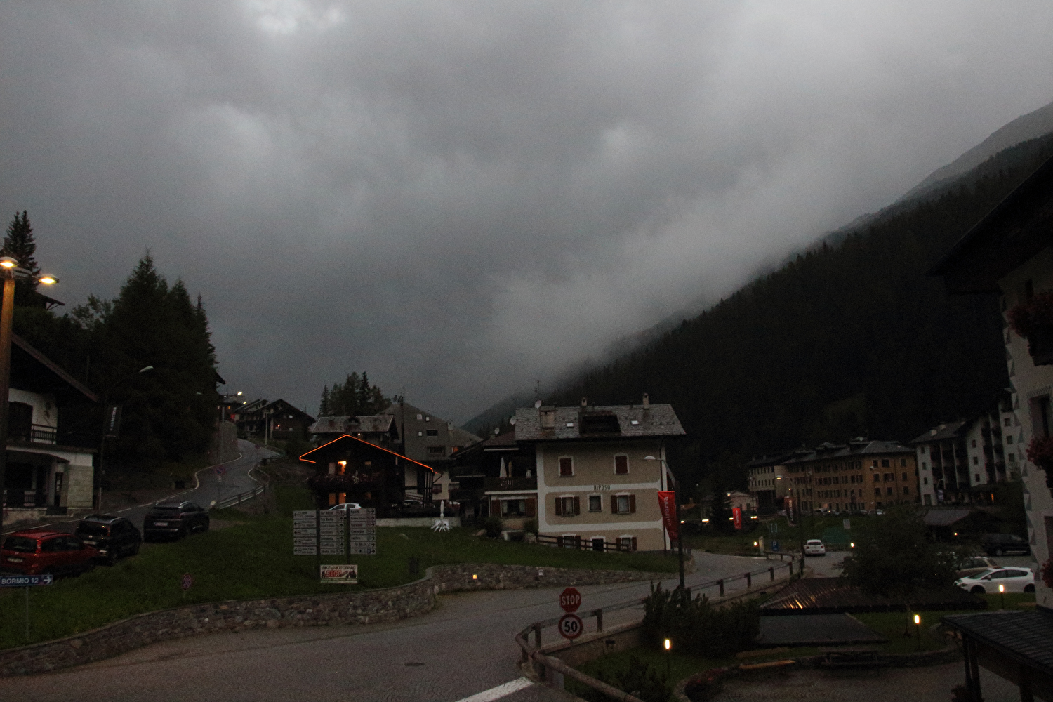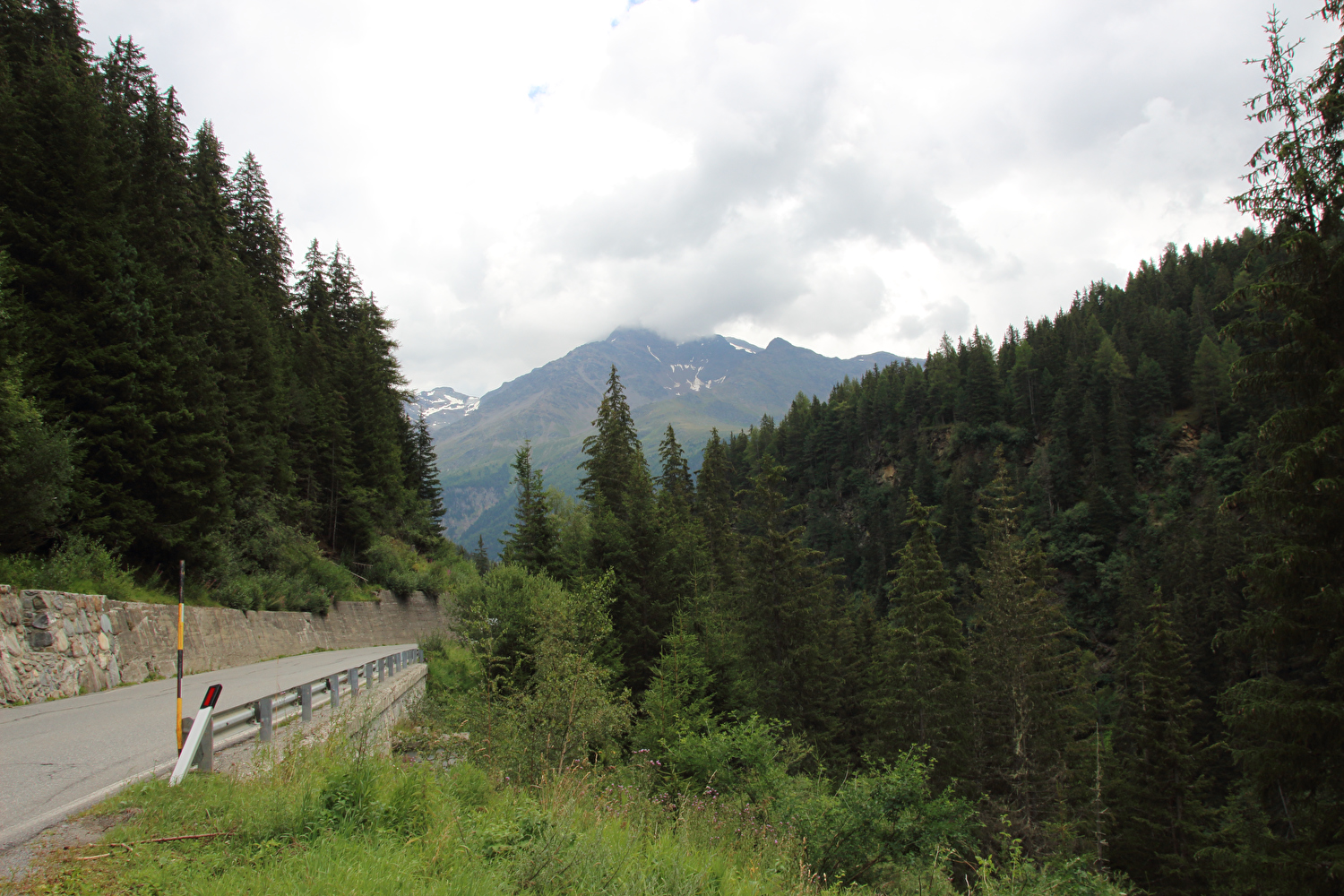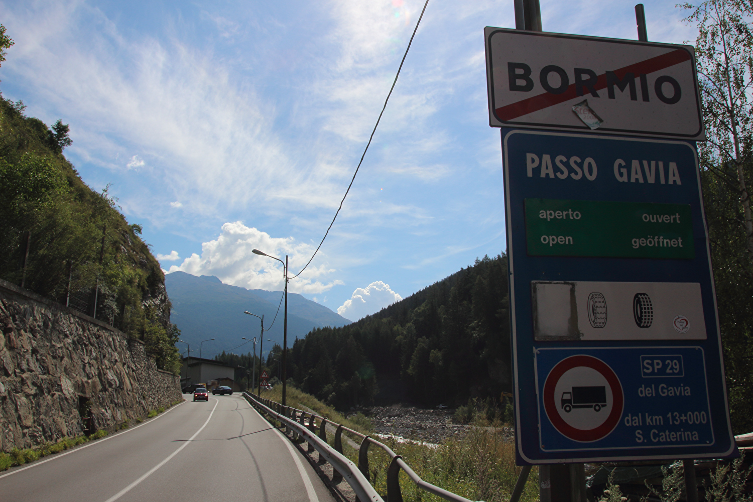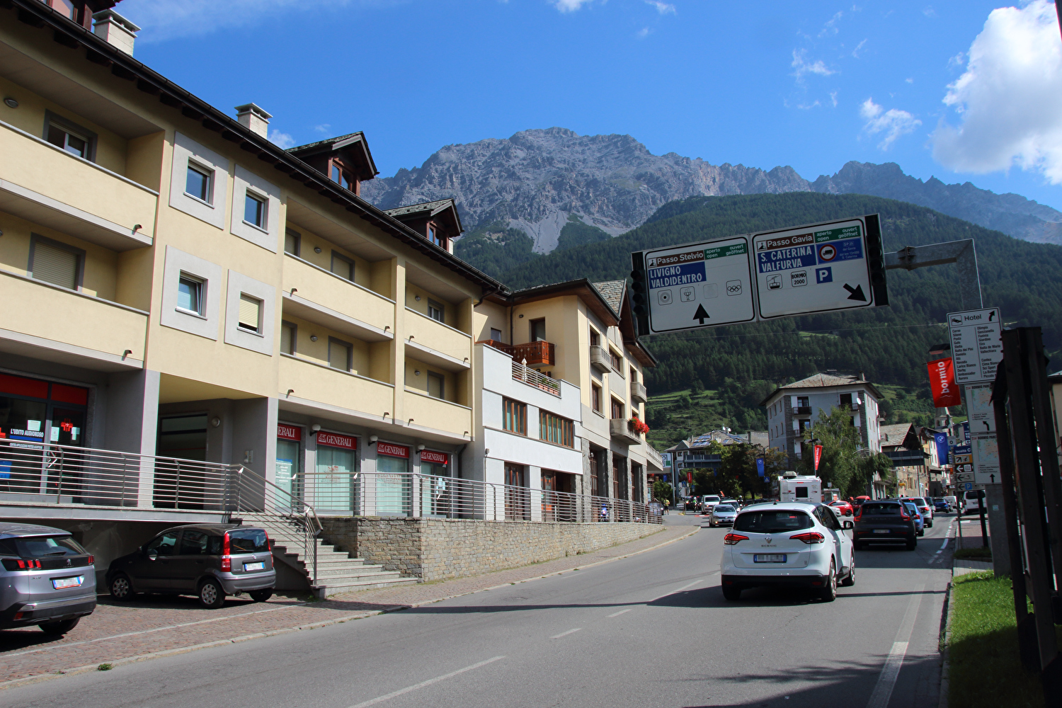 Beschreibung | Diese kurze und recht leichte Etappe zwischen Passo dello Stelvio und Passo di Gavia kam ganz gelegen. Immerhin enthielten die ersten zwölf Etappen dieser Tour keine einzige Flachetappe. Die im Rahmen dieser Etappe gefahrene Strecke war bereits drei Jahre zuvor gefahren worden. Für die beiden folgenden Etappen gilt Ensprechendes. Das Fernziel Nordufer des Lago di Garda ließ bei vertretbar langer Reisezeit keine andere Route ab Bormio zu. Außerdem lag mit dem Passo di Gavia wenigstens noch ein hoch gelegener Pass auf der Route dieser Tour. Der Himmel zeigte sich nicht unfreundlich, aber doch etwas unaufgeräumt. Bei der Ausfahrt aus Bormio stieg die Temperatur in der Sonne auf +42 °C, bevor sich eine Wolke vor die Sonne schob und für Abkühlung sorgte. Die feuchtwarme Luft verhieß allerdings nichts Gutes. Dennoch endete die Etappe trocken. Wie schon vor drei Jahren zog abends in Santa Caterina Valfurva Regen auf. |