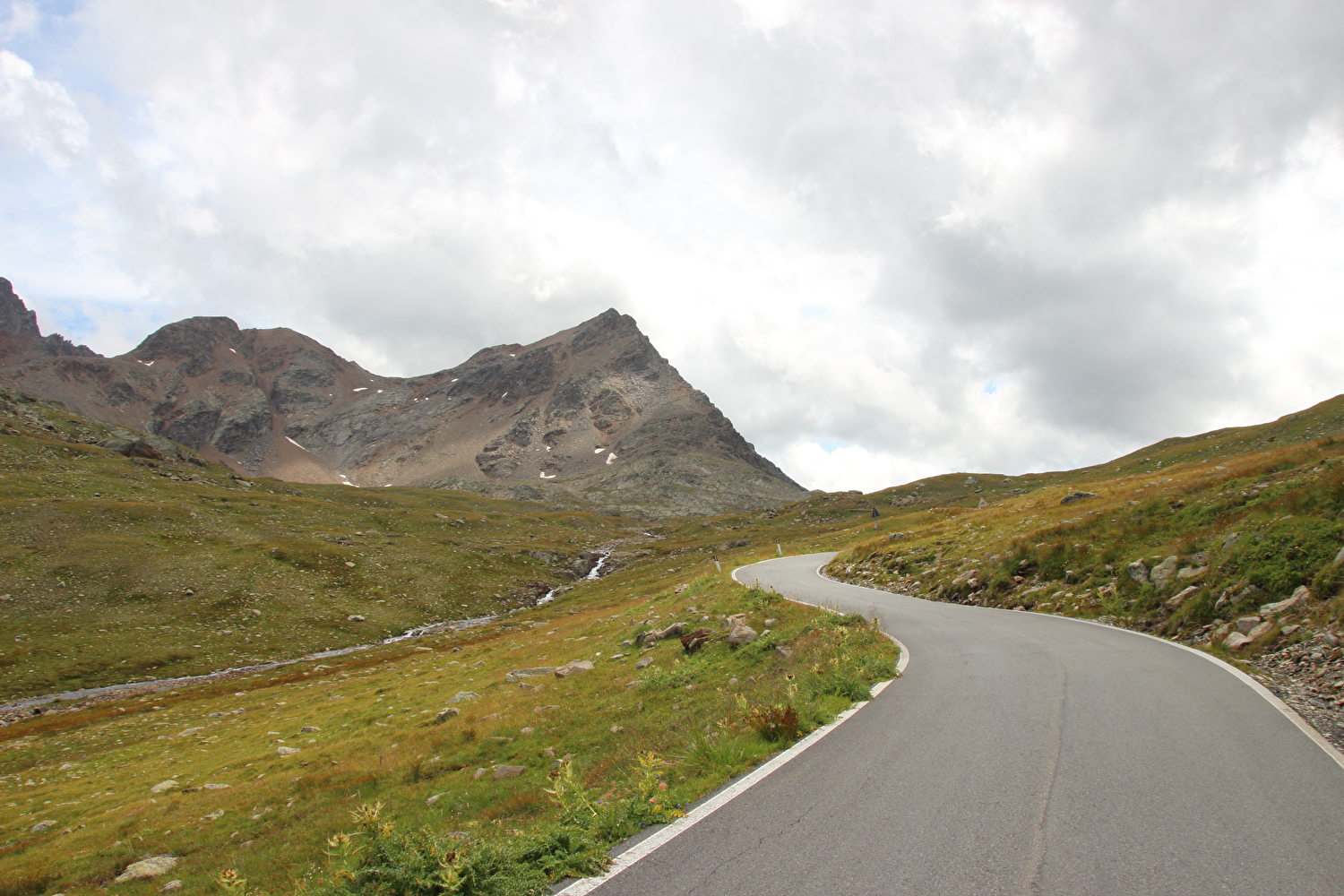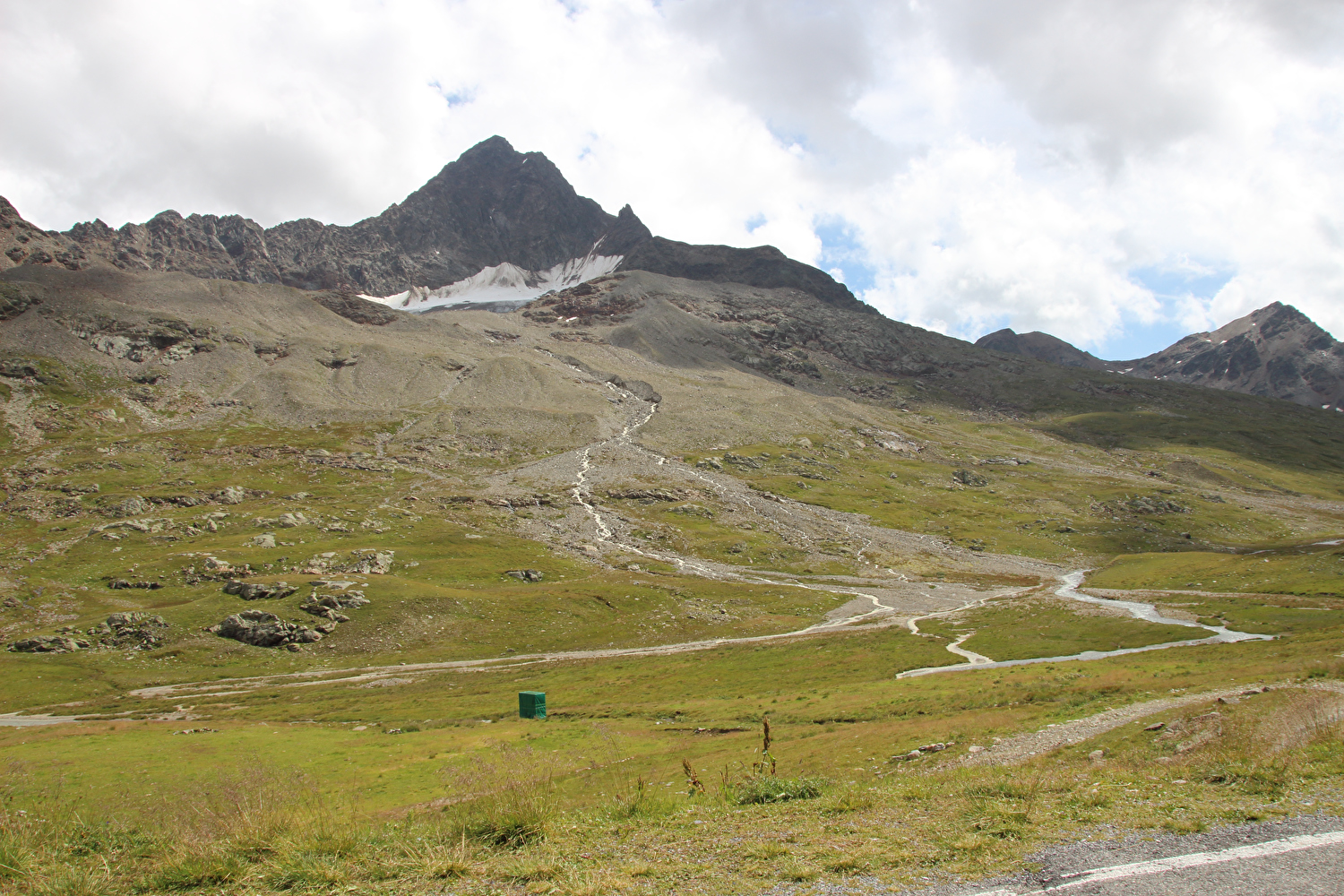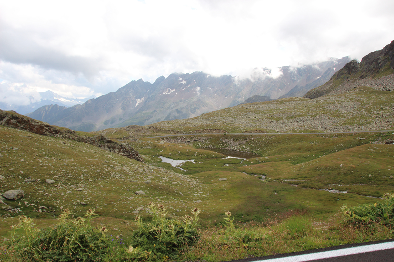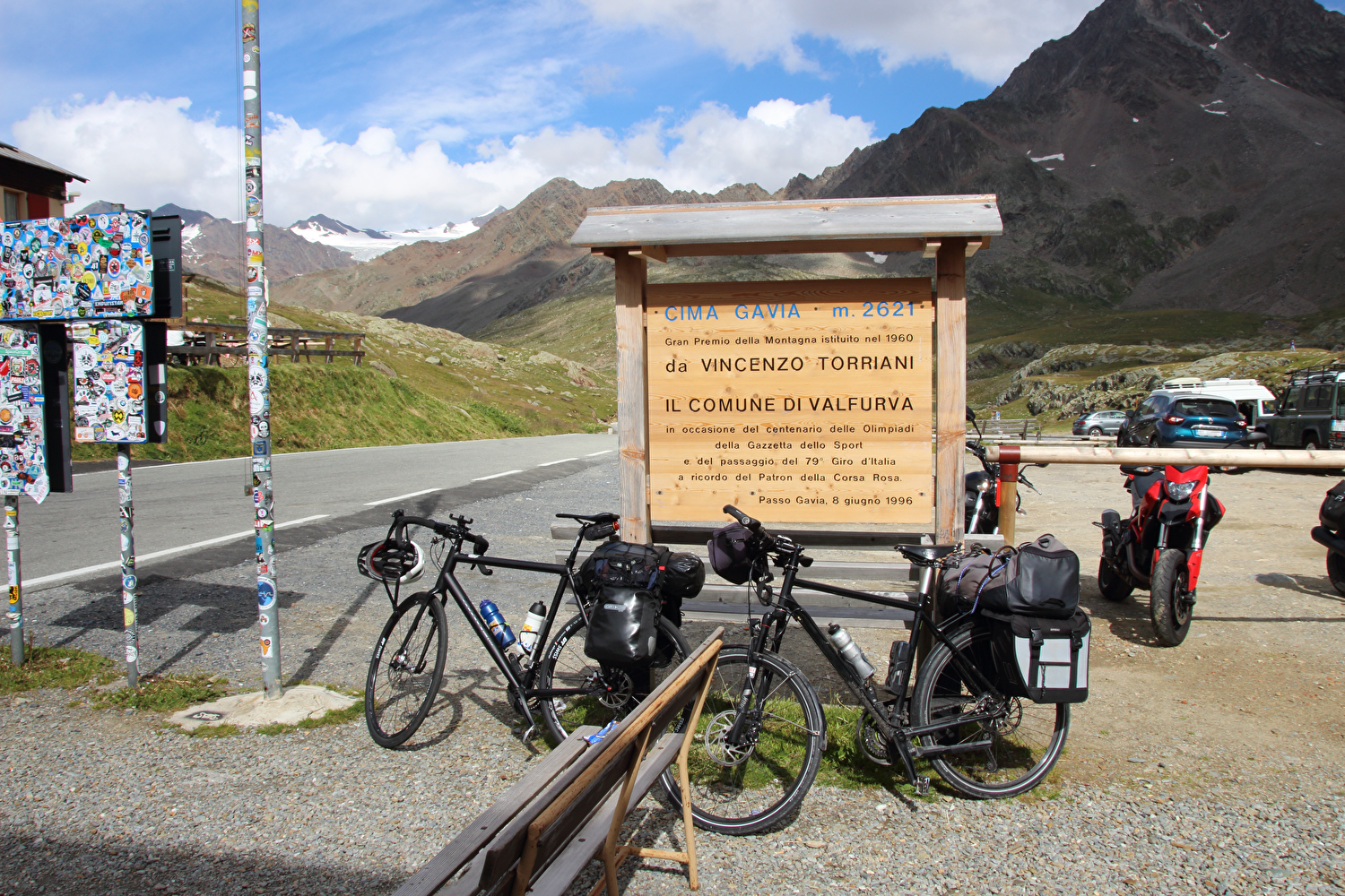 Beschreibung | Diese Etappe führte über den letzten über 2000 Meter hoch gelegenen Bergpass im Rahmen dieser Tour und auch ein letztes Mal in Regionen oberhalb der montanen Waldgrenze und montanen Baumgrenze. Die Strecke dieser Etappe war bereits vor drei Jahren schon einmal gefahren worden. Anders als damals lag auf dem Passo di Gavia dieses Mal nicht das „Dach der Tour“, denn das war im Rahmen dieser Tour bereits mit dem Passo dello Stelvio überquert worden. Am Morgen sah es nach Regen aus. Daher wurden Gepäck und Kamera auf Regenfahrt vorbereitet, aber für die Bergauffahrt noch keine Regenkleidung angelegt. Während des Anstiegs klarte es aber etwas auf und blieb vor allem trocken. Der eine oder andere Sturzbach (italienisch: Torrente) führte noch das Regenwasser der Nacht zu Tal. Ab Santa Caterina Valfurva windet sich die Nordrampe des Passo di Gavia mit einer Kehrengruppe bestehend aus 10 Kehren aus dem Valfurva in Richtung Val di Gavia. Danach folgt auf der nun kurvenärmeren Strecke nur noch im Bereich der Malga del'Alpe eine lang gezogene Kehre, die mit der Ponte del'Alpe den Torrente del'Alpe überquert. In Bereich der Malga del'Alpe überschreitet die Nordrampe die montane Waldgrenze. Nach der Kehre folgt das einzige etwas längere Steilstück mit einer durchschnittlichen Steigung von 11 %. Die Nordrampe überschreitet nun auch die montane Baumgrenze. Von dort bis zur Passhöhe verläuft die Nordrampe mit sehr moderater Steigung. Auf der Passhöhe hält sich hartnäckig die falsche Höhenangabe „2652 m“, obwohl die Passhöhe auf 2621 m s.l.m. liegt. Der Zustand der Strada Provinciale 29 del Gavia lässt streckenweise sehr zu wünschen übrig. Anders als die Passhöhe des Passo dello Stelvio war die Passhöhe des Passo di Gavia nicht überlaufen. Der Andrang hielt sich in überschaubaren Grenzen. Während des Aufenthalts auf der Passhöhe zog es sich zu und wurde mit nur noch +15 °C recht frisch. Nun kamen für die Abfahrt doch noch die bis dahin ungenutzt mitgeführten langen Klamotten inklusive Sturmhaube und Regenjacke als Windschutz zum Einsatz. Mit dieser Abfahrt folgte im Rahmen der Tour die dritte Abfahrt mit reichlich Höhenmetern bergab und entsprechend viel Arbeit für die Bremsen. Von der Passhöhe nach Ponte di Legno geht es 1363 Höhenmeter bergab. In der Abfahrt wurden im Rahmen dieser Tour zum letzten Mal die montane Baumgrenze und die montane Waldgrenze unterschritten. Damit endete der hochalpine Teil dieser Tour. Sehr ungewöhnlich war, dass die Temperatur von der Passhöhe bis zur die montanen Waldgrenze um gerade einmal 2 K von +15 °C auf +17 °C stieg. Erst sehr viel weiter unten mit der Annäherung ans Valcamonica stieg die Temperatur merklich an. In Ponte di Legno fiel während des Abendessens ein Regenschauer als Vorgeschmack auf die folgende Etappe. |