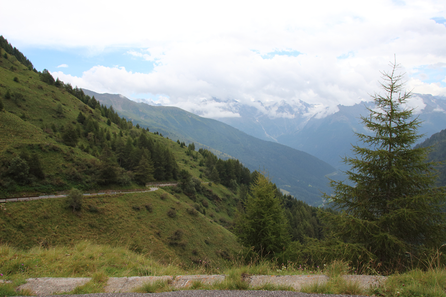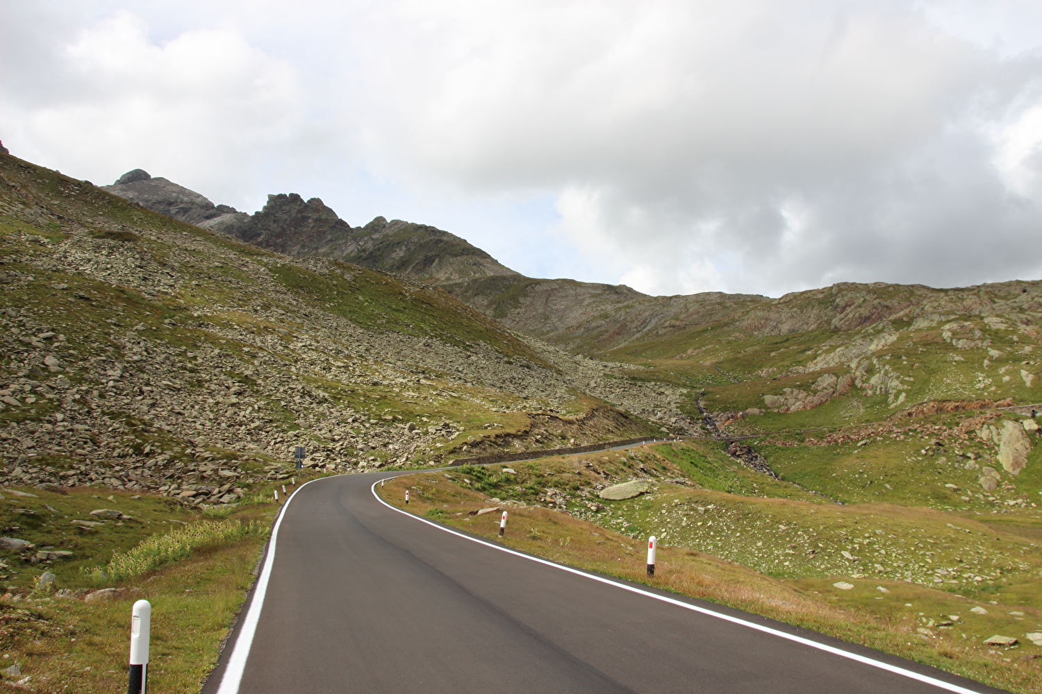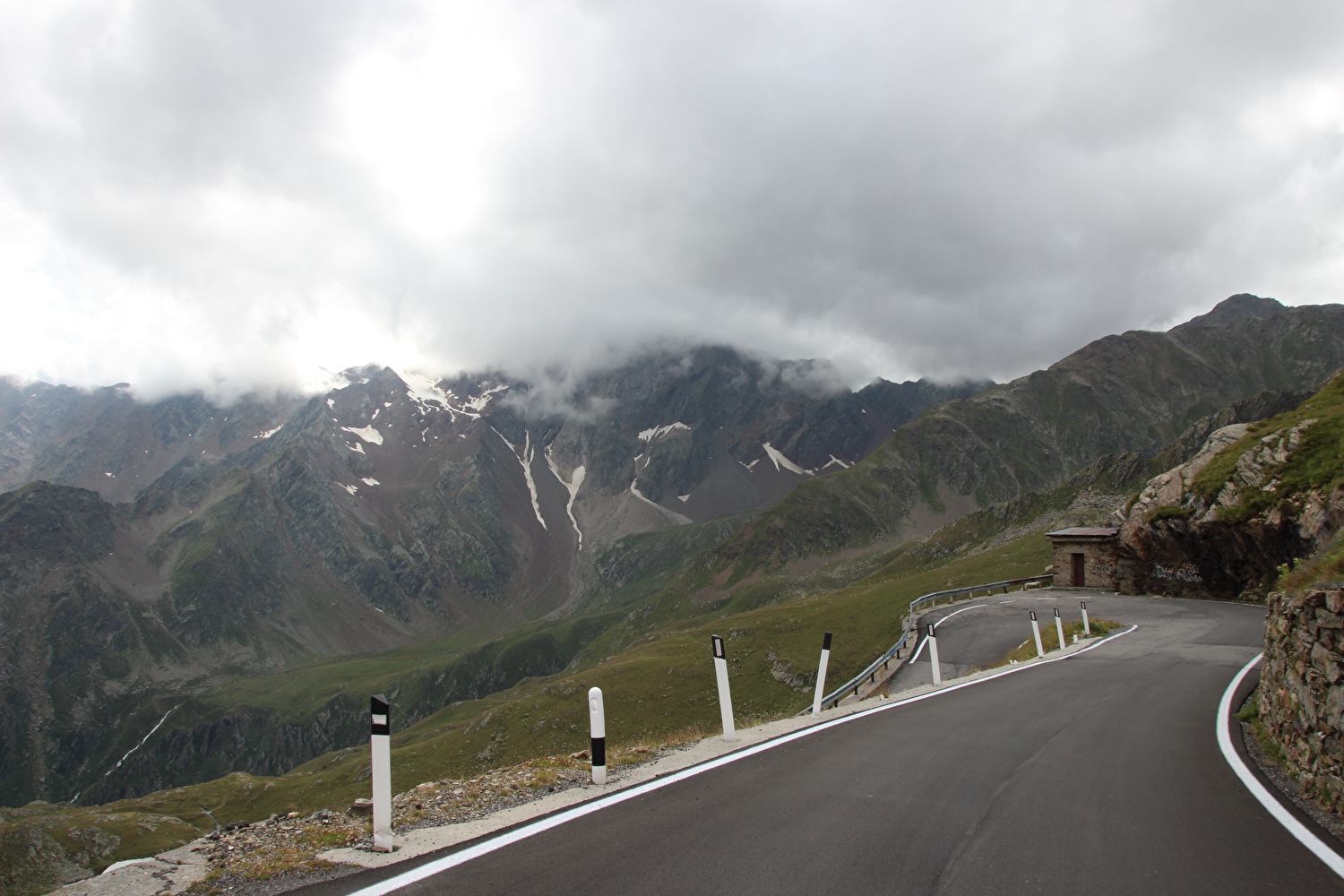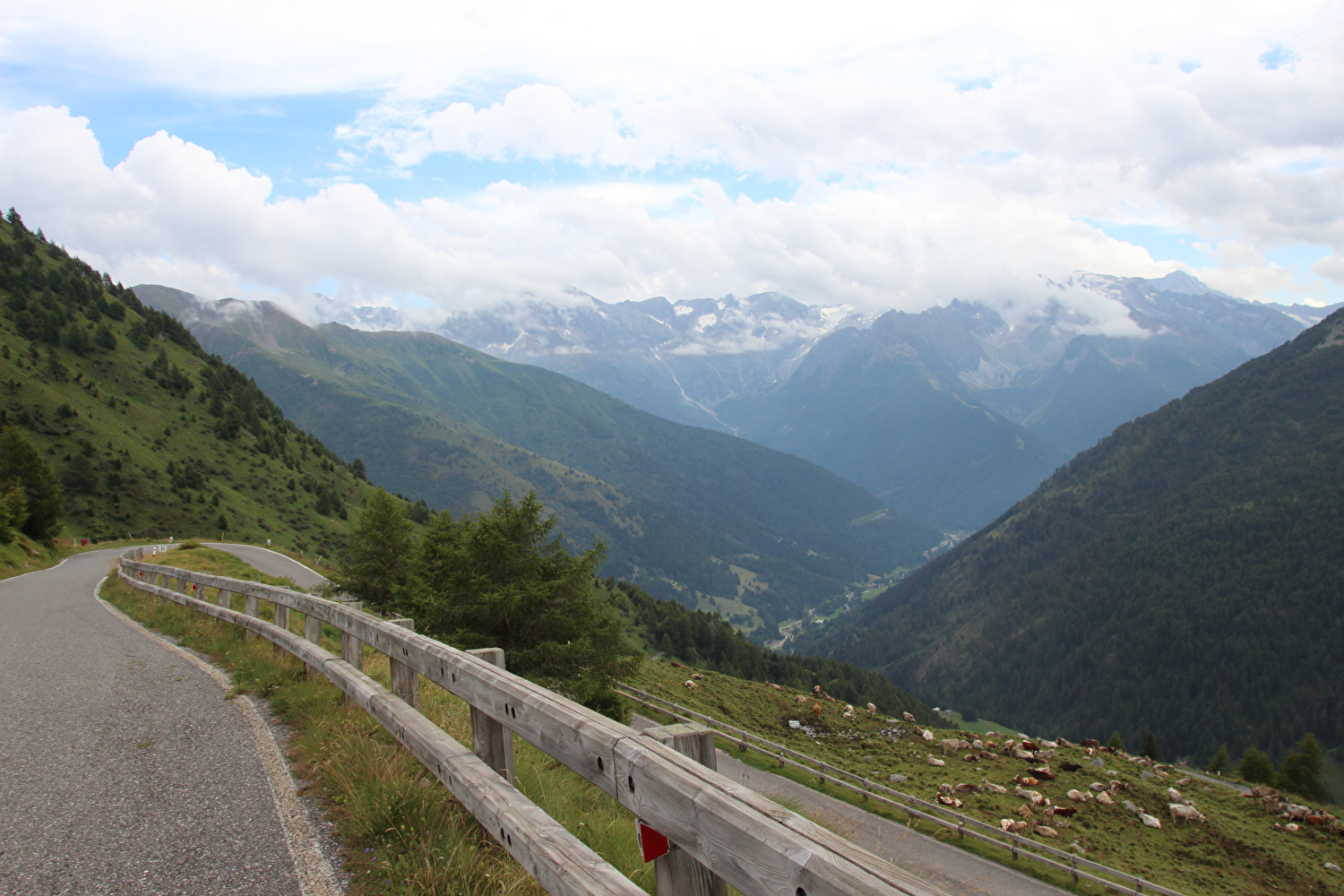 Beschreibung | Diese Etappe führte über den letzten über 2000 Meter hoch gelegenen Bergpass im Rahmen dieser Tour und auch ein letztes Mal in Regionen oberhalb der montanen Waldgrenze und montanen Baumgrenze. Die Strecke dieser Etappe war bereits vor drei Jahren schon einmal gefahren worden. Anders als damals lag auf dem Passo di Gavia dieses Mal nicht das „Dach der Tour“, denn das war im Rahmen dieser Tour bereits mit dem Passo dello Stelvio überquert worden. Am Morgen sah es nach Regen aus. Daher wurden Gepäck und Kamera auf Regenfahrt vorbereitet, aber für die Bergauffahrt noch keine Regenkleidung angelegt. Während des Anstiegs klarte es aber etwas auf und blieb vor allem trocken. Der eine oder andere Sturzbach (italienisch: Torrente) führte noch das Regenwasser der Nacht zu Tal. Ab Santa Caterina Valfurva windet sich die Nordrampe des Passo di Gavia mit einer Kehrengruppe bestehend aus 10 Kehren aus dem Valfurva in Richtung Val di Gavia. Danach folgt auf der nun kurvenärmeren Strecke nur noch im Bereich der Malga del'Alpe eine lang gezogene Kehre, die mit der Ponte del'Alpe den Torrente del'Alpe überquert. In Bereich der Malga del'Alpe überschreitet die Nordrampe die montane Waldgrenze. Nach der Kehre folgt das einzige etwas längere Steilstück mit einer durchschnittlichen Steigung von 11 %. Die Nordrampe überschreitet nun auch die montane Baumgrenze. Von dort bis zur Passhöhe verläuft die Nordrampe mit sehr moderater Steigung. Auf der Passhöhe hält sich hartnäckig die falsche Höhenangabe „2652 m“, obwohl die Passhöhe auf 2621 m s.l.m. liegt. Der Zustand der Strada Provinciale 29 del Gavia lässt streckenweise sehr zu wünschen übrig. Anders als die Passhöhe des Passo dello Stelvio war die Passhöhe des Passo di Gavia nicht überlaufen. Der Andrang hielt sich in überschaubaren Grenzen. Während des Aufenthalts auf der Passhöhe zog es sich zu und wurde mit nur noch +15 °C recht frisch. Nun kamen für die Abfahrt doch noch die bis dahin ungenutzt mitgeführten langen Klamotten inklusive Sturmhaube und Regenjacke als Windschutz zum Einsatz. Mit dieser Abfahrt folgte im Rahmen der Tour die dritte Abfahrt mit reichlich Höhenmetern bergab und entsprechend viel Arbeit für die Bremsen. Von der Passhöhe nach Ponte di Legno geht es 1363 Höhenmeter bergab. In der Abfahrt wurden im Rahmen dieser Tour zum letzten Mal die montane Baumgrenze und die montane Waldgrenze unterschritten. Damit endete der hochalpine Teil dieser Tour. Sehr ungewöhnlich war, dass die Temperatur von der Passhöhe bis zur die montanen Waldgrenze um gerade einmal 2 K von +15 °C auf +17 °C stieg. Erst sehr viel weiter unten mit der Annäherung ans Valcamonica stieg die Temperatur merklich an. In Ponte di Legno fiel während des Abendessens ein Regenschauer als Vorgeschmack auf die folgende Etappe. |