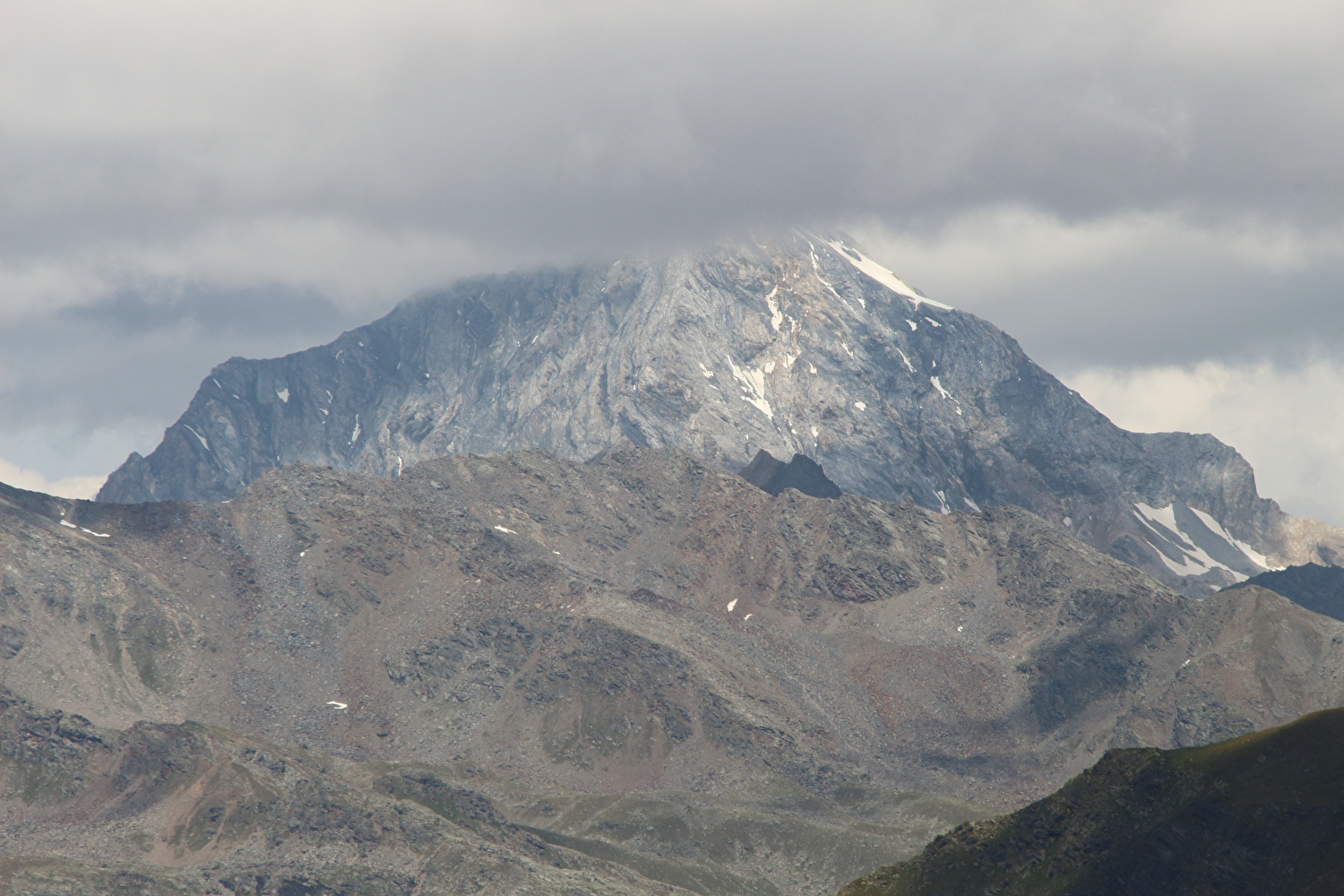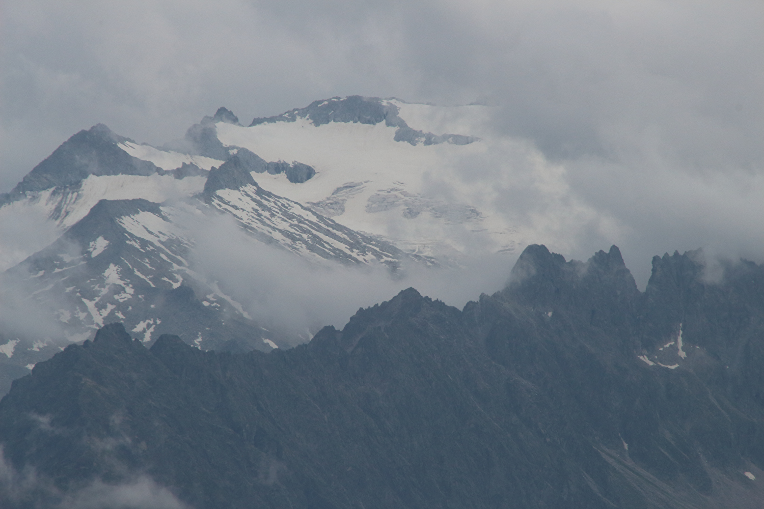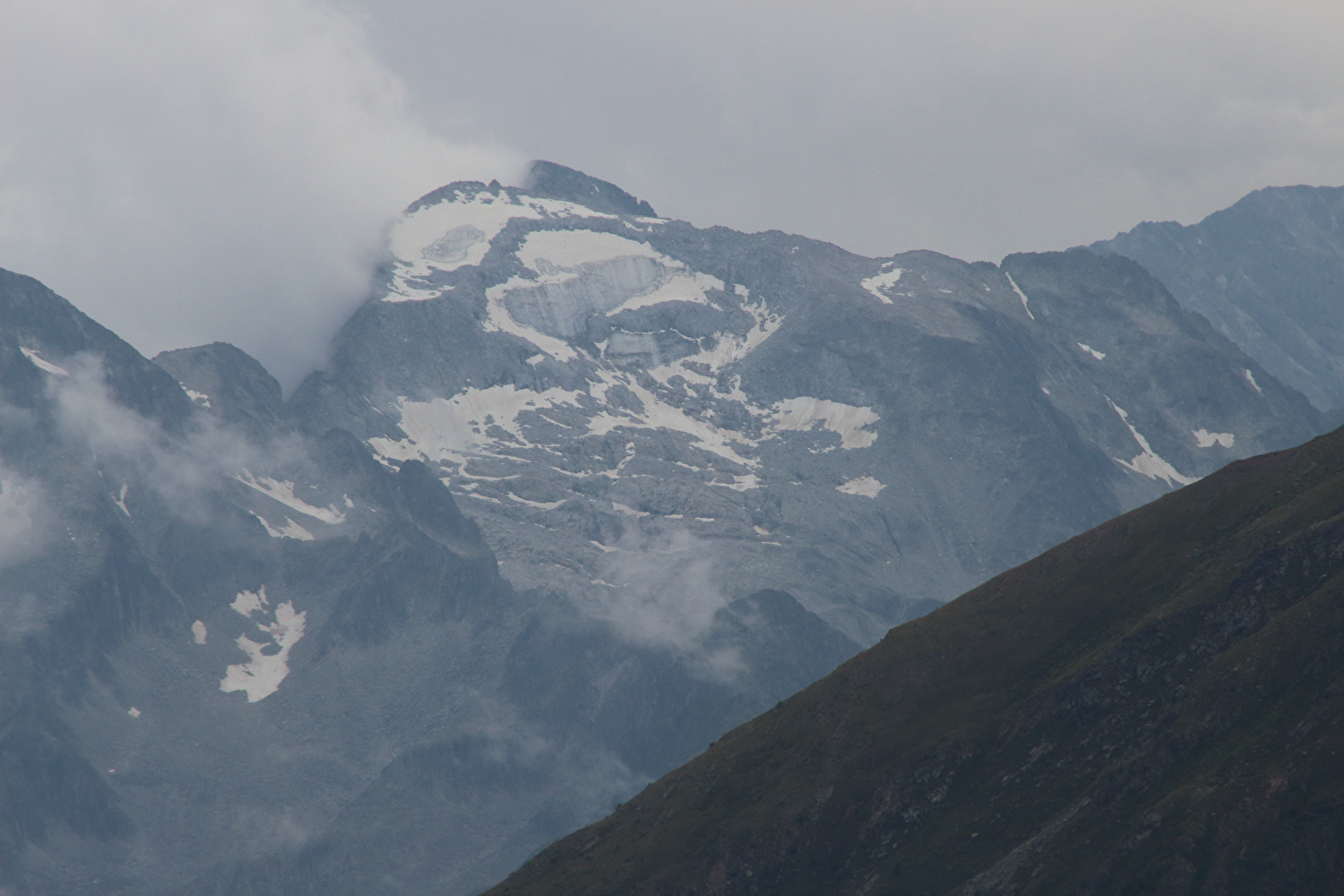 Blick über das Val di Forni auf Monte Pasquale und Monte Cevedale (Gipfel in Wolken) ![]() 300 dpi JPEG |