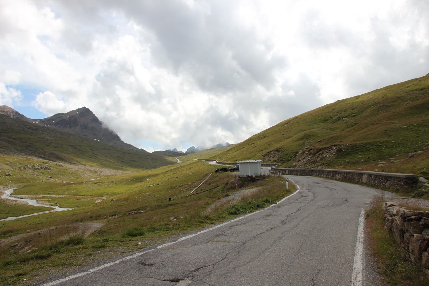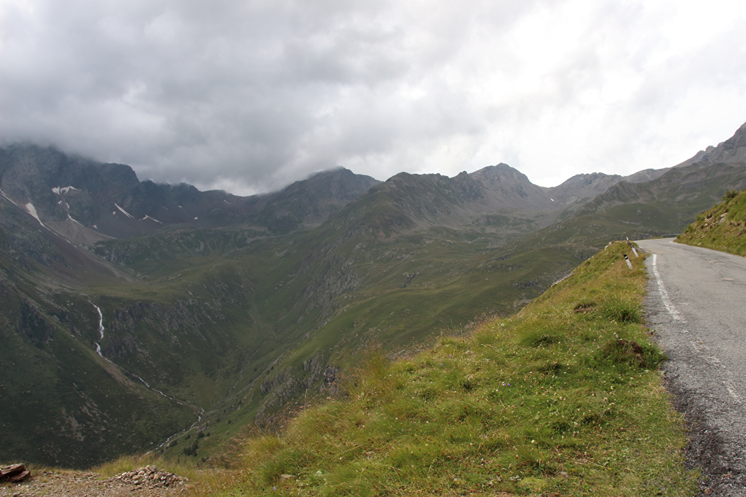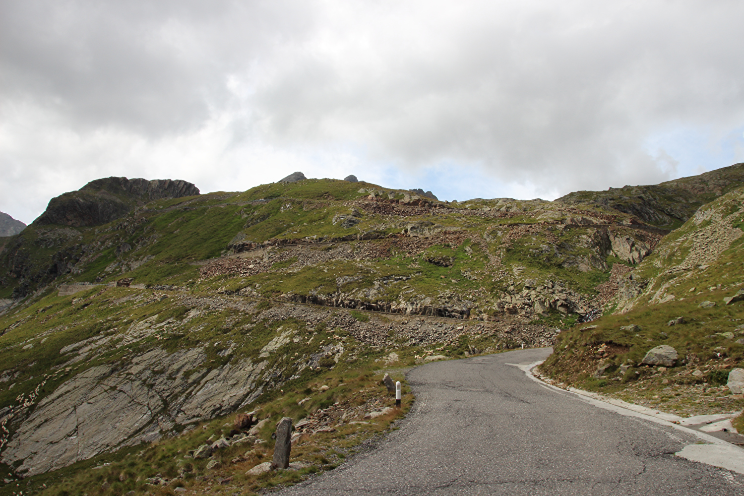 Blick über die oberste Kehre der Südrampe ins Val Malza und zur Punta di Pietra Rossa (Gipfel in Wolken) ![]() 300 dpi JPEG |