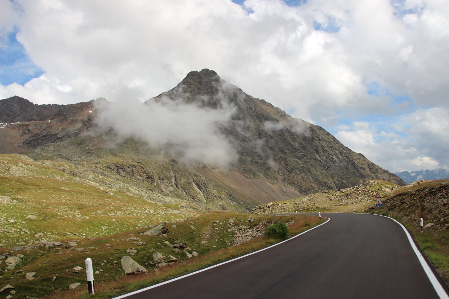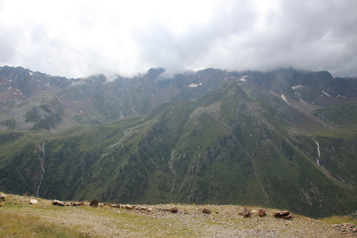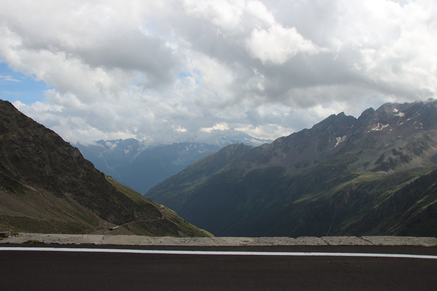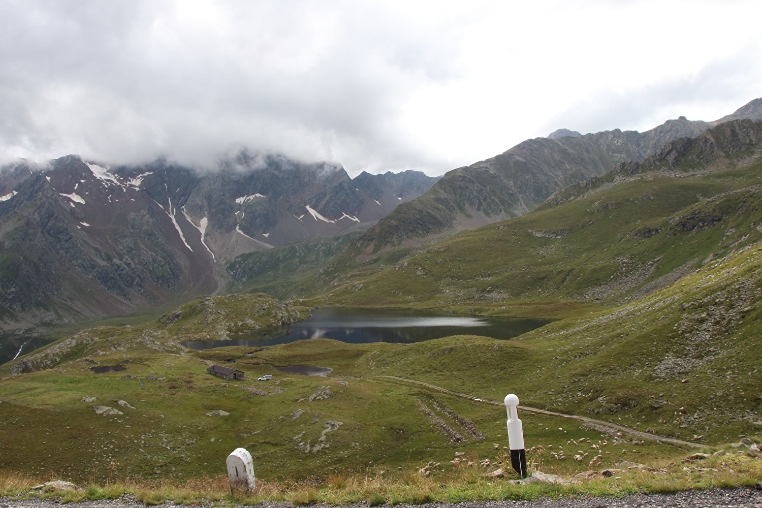 Blick über die oberste Kehre der Südrampe ins Val Malza und zur Punta di Pietra Rossa (Gipfel in Wolken) ![]() 300 dpi JPEG |