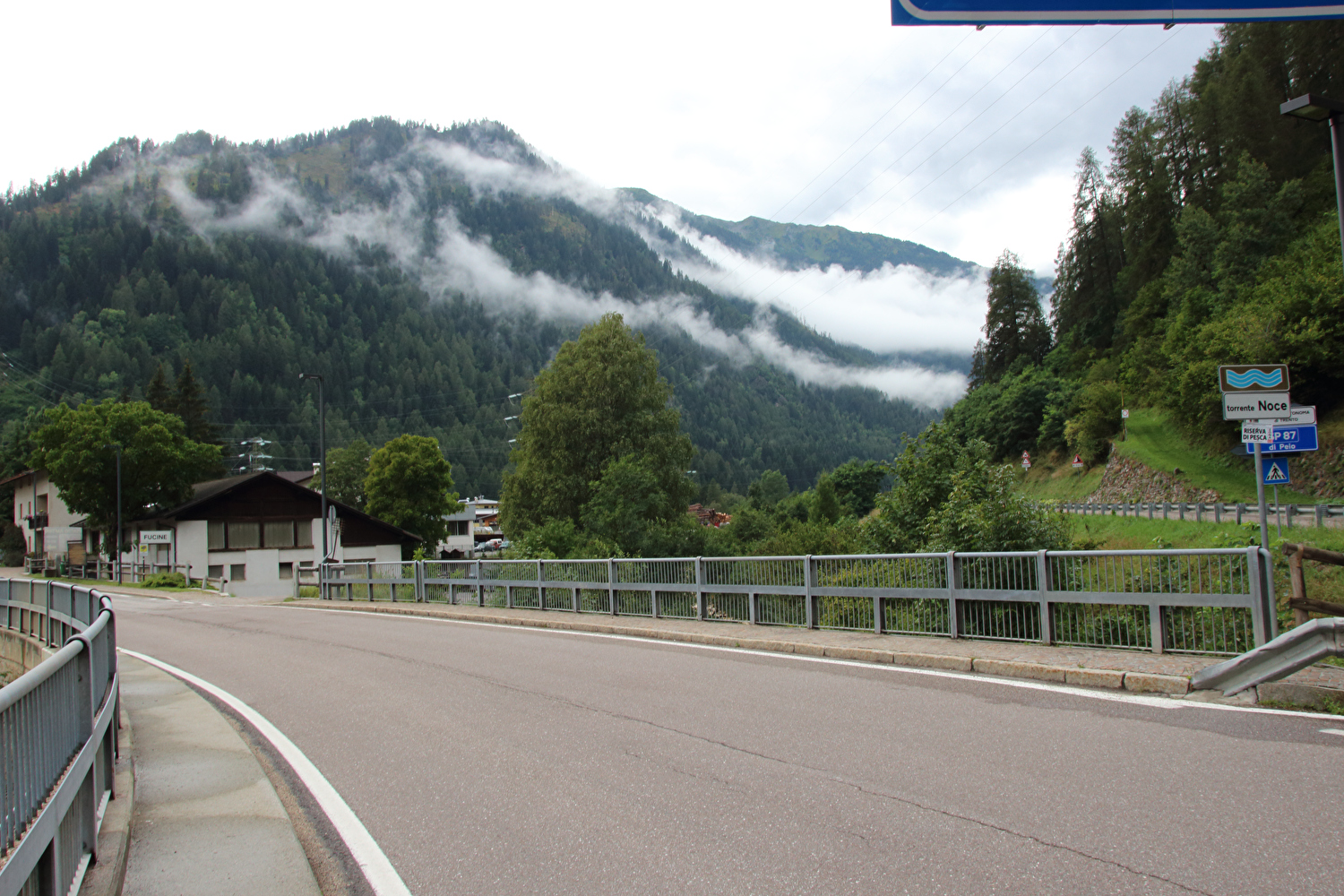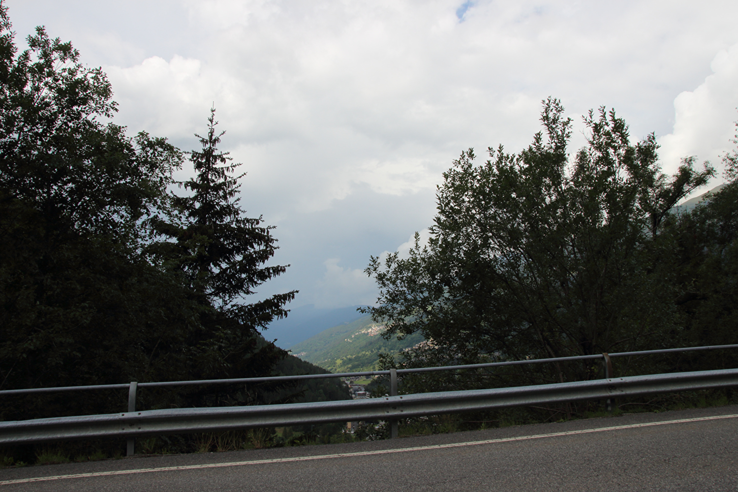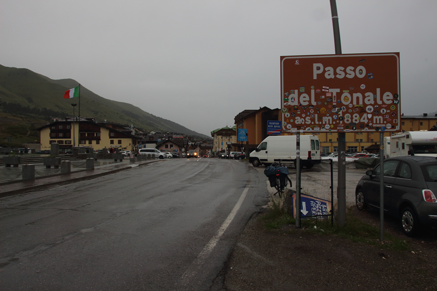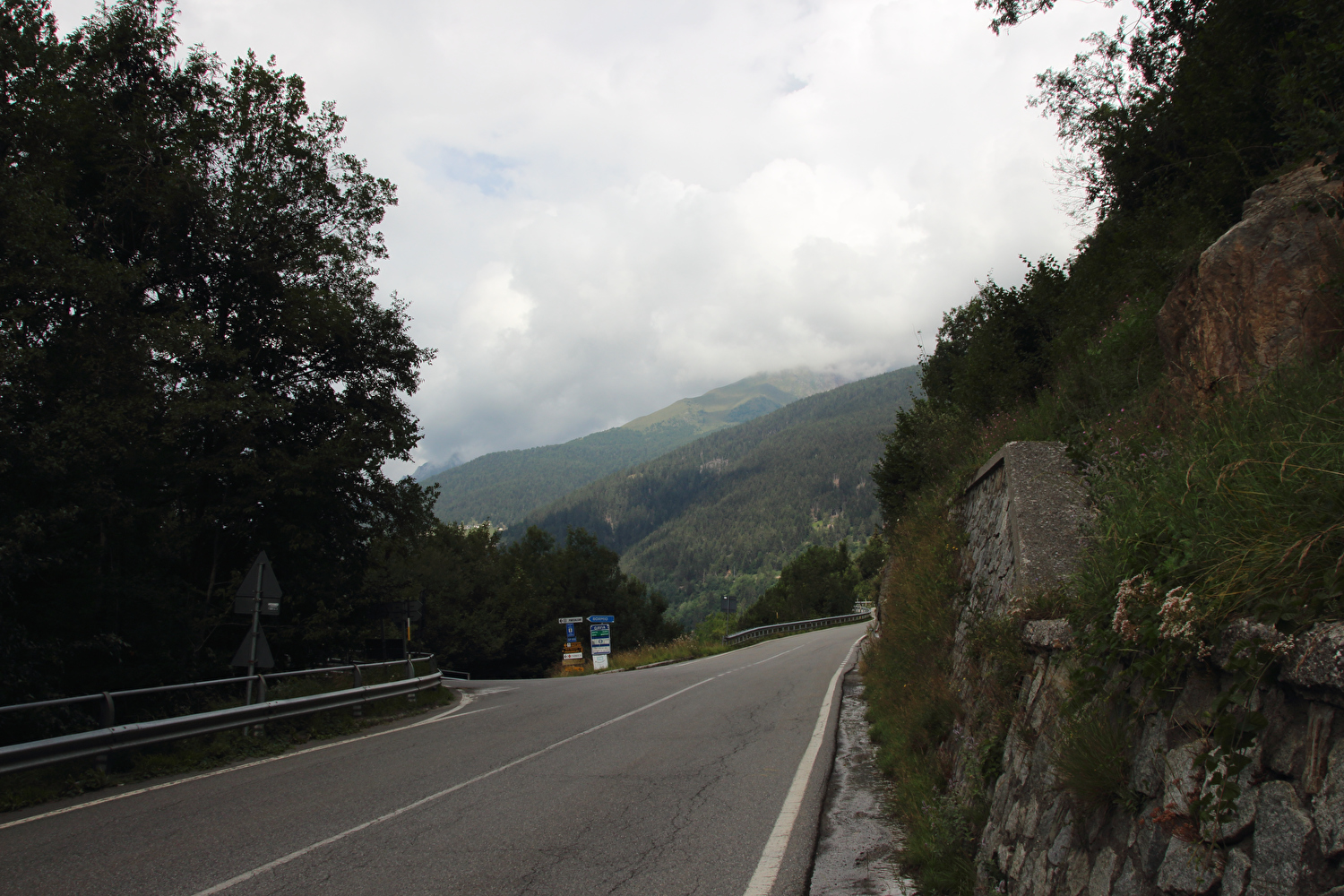 Beschreibung | Die Strecke dieser Etappe war bereits vor drei Jahren schon einmal gefahren worden. Dieses Mal endete die Etappe jedoch schon in Mestriago im Val di Sole. Zum Etappenstart schien die Sonne und es wurde schnell wärmer. Aber schon vor dem Erreichen des Abzweigs der Strada Provinciale 29 del Gavia von der Strada Statale 42 del Tonale e della Mendola zogen von Westen kommend über dem Valcamonica dunkle Wolken gefolgt von Regen auf. Als sich wenig später auch von Süden über die Gruppo dell'Adamello kommend Regenwolken zeigten, wurde in der von Ponte di Legno aus gezählten vierten Kehre gehalten und Gepäck und Kamera wurden auf Regenfahrt vorbereitet. Dann fielen auch schon die ersten Tropfen. Da es noch recht warm war, wurden nur Regenjacke und Regen-Helmüberzieher für die Bergauffahrt angelegt. Der Regen intensivierte sich rasch und dann kam auch noch ein Gewitter dazu. Unterhalb der von Ponte di Legno aus gezählten fünften und sechsten Kehre, mit denen die Passtraße eine Talstufe im Valcamonica überwindet, wurde an einem geschlossenen Hotel untergezogen und das Gewitter abgewartet. Nach einer halben Stunde konnte die Fahrt bei starkem Regen fortgesetzt werden. Der Regen hielt bis zur Passhöhe des Passo del Tonale an. Auf der ausgesprochen hässlichen Passhöhe war der Regen dann auch irgendwie egal. Da sich am Westhorizont wieder blauer Himmel zeigte, wurde die Mittagspause auf der Passhöhe etwas in die Länge gezogen. Der Regen hörte während der Mittagspause auf, aber die Wolken blieben, wodurch es entsprechend kalt blieb. Daher erfolgte die Abfahrt ins Val di Sole in langen Klamotten. Trotz Wolken und stellenweise Nebel boten sich einige Blicke auf Berge mit Gletscherresten in der Gruppo dell'Adamello. Val di Sole bedeutet auf Deutsch „Tal der Sonne“, aber die Sonne schimmerte selbst zum Ende der Etappe nur matt durch einen Grauschleier aus Schichtwolken. Etwa ab Fucine abwärts nimmt das Val di Sole deutlich voralpinen Charakter an, und die Straße fällt nur noch gemächlich ab. |