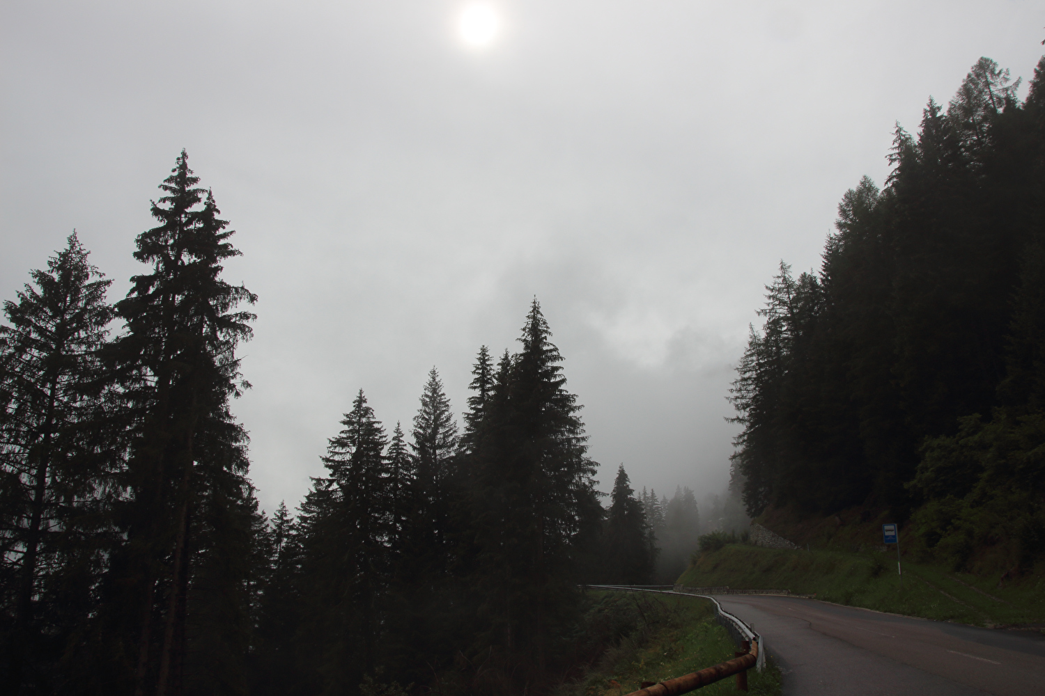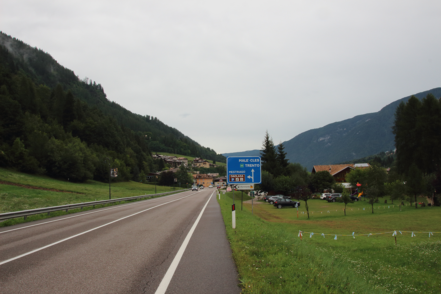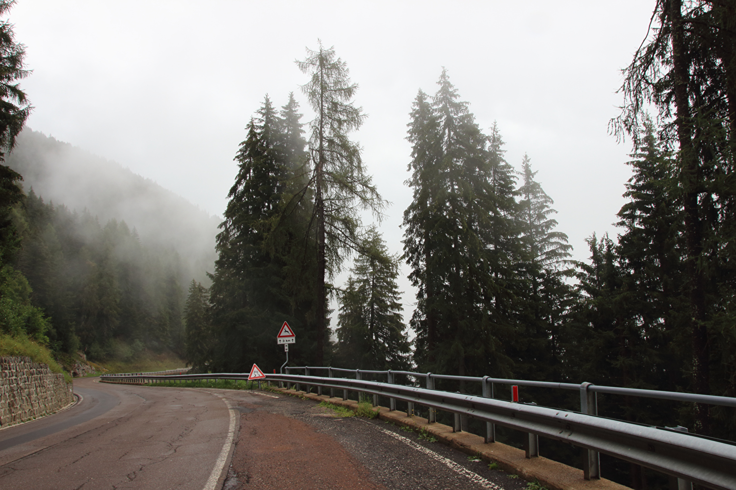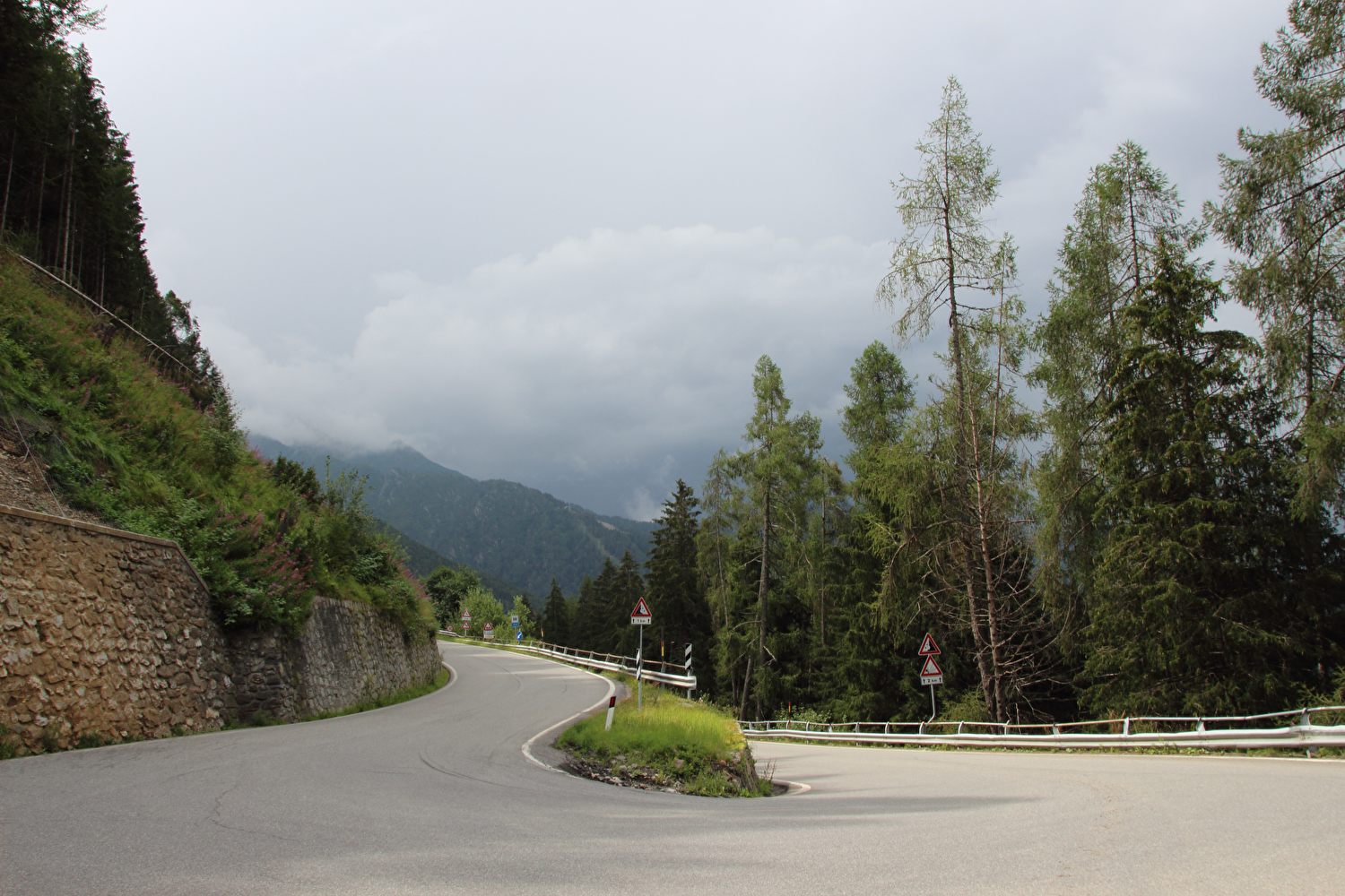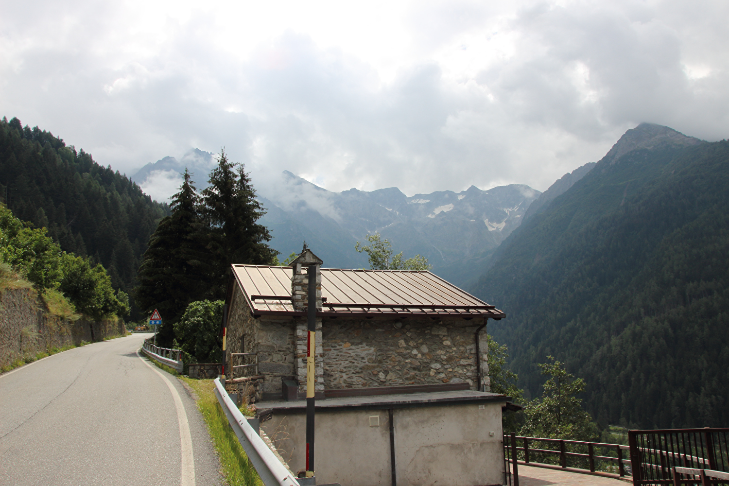 Beschreibung | Die Strecke dieser Etappe war bereits vor drei Jahren schon einmal gefahren worden. Dieses Mal endete die Etappe jedoch schon in Mestriago im Val di Sole. Zum Etappenstart schien die Sonne und es wurde schnell wärmer. Aber schon vor dem Erreichen des Abzweigs der Strada Provinciale 29 del Gavia von der Strada Statale 42 del Tonale e della Mendola zogen von Westen kommend über dem Valcamonica dunkle Wolken gefolgt von Regen auf. Als sich wenig später auch von Süden über die Gruppo dell'Adamello kommend Regenwolken zeigten, wurde in der von Ponte di Legno aus gezählten vierten Kehre gehalten und Gepäck und Kamera wurden auf Regenfahrt vorbereitet. Dann fielen auch schon die ersten Tropfen. Da es noch recht warm war, wurden nur Regenjacke und Regen-Helmüberzieher für die Bergauffahrt angelegt. Der Regen intensivierte sich rasch und dann kam auch noch ein Gewitter dazu. Unterhalb der von Ponte di Legno aus gezählten fünften und sechsten Kehre, mit denen die Passtraße eine Talstufe im Valcamonica überwindet, wurde an einem geschlossenen Hotel untergezogen und das Gewitter abgewartet. Nach einer halben Stunde konnte die Fahrt bei starkem Regen fortgesetzt werden. Der Regen hielt bis zur Passhöhe des Passo del Tonale an. Auf der ausgesprochen hässlichen Passhöhe war der Regen dann auch irgendwie egal. Da sich am Westhorizont wieder blauer Himmel zeigte, wurde die Mittagspause auf der Passhöhe etwas in die Länge gezogen. Der Regen hörte während der Mittagspause auf, aber die Wolken blieben, wodurch es entsprechend kalt blieb. Daher erfolgte die Abfahrt ins Val di Sole in langen Klamotten. Trotz Wolken und stellenweise Nebel boten sich einige Blicke auf Berge mit Gletscherresten in der Gruppo dell'Adamello. Val di Sole bedeutet auf Deutsch „Tal der Sonne“, aber die Sonne schimmerte selbst zum Ende der Etappe nur matt durch einen Grauschleier aus Schichtwolken. Etwa ab Fucine abwärts nimmt das Val di Sole deutlich voralpinen Charakter an, und die Straße fällt nur noch gemächlich ab. |
