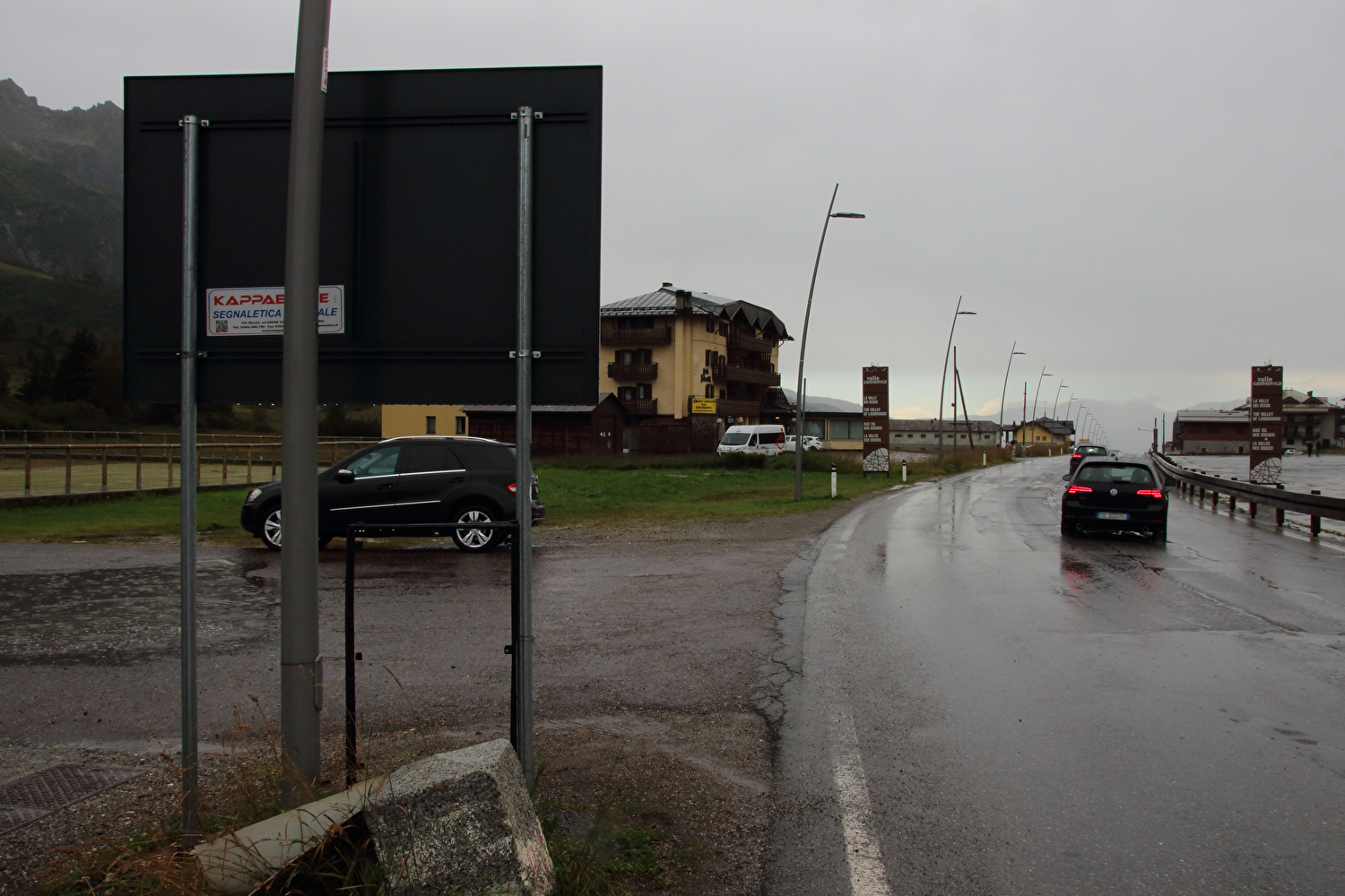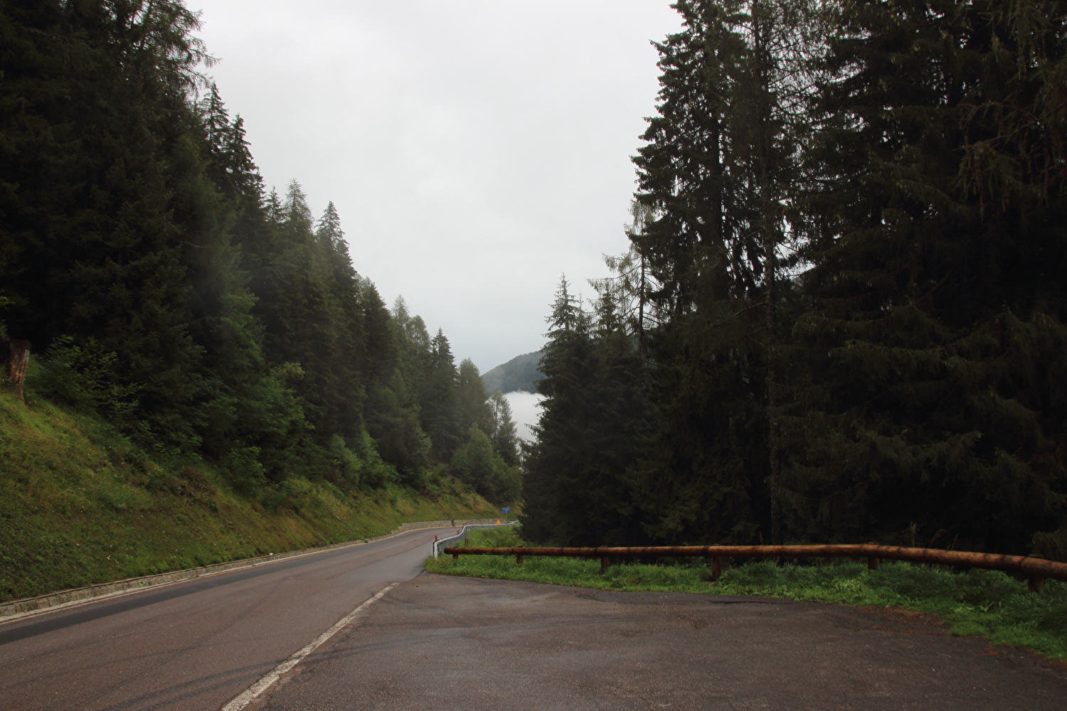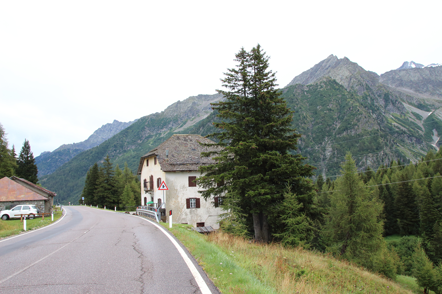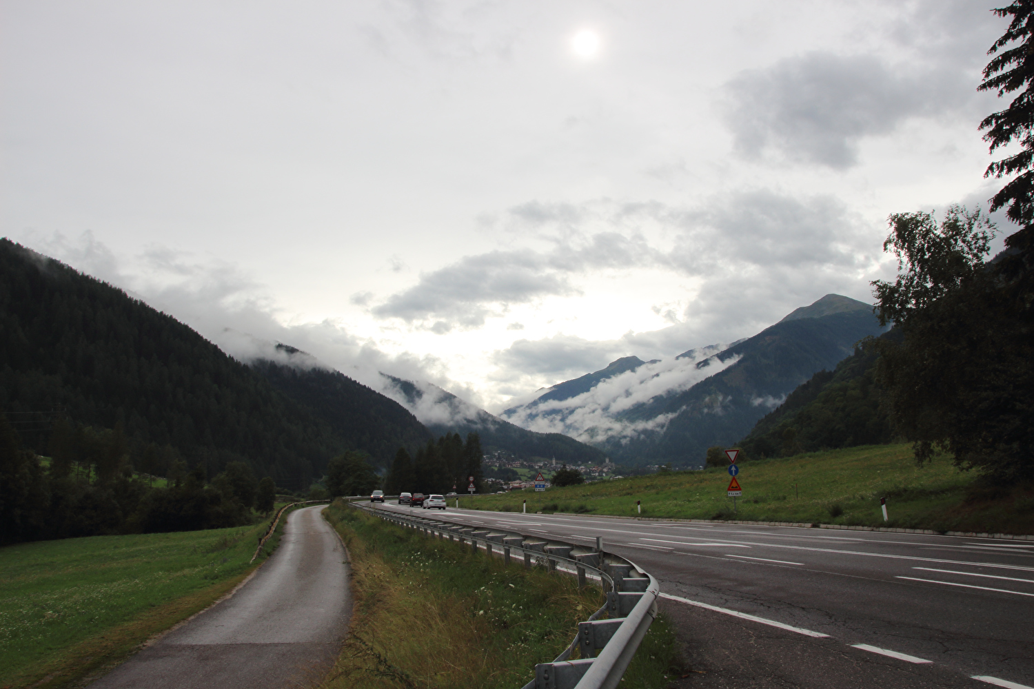 Beschreibung | Die Strecke dieser Etappe war bereits vor drei Jahren schon einmal gefahren worden. Dieses Mal endete die Etappe jedoch schon in Mestriago im Val di Sole. Zum Etappenstart schien die Sonne und es wurde schnell wärmer. Aber schon vor dem Erreichen des Abzweigs der Strada Provinciale 29 del Gavia von der Strada Statale 42 del Tonale e della Mendola zogen von Westen kommend über dem Valcamonica dunkle Wolken gefolgt von Regen auf. Als sich wenig später auch von Süden über die Gruppo dell'Adamello kommend Regenwolken zeigten, wurde in der von Ponte di Legno aus gezählten vierten Kehre gehalten und Gepäck und Kamera wurden auf Regenfahrt vorbereitet. Dann fielen auch schon die ersten Tropfen. Da es noch recht warm war, wurden nur Regenjacke und Regen-Helmüberzieher für die Bergauffahrt angelegt. Der Regen intensivierte sich rasch und dann kam auch noch ein Gewitter dazu. Unterhalb der von Ponte di Legno aus gezählten fünften und sechsten Kehre, mit denen die Passtraße eine Talstufe im Valcamonica überwindet, wurde an einem geschlossenen Hotel untergezogen und das Gewitter abgewartet. Nach einer halben Stunde konnte die Fahrt bei starkem Regen fortgesetzt werden. Der Regen hielt bis zur Passhöhe des Passo del Tonale an. Auf der ausgesprochen hässlichen Passhöhe war der Regen dann auch irgendwie egal. Da sich am Westhorizont wieder blauer Himmel zeigte, wurde die Mittagspause auf der Passhöhe etwas in die Länge gezogen. Der Regen hörte während der Mittagspause auf, aber die Wolken blieben, wodurch es entsprechend kalt blieb. Daher erfolgte die Abfahrt ins Val di Sole in langen Klamotten. Trotz Wolken und stellenweise Nebel boten sich einige Blicke auf Berge mit Gletscherresten in der Gruppo dell'Adamello. Val di Sole bedeutet auf Deutsch „Tal der Sonne“, aber die Sonne schimmerte selbst zum Ende der Etappe nur matt durch einen Grauschleier aus Schichtwolken. Etwa ab Fucine abwärts nimmt das Val di Sole deutlich voralpinen Charakter an, und die Straße fällt nur noch gemächlich ab. |