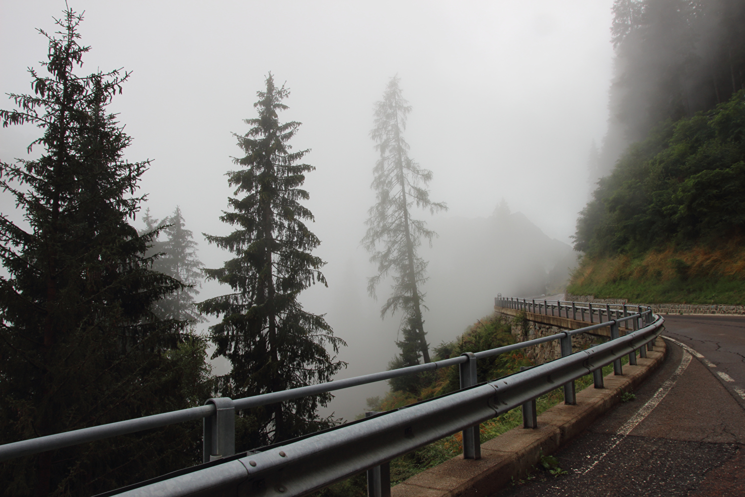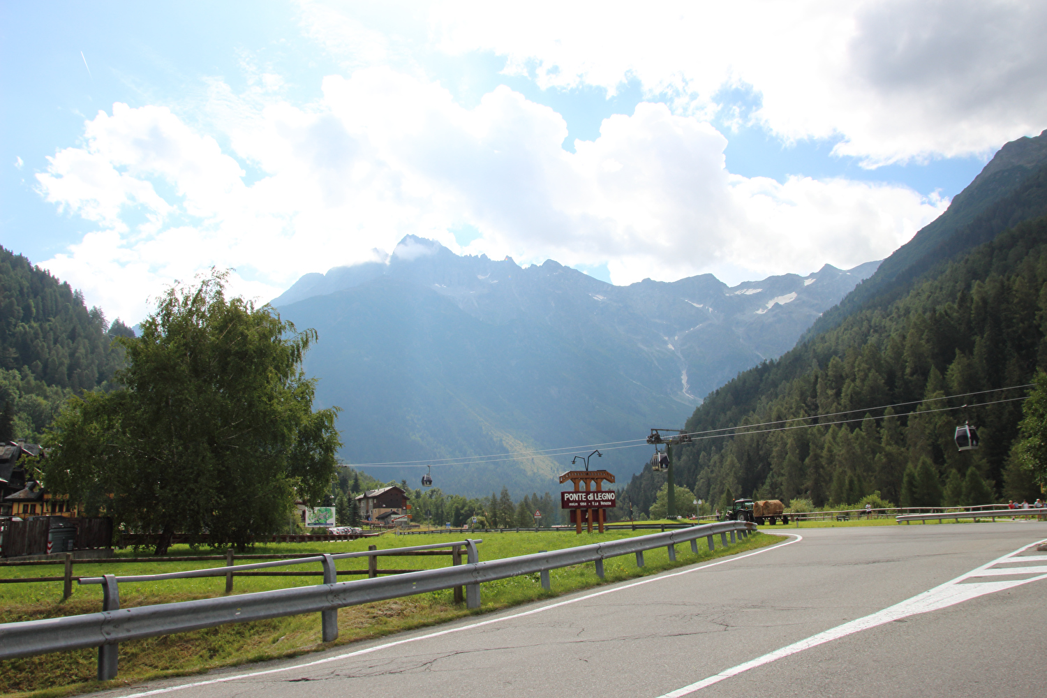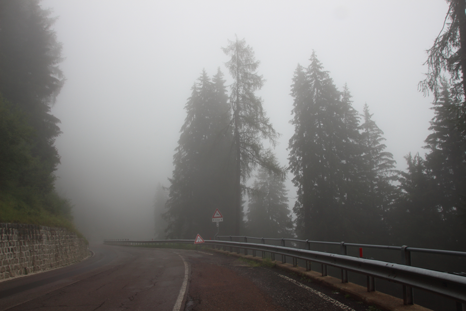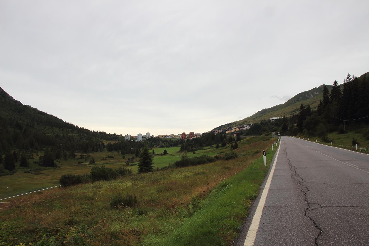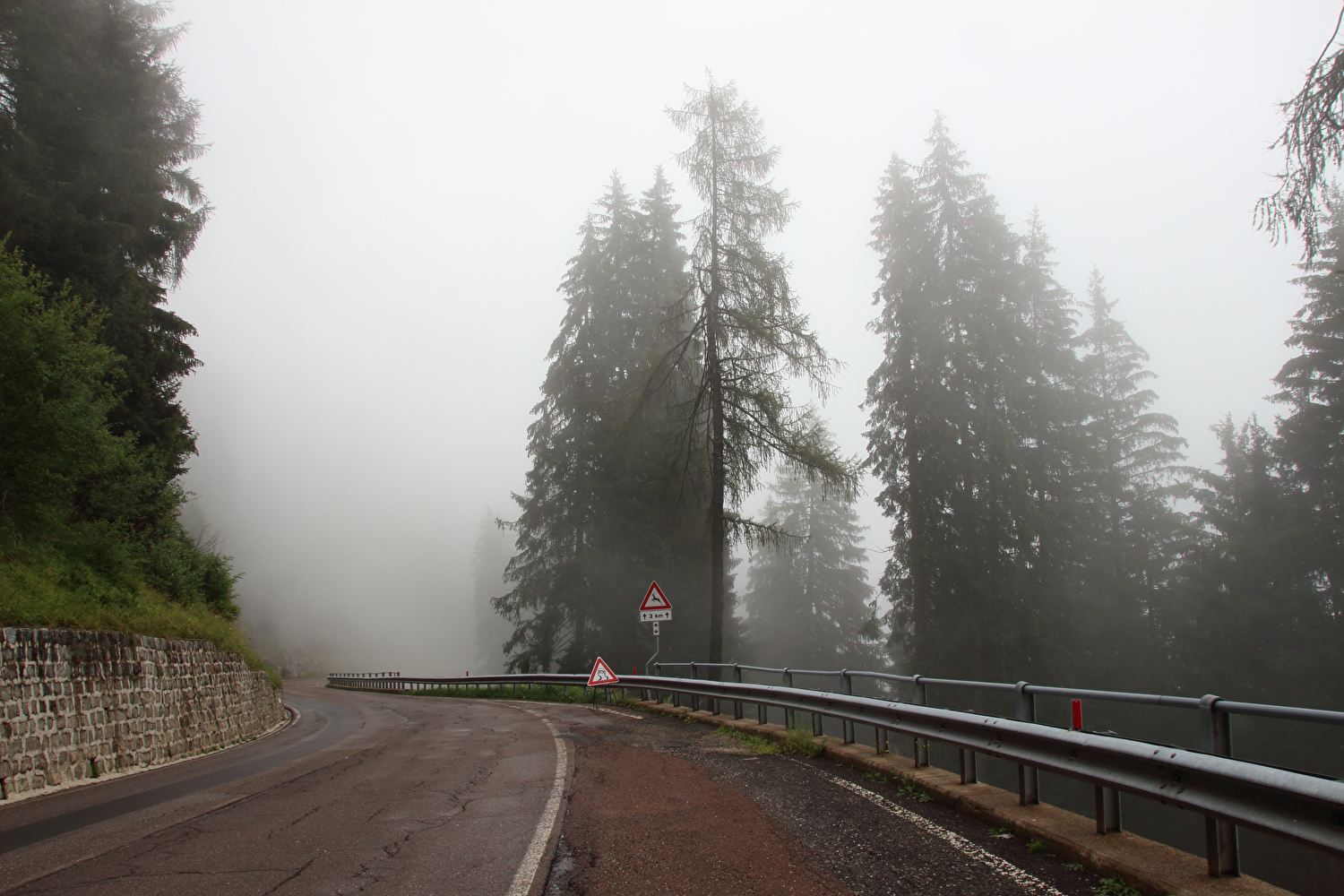 Beschreibung | Die Strecke dieser Etappe war bereits vor drei Jahren schon einmal gefahren worden. Dieses Mal endete die Etappe jedoch schon in Mestriago im Val di Sole. Zum Etappenstart schien die Sonne und es wurde schnell wärmer. Aber schon vor dem Erreichen des Abzweigs der Strada Provinciale 29 del Gavia von der Strada Statale 42 del Tonale e della Mendola zogen von Westen kommend über dem Valcamonica dunkle Wolken gefolgt von Regen auf. Als sich wenig später auch von Süden über die Gruppo dell'Adamello kommend Regenwolken zeigten, wurde in der von Ponte di Legno aus gezählten vierten Kehre gehalten und Gepäck und Kamera wurden auf Regenfahrt vorbereitet. Dann fielen auch schon die ersten Tropfen. Da es noch recht warm war, wurden nur Regenjacke und Regen-Helmüberzieher für die Bergauffahrt angelegt. Der Regen intensivierte sich rasch und dann kam auch noch ein Gewitter dazu. Unterhalb der von Ponte di Legno aus gezählten fünften und sechsten Kehre, mit denen die Passtraße eine Talstufe im Valcamonica überwindet, wurde an einem geschlossenen Hotel untergezogen und das Gewitter abgewartet. Nach einer halben Stunde konnte die Fahrt bei starkem Regen fortgesetzt werden. Der Regen hielt bis zur Passhöhe des Passo del Tonale an. Auf der ausgesprochen hässlichen Passhöhe war der Regen dann auch irgendwie egal. Da sich am Westhorizont wieder blauer Himmel zeigte, wurde die Mittagspause auf der Passhöhe etwas in die Länge gezogen. Der Regen hörte während der Mittagspause auf, aber die Wolken blieben, wodurch es entsprechend kalt blieb. Daher erfolgte die Abfahrt ins Val di Sole in langen Klamotten. Trotz Wolken und stellenweise Nebel boten sich einige Blicke auf Berge mit Gletscherresten in der Gruppo dell'Adamello. Val di Sole bedeutet auf Deutsch „Tal der Sonne“, aber die Sonne schimmerte selbst zum Ende der Etappe nur matt durch einen Grauschleier aus Schichtwolken. Etwa ab Fucine abwärts nimmt das Val di Sole deutlich voralpinen Charakter an, und die Straße fällt nur noch gemächlich ab. |