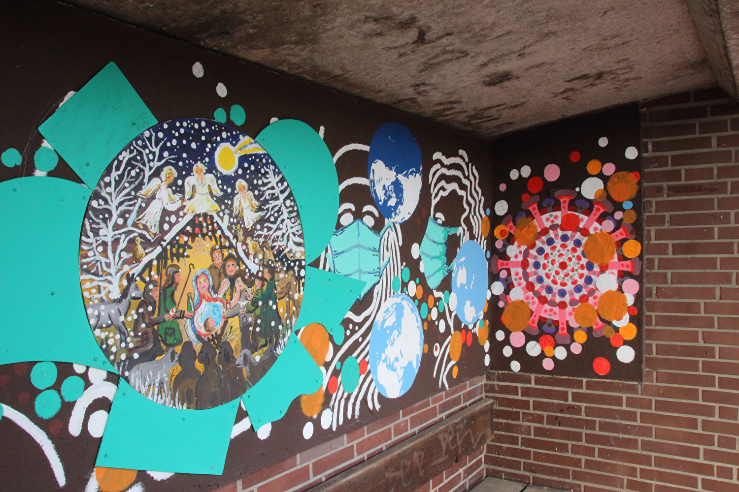 Beschreibung | Viel zu spät im Jahr wurde die erste Tour gestartet. Dieser Tag war der erste im Jahr, an dem kein widerliches nasskaltes Winterwetter herrschte. Während der Tour kam sogar noch die Sonne raus. Weiter oben im Deister war auf die Distanz eine geschlossene Schneedecke zu erkennen. Dazu passend blühte auf einigen Feldern der dort als Zwischenfrucht angebaute Raps (Brassica napus). Bei der Vorbeifahrt an der Bushaltestelle „Lenthe / Badenstedter Straße“ fiel ein Wandbild im Bushäuschen auf. Im Vordergrund zeigt es mehr oder weniger stilisiert eine Weihnachtsszene (kurz nach Jesu Geburt im Stall), die Erde aus drei Perspekiven (Nordpolarregion mit Eurasien und Nordamerika, Südpolarregion mit Antarktis und Australien, Äquatorregion mit Afrika und Eurasien) und ein SARS-CoV2. Im Hintergrund zeigt es zwei Gesichter mit Alltagsmasken und viele kleine flächig gefüllte Kreise. Was soll das? |