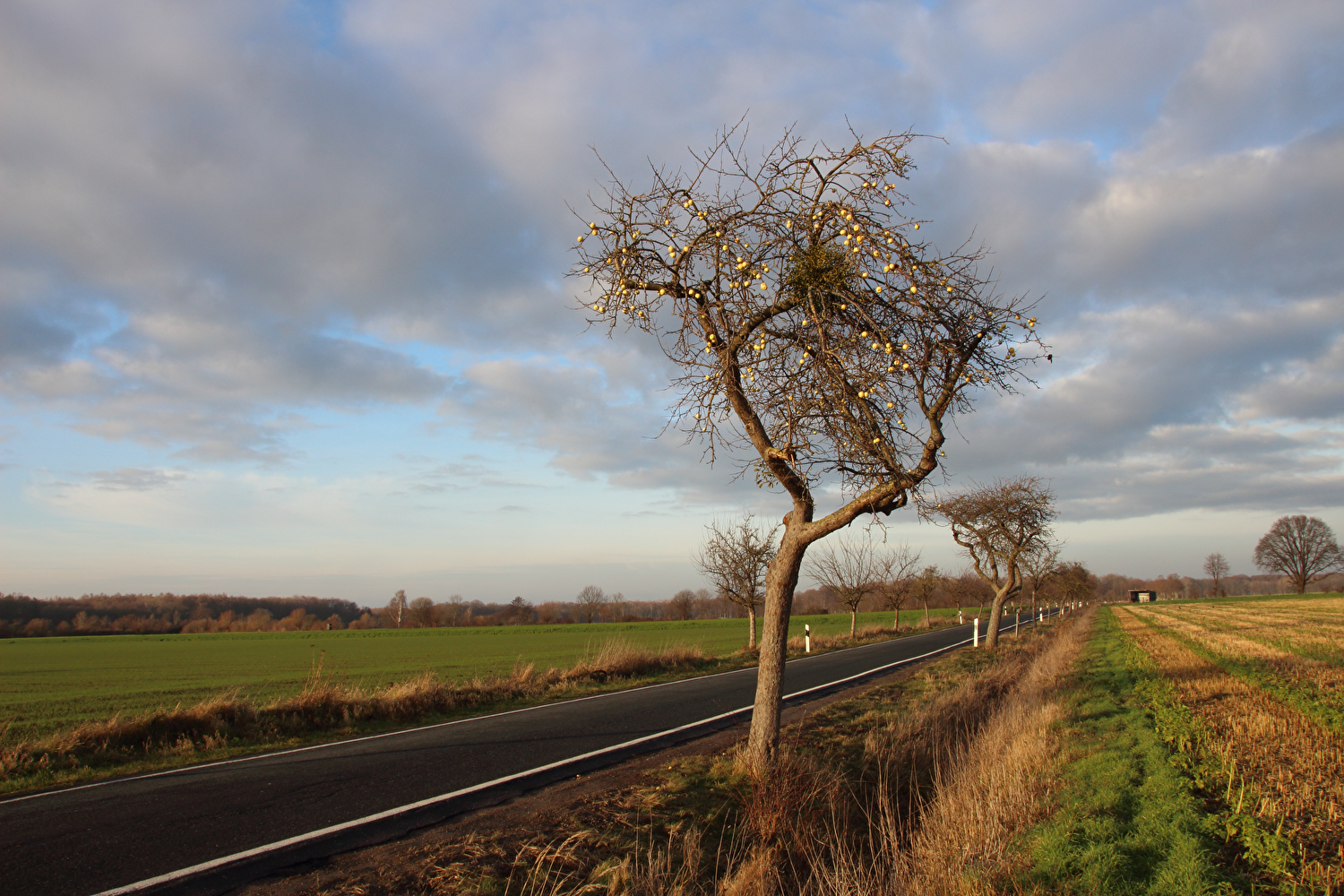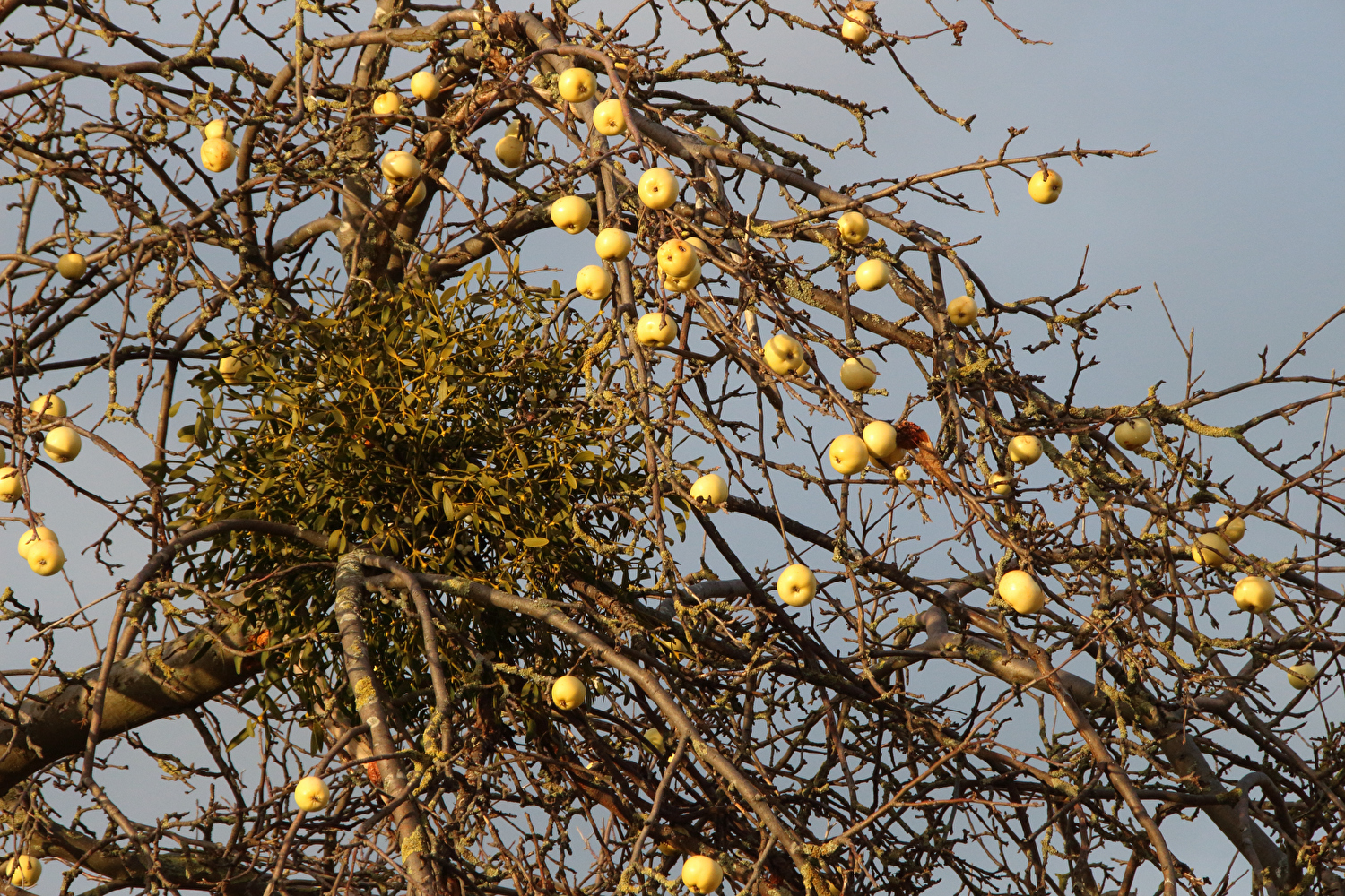 Zoom auf die „Winteräpfel“ und eine Weißbeerige Mistel (Viscum album) ![]() 300 dpi JPEG |