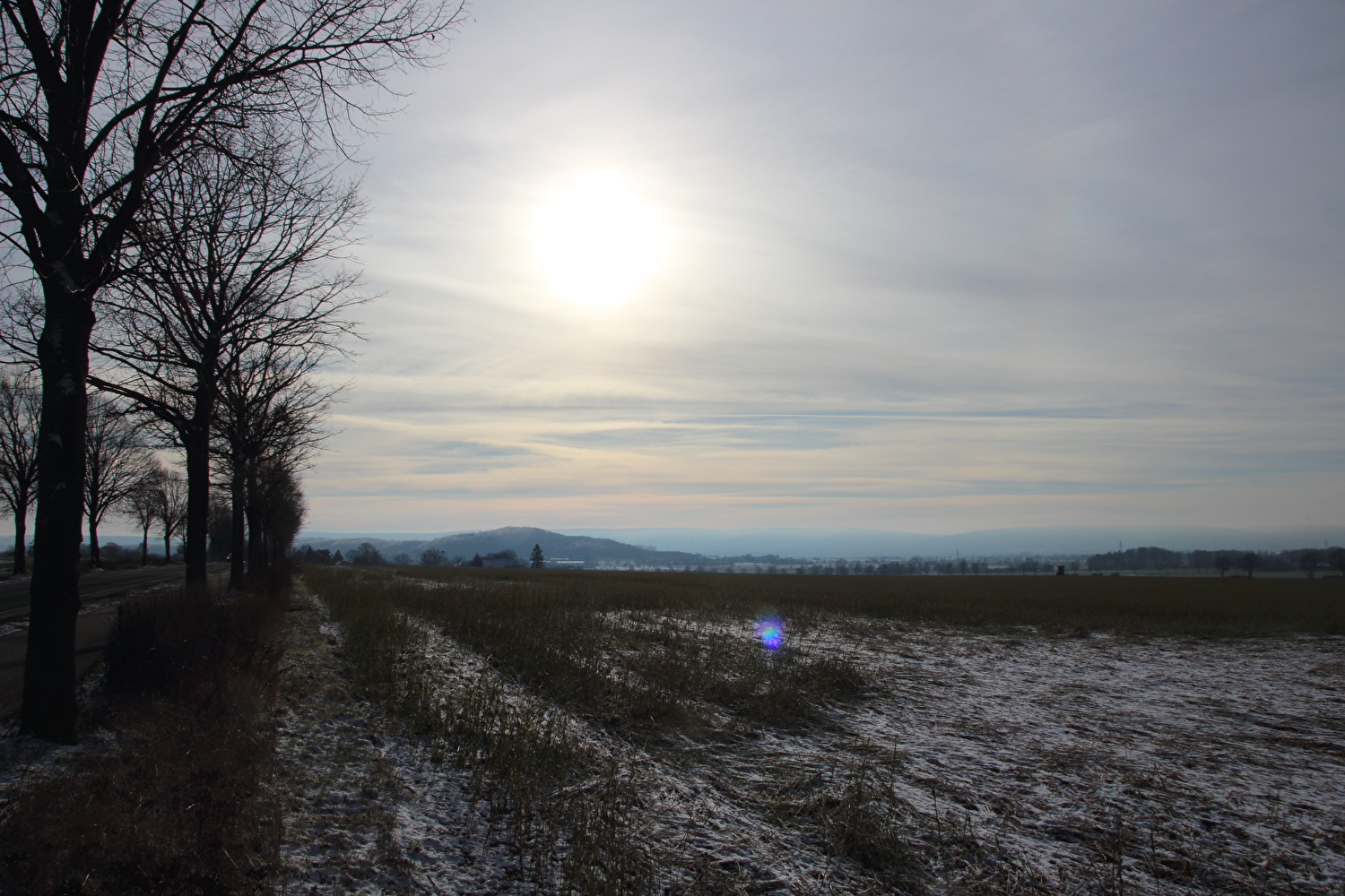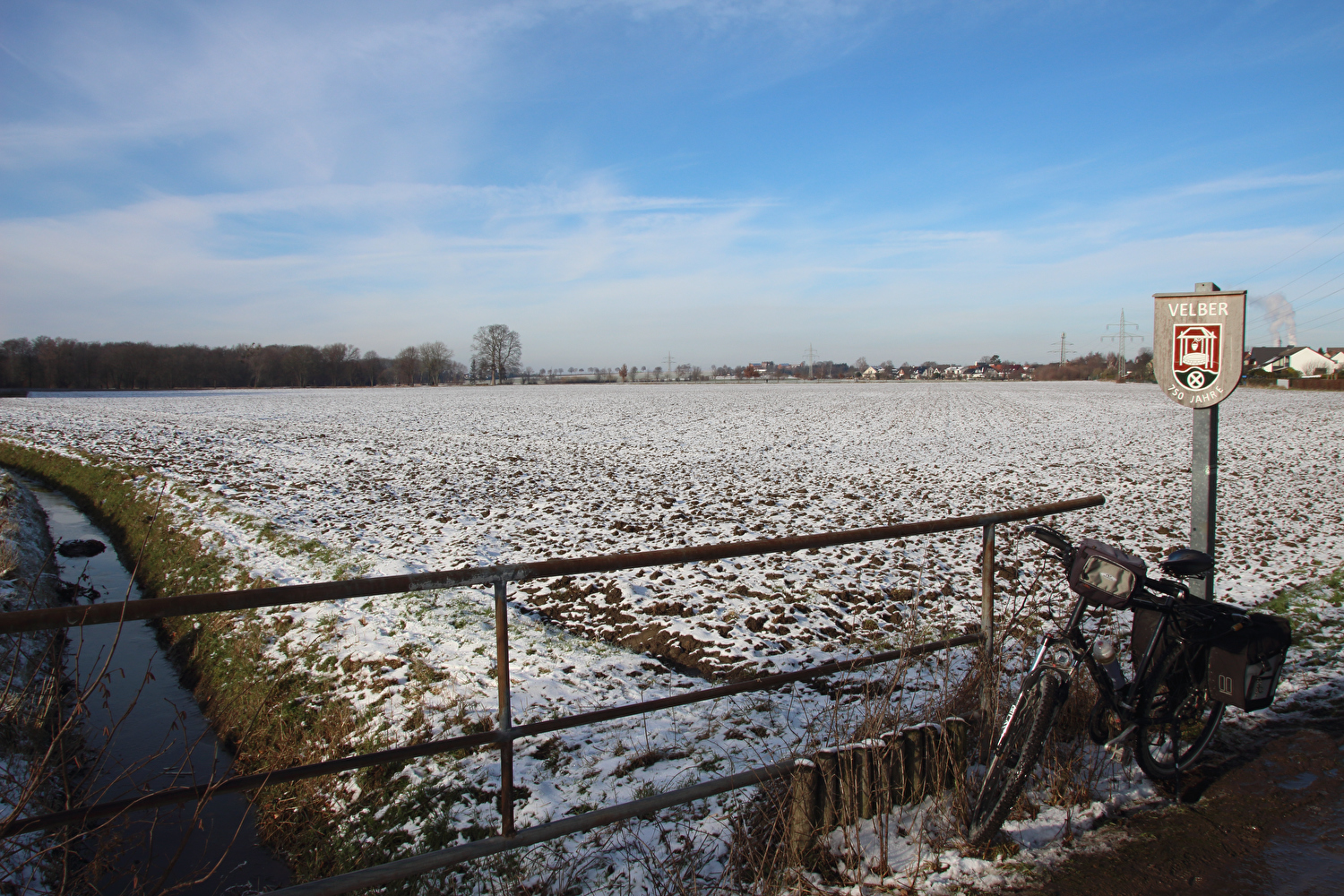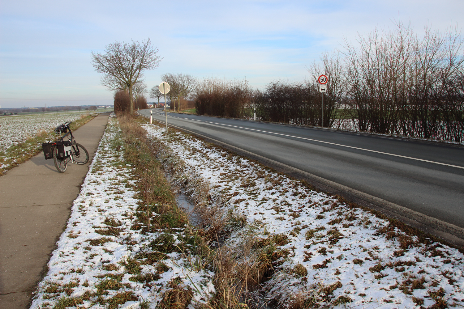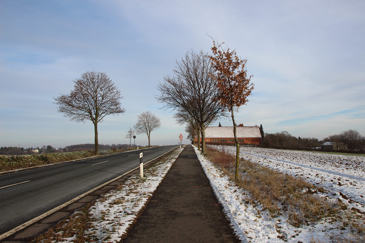 Beschreibung | Der widerlich weiße Winter hatte Einzug gehalten. Dazu gibt es ein passendes Lied (Text & Noten). Da eine Fahrt über den Benther Berg geplant war, wurde mit dem geländegängigen Fahrrad gefahren. Der ziemlich vereiste Weg südlich von Velber ließ aber schon Böses erahnen. Am Nordhang des Benther Berges zeigte sich der Weg bergauf derart vereist, dass von einer Fahrt über den an diesem Tag zudem reichlich überbevölkerten Benther Berg abgesehen wurde. Die Tour wurde daher „auf Asphalt“ fortgesetzt, wofür das geländegängige Fahrrad nicht ideal war. Pünktlich zu Tourbeginn schoben sich Schleierwolken vor die Sonne. Die schien da zwar durch, aber die Temperatur sank schnell von +4 °C auf +2 °C und lag bei Tourende noch bei +1 °C, also viel zu niedrig für eine längere Tour. |