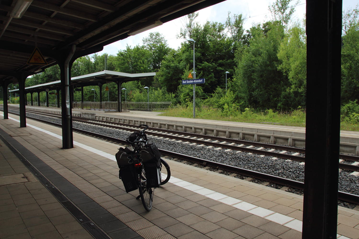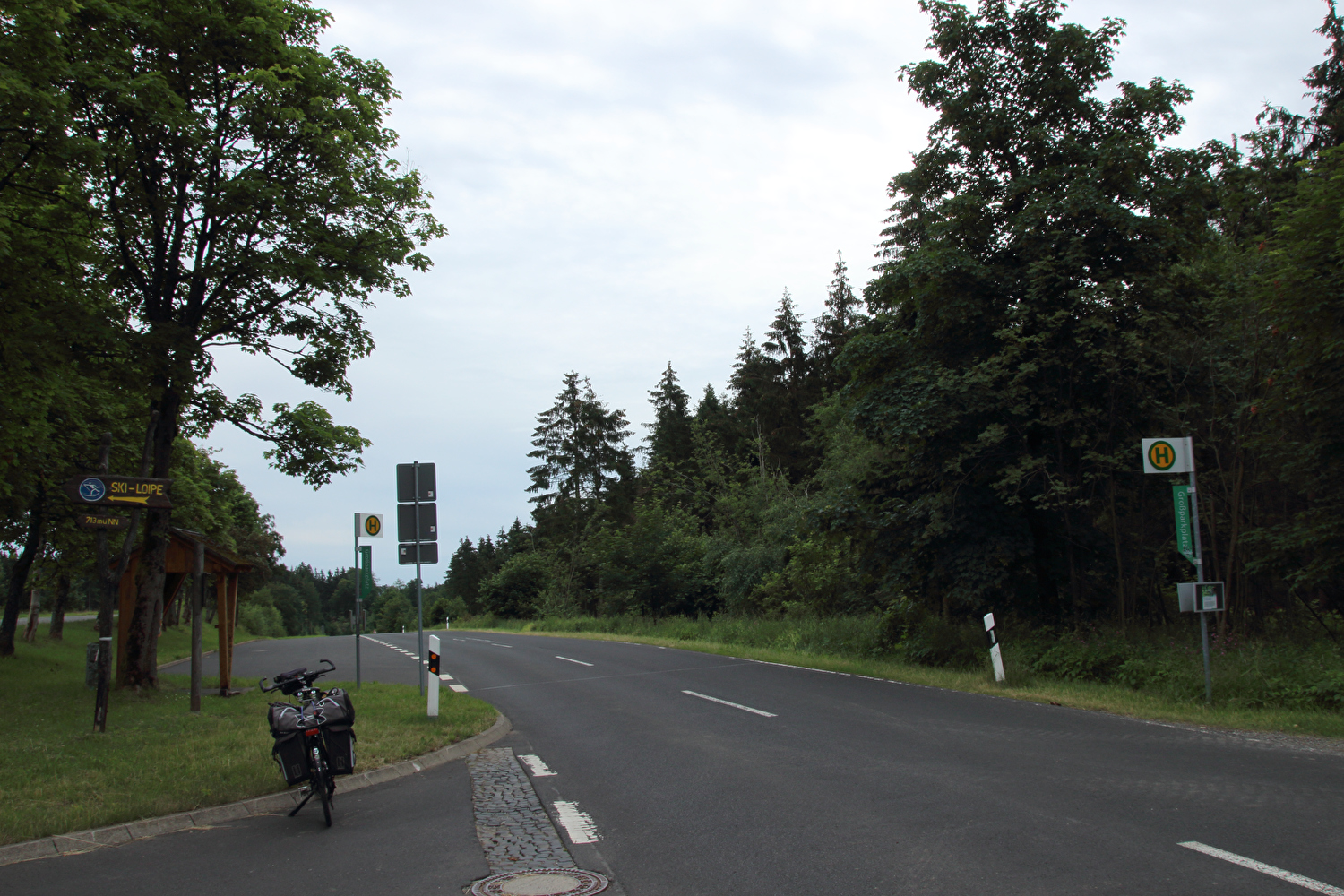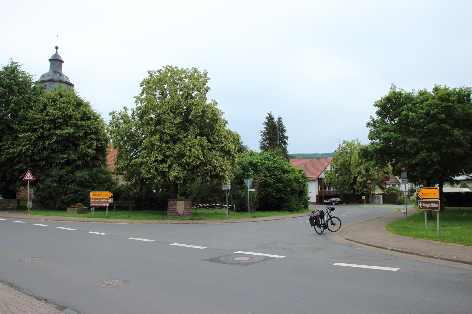 Beschreibung | Anders als am Vortag startete der Tag bewölkt und es sah nach Regen aus, blieb aber doch trocken. Für die Fahrt bergauf war die Bewölkung ganz angenehm, zum Fotografieren aber sehr ungünstig. Gleich oberhalb von Velmeden und oberhalb des oberen Abzweigs nach Hausen liegen zwei Abschnitte der Bergstrecke über den Hohen Meißner mit nahezu durchgehend über 10 % Steigung. Zwecks Materialschonung wurden diese schiebend überwunden. Trotzdem wurde der das „Dach der Tour“ auf dem Hohen Meißner so früh erreicht, das eine Mittagspause noch kein Thema war. Am Aussichtspunkt Schwalbenthal sollte eigentlich auf die Straße nach Bad Sooden-Allendorf abgebogen werden. Die war aber wegen Steinschlaggefahr nicht nur für Fahrzeuge aller Art sondern auch für Fußgänger gesperrt. Anders als am Vortag wurde die gesperrte Straße nicht gefahren, sodern die Resttour umgeplant. Als neues Etappenziel wurde Eschwege gewählt, da Eschwege von der gleichen Bahnlinie bedient wird wie Bad Sooden-Allendorf. Bei Abterode kam dann mehr und mehr die Sonne durch, allerdings bildeten sich in der zunehmend schwülen Luft vermehrt Quellwolken. Beim Bahnhof Eschwege wurde zum Mittagessen eingekehrt. Während der Mittagspause zeigte der Himmel, dass die Zeit noch für eine trockene Fortsetzung der Tour auf dem Werraradweg bis zum ursprünglich geplanten Tourziel Bad Sooden-Allendorf reichen könnte. Bei schwülwarmem, aber noch trockenem Wetter wurde Bad Sooden-Allendorf erreicht. Und wieder eine FFP2-Maske für die Tonne … ☹ |