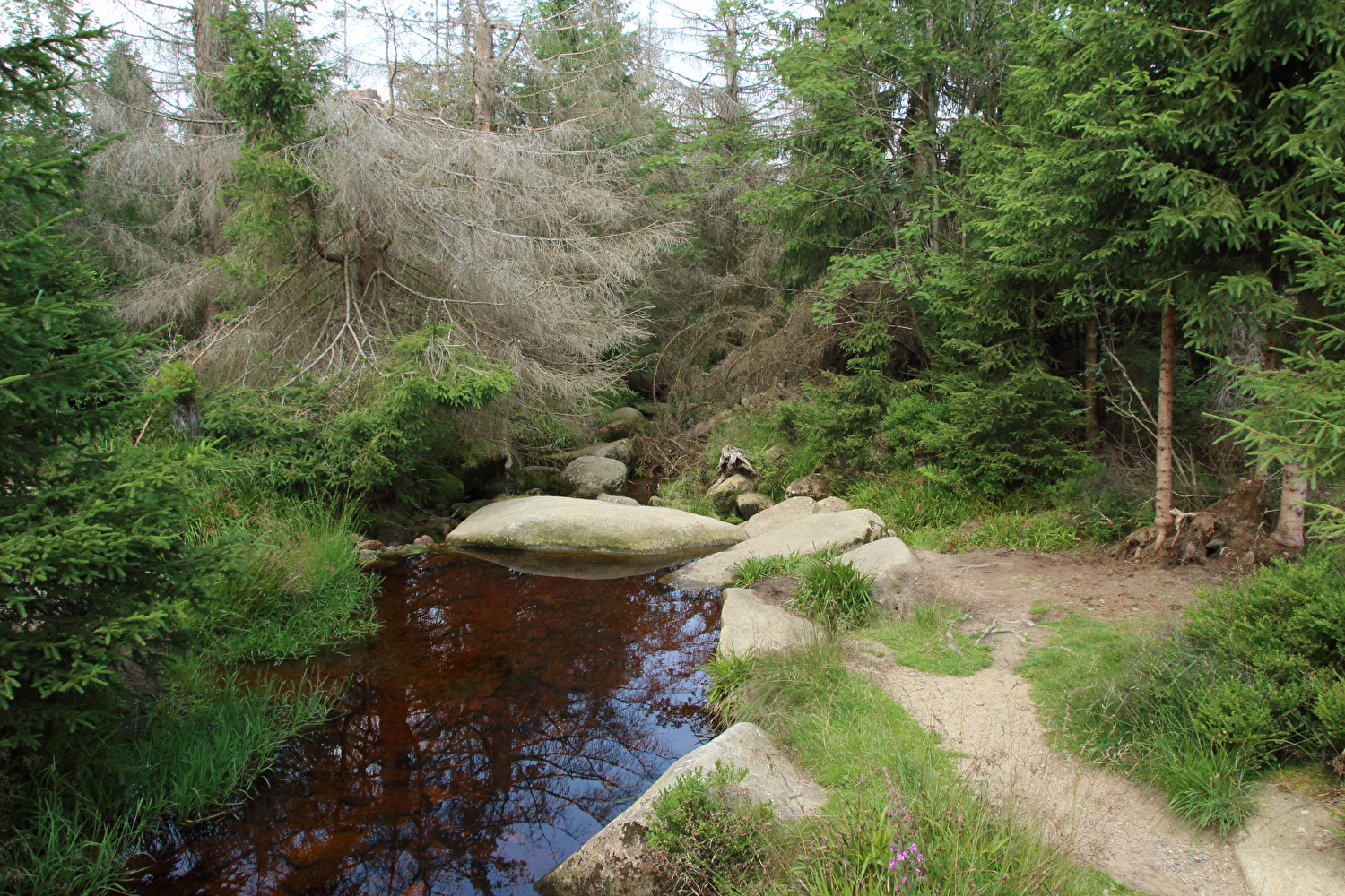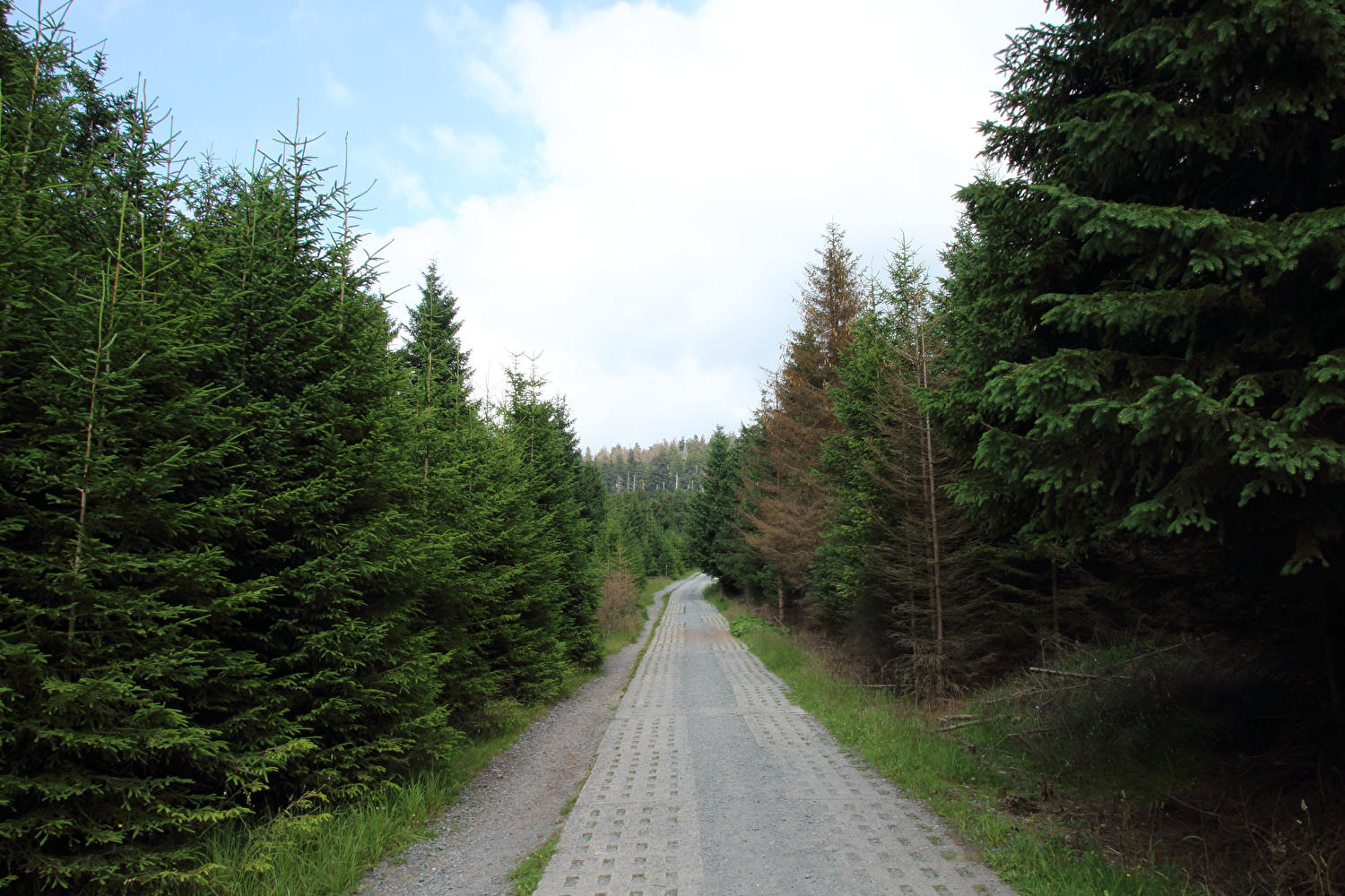 Beschreibung | Gerade noch rechtzeitig vor der Sommerfahrradtour bot sich die Gelegenheit zu einer Tour, die wenigstens kurzzeitig oberhalb der montanen Baumgrenze verlief. Gefahren wurde auf dem geländegängigen Fahrrad mit Start und Ziel „im Westen“, was die lange Bahnfahrt nach Wernigerode ersparte. Da im Bereich des Bahnhofs Oker mal wieder gebuddelt wurde und deshalb dort keine Züge hielten, wurde bereits in Goslar gestartet. Im Kellwassertal war die Luft zum Schneiden. Mit der Ausfahrt aus dem Kellwassertal wurde die Luft zwar angenehmer, dafür der Weg aber deutlich steiler. Die gewählte Route brachte zwei zusätzliche Schiebestrecken mit sich. Zuerst war in einem Steilstück der Untergrund so lose, dass der keinen Halt für die Reifen bot. Wenig später in einem Flachstück war der Weg so stark überschwemmt, dass der Grund durch das Wasser nicht mehr erkennbar war. Ein Steinwurf ins Wasser ließ erahnen, dass eine Fahrt da durch Füße und Antriebsstrang gewässert hätten. Die durch Dürre und Nichtbekämpfung des Borkenkäfers großflächig abgestorbenen und mittlerweile auch großräumig abgeholzten Fichtenwälder boten ab etwa 700 m ü.NHN ungewohnt viele Weitblicke teilweise bis ins Harzvorland. Im Bereich des Steilstücks mit den Betonwabenplatten, einem Teil des früheren Kolonnenweges, ist zwischen den beiden Betonwabenplattenspuren mittlerweile Mineralgemisch ausgebracht worden. Bergauf wurde im steilsten Stück mit bis zu 20 % trotzdem geschoben. Bergab war die Fahrt auf dem Mineralgemisch aber deutlich entspannter als früher auf den Betonwabenplatten oder der verblockten Piste daneben. Dürre und Borkenkäfer haben mittlerweile auch erste Spuren im Bereich der Krummholzzone unterhalb des Brockengipfels hinterlassen. Der Andrang auf dem Goetheweg, der Brockenstraße und dem Brockengipfel war überschaubar. Viele Fahrradfahrer waren allerdings mit Mogelmotor unterwegs. Auf dem Fahrrad ohne Motor bergauf fahrend fiel man da teilweise schon auf. Die Abfahrt erfolgte zunächst auf der selben Strecke wie der letzte Teil der Bergauffahrt. Wegen der schon deutlich vorgerückten Uhrzeit wurde der letzte Teil der Bergauffahrt nach Bad Harzburg auf der B4 gefahren. Und wieder eine FFP2-Maske für die Tonne … ☹ |