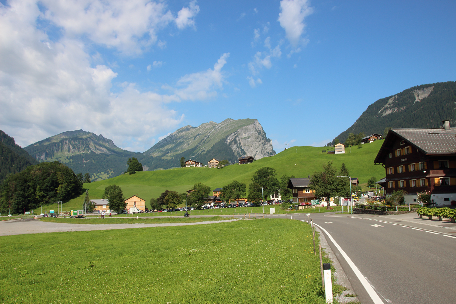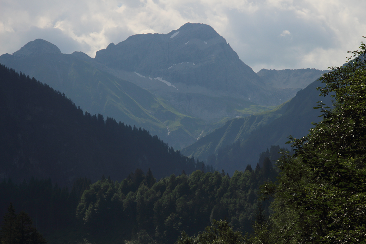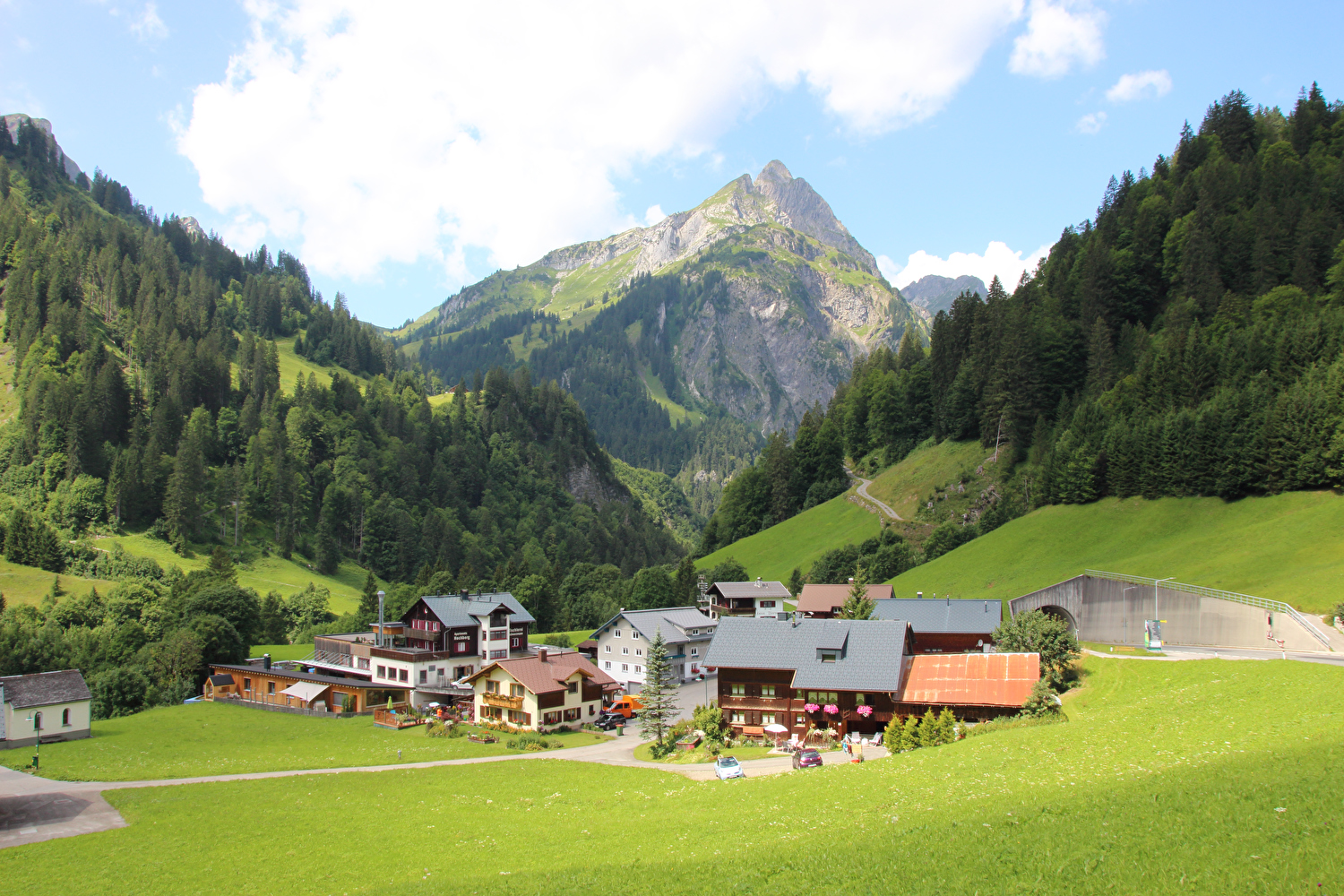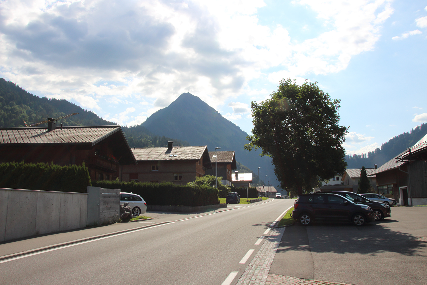 Etappenstart in Schoppernau, Blick talaufwärts zur Üntschenspitze … ![]() 300 dpi JPEG |