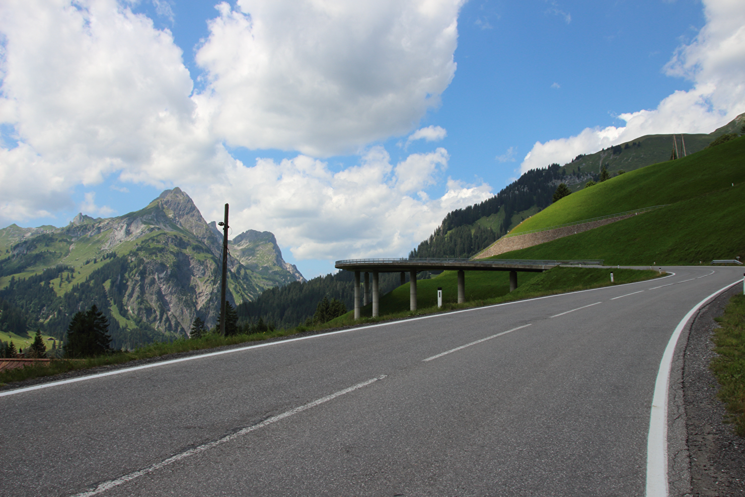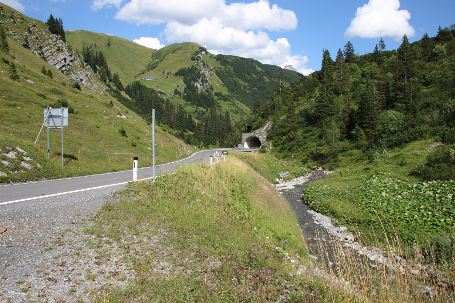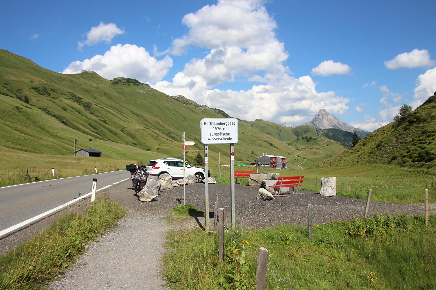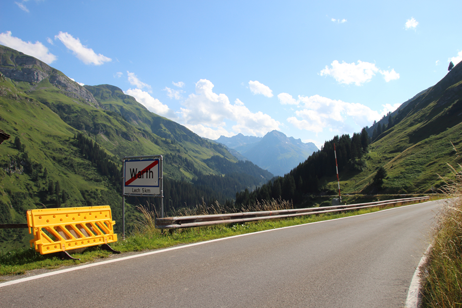 Beschreibung | Mit dem Hochtannbergpass führte diese Etappe über den ersten Bergpass in den Alpen im Rahmen dieser Tour. Diese Etappe durfte zeitlich nicht extrem in die Länge gezogen werden, da für die Straße zwischen Warth und Lech nächtliche Sperren jeweils zwischen 18:30 MESZ und 06:00 MESZ angekündigt waren. Ein Defekt am Fahrrad mit Zeitverlust hätte ein großen Problem verursachen können. Daher wurden alle Steilstücke der Westrampe des Hochtannbergpasses konsequent schiebend überwunden, wodurch dann auch ein Defekt am Fahrrad vermieden wurde. Bis Schröcken begleitete die Bregenzer Ach die Fahrt. Die Mohnenfluh, an deren Osthang die Bregenzer Ach auf etwa 2400 m.ü.A. entspringt, rückte mehrfach ins Blickfeld. Das Quellgebiet der Bregenzer Ach war aber aus keiner dieser Perspektiven zu sehen. Ab Schröcken beginngt der steile Teil der Westrampe des Hochtannbergpasses mit längeren Abschnitten mit über 10 % Steigung und maximal 14 % Steigung. In diesem Bereich lagen somit auch die erwähnten Schiebepassagen dieser Etappe. Das Gelände fällt in diesem Bereich so steil ab, dass an einer Stelle zwischen Schröcken und Nesslegg die Westrampe auf einer Kurvenbrücke, die nur von ein paar Pfeilern getragen quasi frei über dem Abgrund schwebt, geführt wird, um extreme Steigungen zu vermeiden. Die Westrampe folgt zwischen Schröcken und Passhöhe grob dem Seebach, der auf der Hochfläche, auf der auch die Passhöhe liegt, aus dem Kalbelesee abfließt. Der Ort Hochkrumbach schließt sich östlich an die Passhöhe an. Nach diesem Ort wird der Hochtannbergpass auch Hochkrumbachsattel genannt. Über den Hochtannbergpass verläuft die hier von der Rhein-Donau-Wasserscheide gebildete Europäische Hauptwasserscheide, die im Rahmen dieser Tour nun schon zum dritten Mal überquert wurde. Zwischen Hochkrumbach und Warth liegt im Verlauf der Ostrampe des Hochtannbergpasses mit der langen Holzboden-Galerie ein unschöner Streckenabschnitt. Die Ankunft in Warth erfolgte gegen 16:50 MESZ. Damit blieb genug Zeitreserve zur Passage der voraussichtlich ab 18:30 MESZ gesperrten Straße zwischen Warth und Lech. Ab Warth begann die bis dato längste Streckenwiederholung in den Alpen. Die Strecke von Warth über Lech, Flexenpass, Arlbergpass, Pians, See, Galtür und Wirl bis zum Abzweig der Zeinisjochstraße von der Silvretta-Hochalpenstraße war mit anderer Aufteilung der Streckenabschnitte bereits am 27.07.2016 und 28.07.2016 gefahren worden. Lech war, wo noch ein Restaurant zum Abendessen aufgesucht werden musste, ziemlich überlaufen. |