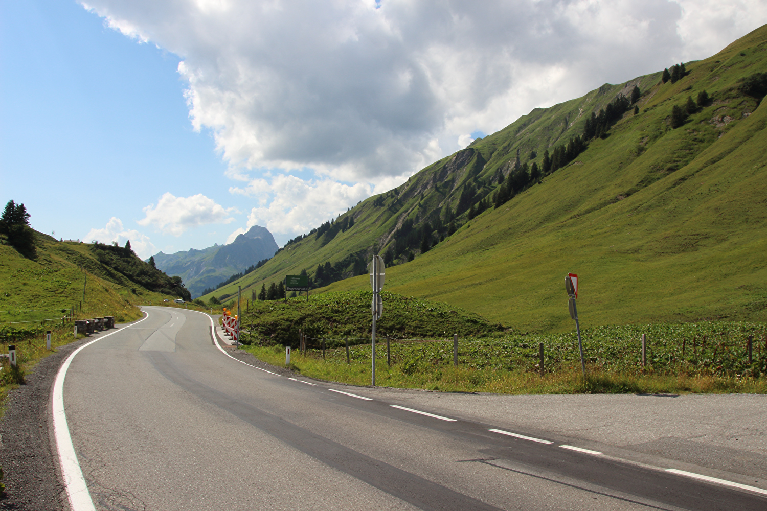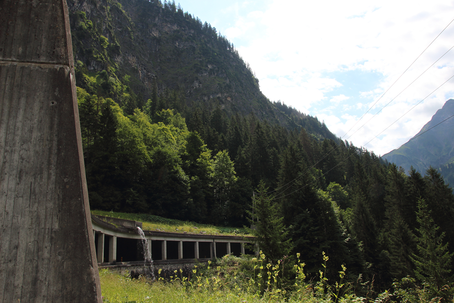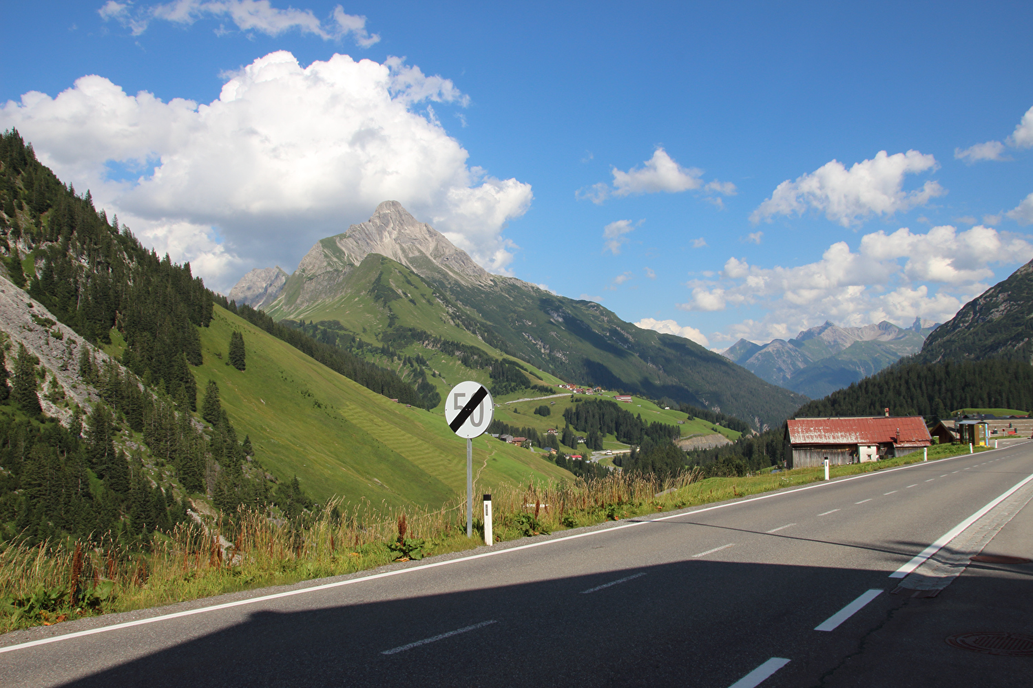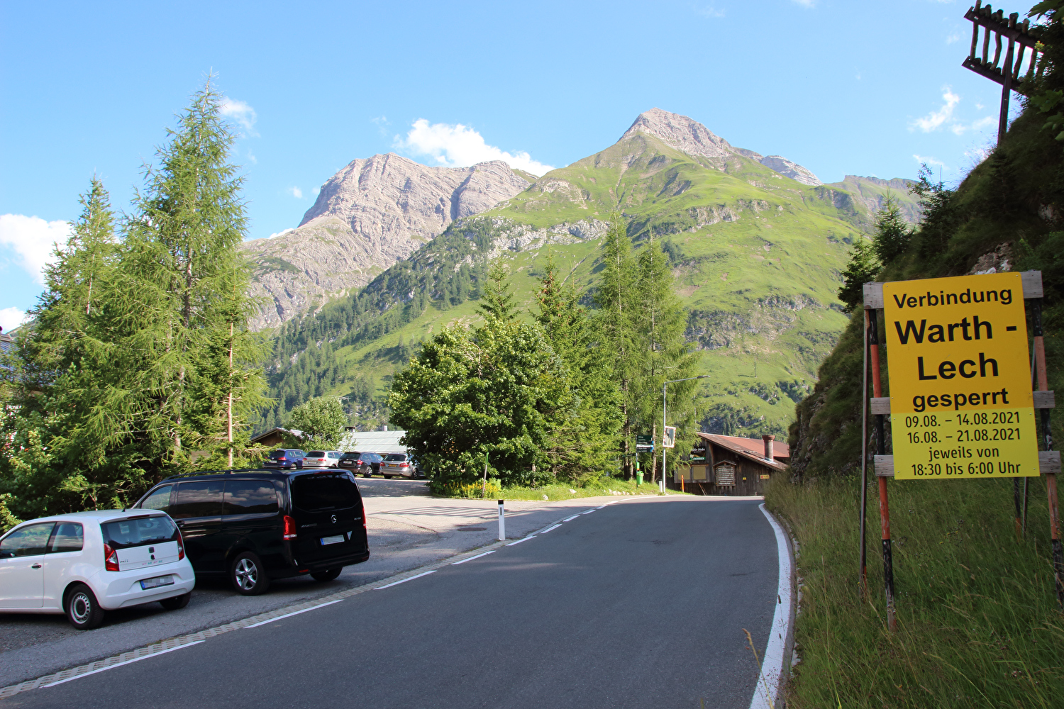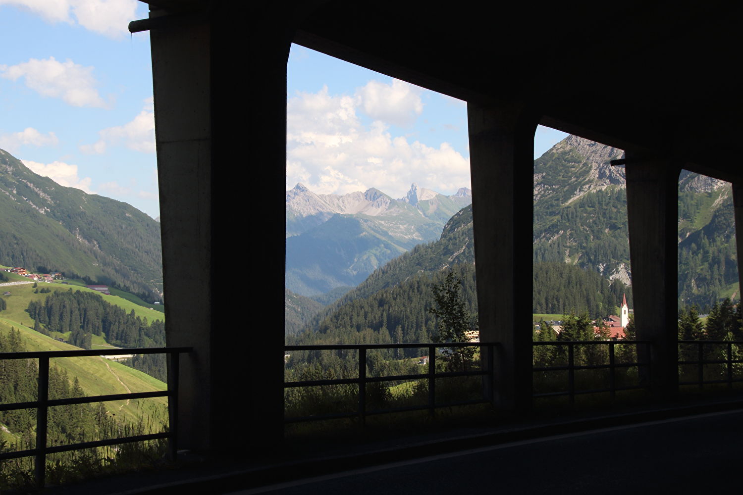 Beschreibung | Mit dem Hochtannbergpass führte diese Etappe über den ersten Bergpass in den Alpen im Rahmen dieser Tour. Diese Etappe durfte zeitlich nicht extrem in die Länge gezogen werden, da für die Straße zwischen Warth und Lech nächtliche Sperren jeweils zwischen 18:30 MESZ und 06:00 MESZ angekündigt waren. Ein Defekt am Fahrrad mit Zeitverlust hätte ein großen Problem verursachen können. Daher wurden alle Steilstücke der Westrampe des Hochtannbergpasses konsequent schiebend überwunden, wodurch dann auch ein Defekt am Fahrrad vermieden wurde. Bis Schröcken begleitete die Bregenzer Ach die Fahrt. Die Mohnenfluh, an deren Osthang die Bregenzer Ach auf etwa 2400 m.ü.A. entspringt, rückte mehrfach ins Blickfeld. Das Quellgebiet der Bregenzer Ach war aber aus keiner dieser Perspektiven zu sehen. Ab Schröcken beginngt der steile Teil der Westrampe des Hochtannbergpasses mit längeren Abschnitten mit über 10 % Steigung und maximal 14 % Steigung. In diesem Bereich lagen somit auch die erwähnten Schiebepassagen dieser Etappe. Das Gelände fällt in diesem Bereich so steil ab, dass an einer Stelle zwischen Schröcken und Nesslegg die Westrampe auf einer Kurvenbrücke, die nur von ein paar Pfeilern getragen quasi frei über dem Abgrund schwebt, geführt wird, um extreme Steigungen zu vermeiden. Die Westrampe folgt zwischen Schröcken und Passhöhe grob dem Seebach, der auf der Hochfläche, auf der auch die Passhöhe liegt, aus dem Kalbelesee abfließt. Der Ort Hochkrumbach schließt sich östlich an die Passhöhe an. Nach diesem Ort wird der Hochtannbergpass auch Hochkrumbachsattel genannt. Über den Hochtannbergpass verläuft die hier von der Rhein-Donau-Wasserscheide gebildete Europäische Hauptwasserscheide, die im Rahmen dieser Tour nun schon zum dritten Mal überquert wurde. Zwischen Hochkrumbach und Warth liegt im Verlauf der Ostrampe des Hochtannbergpasses mit der langen Holzboden-Galerie ein unschöner Streckenabschnitt. Die Ankunft in Warth erfolgte gegen 16:50 MESZ. Damit blieb genug Zeitreserve zur Passage der voraussichtlich ab 18:30 MESZ gesperrten Straße zwischen Warth und Lech. Ab Warth begann die bis dato längste Streckenwiederholung in den Alpen. Die Strecke von Warth über Lech, Flexenpass, Arlbergpass, Pians, See, Galtür und Wirl bis zum Abzweig der Zeinisjochstraße von der Silvretta-Hochalpenstraße war mit anderer Aufteilung der Streckenabschnitte bereits am 27.07.2016 und 28.07.2016 gefahren worden. Lech war, wo noch ein Restaurant zum Abendessen aufgesucht werden musste, ziemlich überlaufen. |