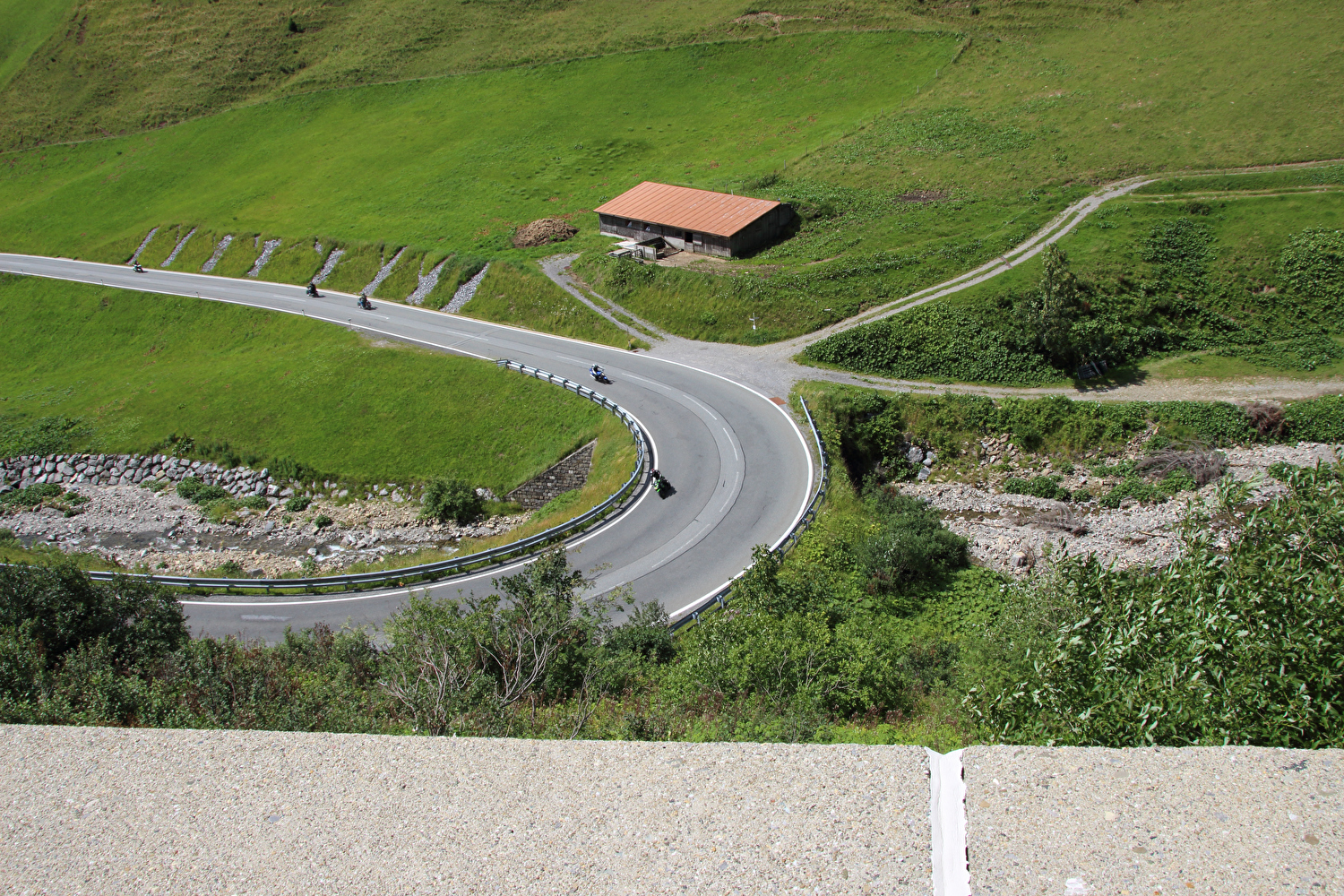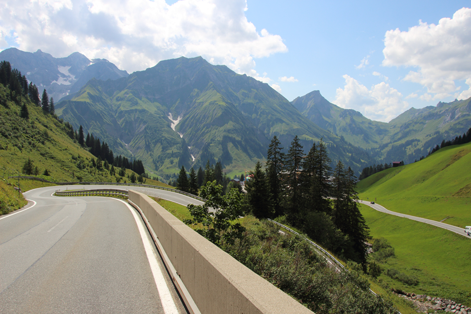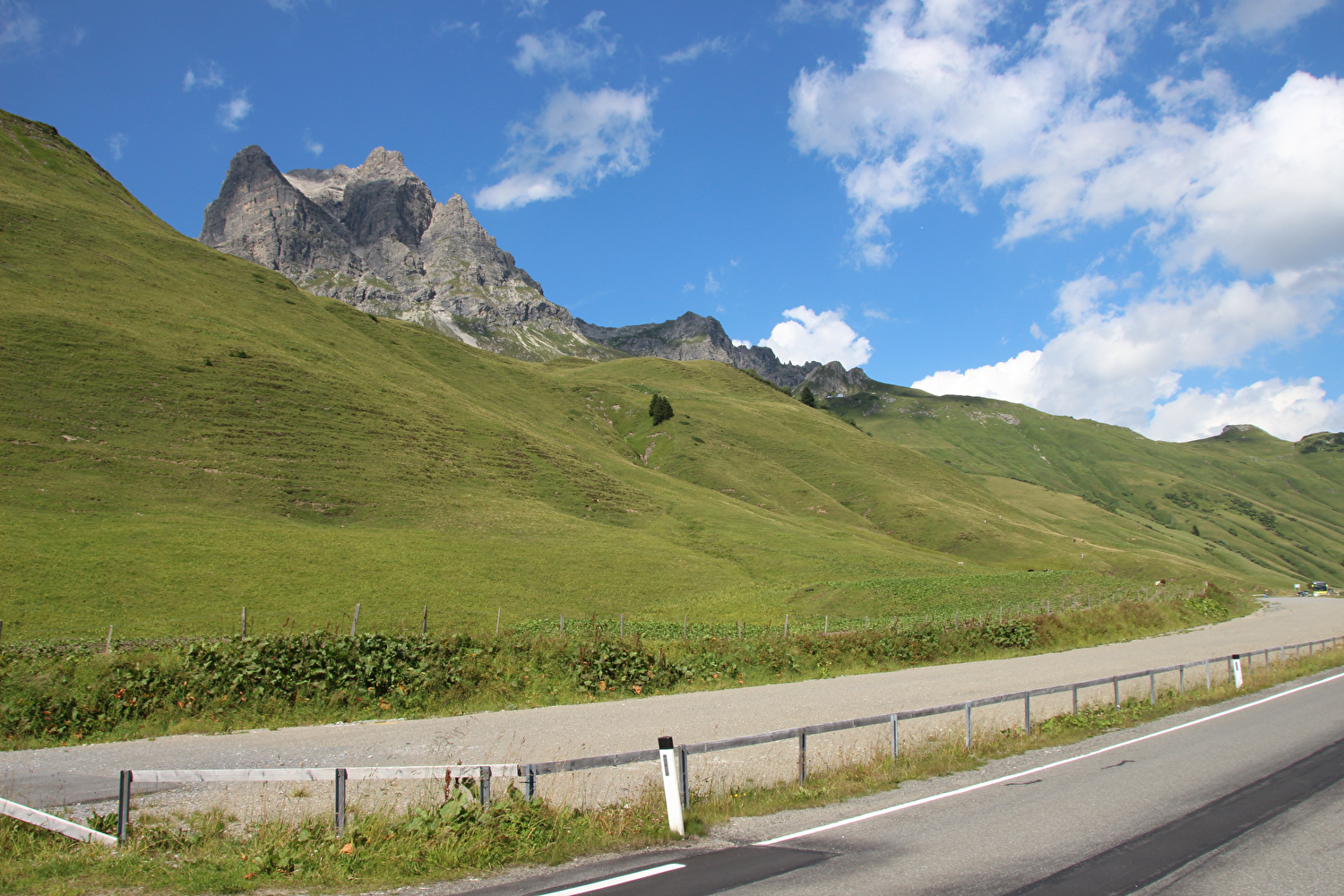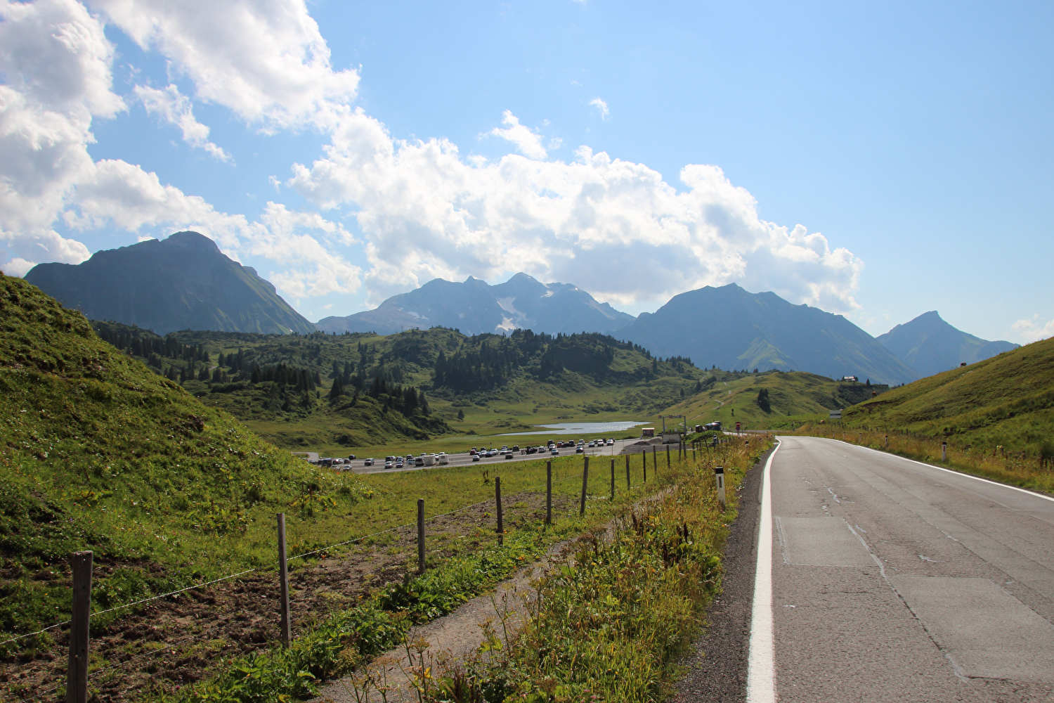 Beschreibung | Mit dem Hochtannbergpass führte diese Etappe über den ersten Bergpass in den Alpen im Rahmen dieser Tour. Diese Etappe durfte zeitlich nicht extrem in die Länge gezogen werden, da für die Straße zwischen Warth und Lech nächtliche Sperren jeweils zwischen 18:30 MESZ und 06:00 MESZ angekündigt waren. Ein Defekt am Fahrrad mit Zeitverlust hätte ein großen Problem verursachen können. Daher wurden alle Steilstücke der Westrampe des Hochtannbergpasses konsequent schiebend überwunden, wodurch dann auch ein Defekt am Fahrrad vermieden wurde. Bis Schröcken begleitete die Bregenzer Ach die Fahrt. Die Mohnenfluh, an deren Osthang die Bregenzer Ach auf etwa 2400 m.ü.A. entspringt, rückte mehrfach ins Blickfeld. Das Quellgebiet der Bregenzer Ach war aber aus keiner dieser Perspektiven zu sehen. Ab Schröcken beginngt der steile Teil der Westrampe des Hochtannbergpasses mit längeren Abschnitten mit über 10 % Steigung und maximal 14 % Steigung. In diesem Bereich lagen somit auch die erwähnten Schiebepassagen dieser Etappe. Das Gelände fällt in diesem Bereich so steil ab, dass an einer Stelle zwischen Schröcken und Nesslegg die Westrampe auf einer Kurvenbrücke, die nur von ein paar Pfeilern getragen quasi frei über dem Abgrund schwebt, geführt wird, um extreme Steigungen zu vermeiden. Die Westrampe folgt zwischen Schröcken und Passhöhe grob dem Seebach, der auf der Hochfläche, auf der auch die Passhöhe liegt, aus dem Kalbelesee abfließt. Der Ort Hochkrumbach schließt sich östlich an die Passhöhe an. Nach diesem Ort wird der Hochtannbergpass auch Hochkrumbachsattel genannt. Über den Hochtannbergpass verläuft die hier von der Rhein-Donau-Wasserscheide gebildete Europäische Hauptwasserscheide, die im Rahmen dieser Tour nun schon zum dritten Mal überquert wurde. Zwischen Hochkrumbach und Warth liegt im Verlauf der Ostrampe des Hochtannbergpasses mit der langen Holzboden-Galerie ein unschöner Streckenabschnitt. Die Ankunft in Warth erfolgte gegen 16:50 MESZ. Damit blieb genug Zeitreserve zur Passage der voraussichtlich ab 18:30 MESZ gesperrten Straße zwischen Warth und Lech. Ab Warth begann die bis dato längste Streckenwiederholung in den Alpen. Die Strecke von Warth über Lech, Flexenpass, Arlbergpass, Pians, See, Galtür und Wirl bis zum Abzweig der Zeinisjochstraße von der Silvretta-Hochalpenstraße war mit anderer Aufteilung der Streckenabschnitte bereits am 27.07.2016 und 28.07.2016 gefahren worden. Lech war, wo noch ein Restaurant zum Abendessen aufgesucht werden musste, ziemlich überlaufen. |
