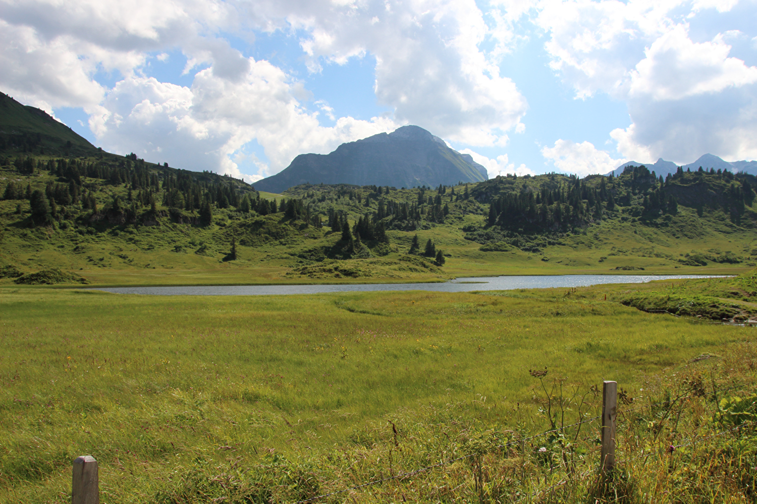 Blick über den Kalbelesee auf v. l. n. r. Juppenspitze und Mohnenfluh dahinter, Butzenspitze, Kleinspitze, Braunarlspitze, Hochberg und Rothorn ![]() 300 dpi JPEG |