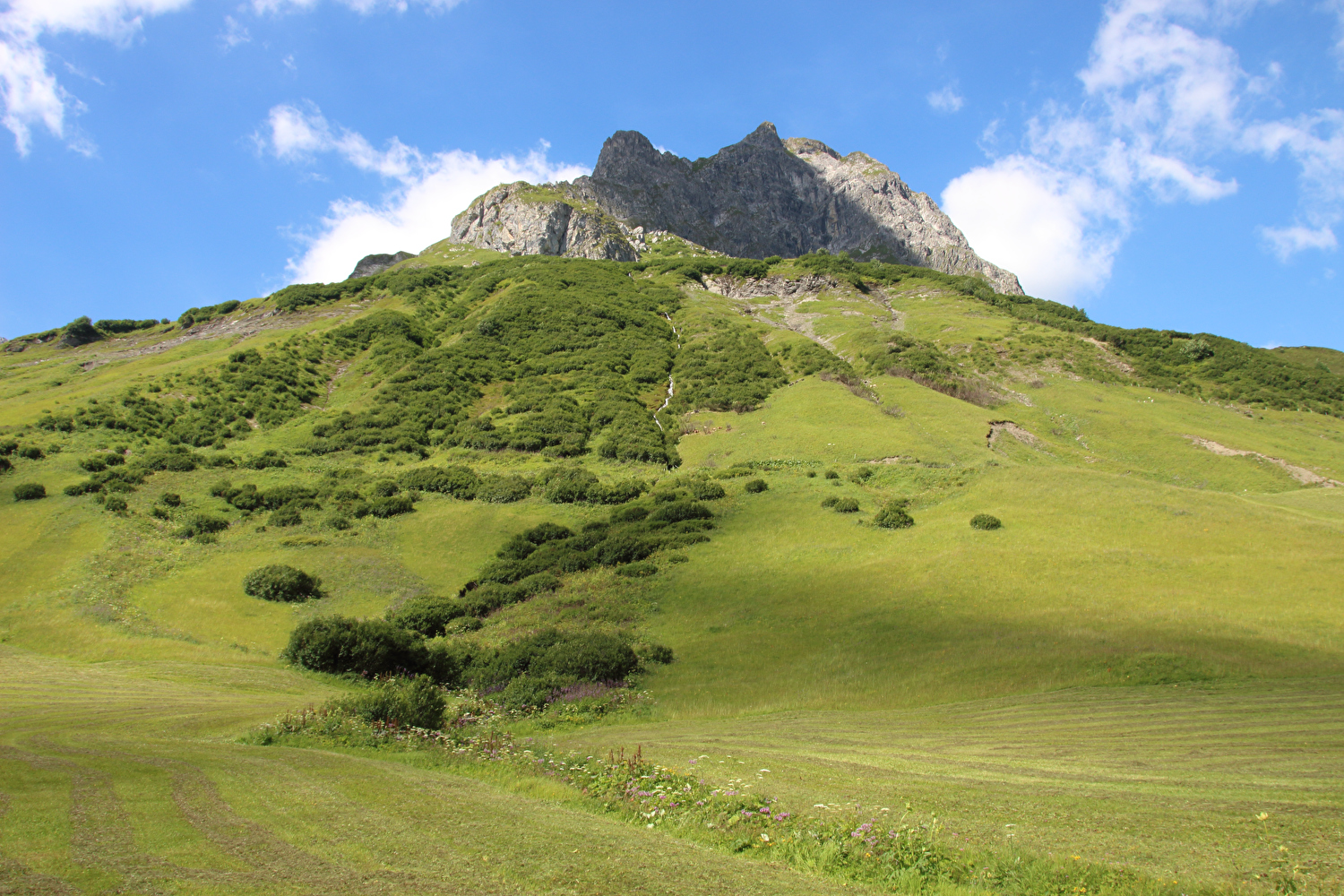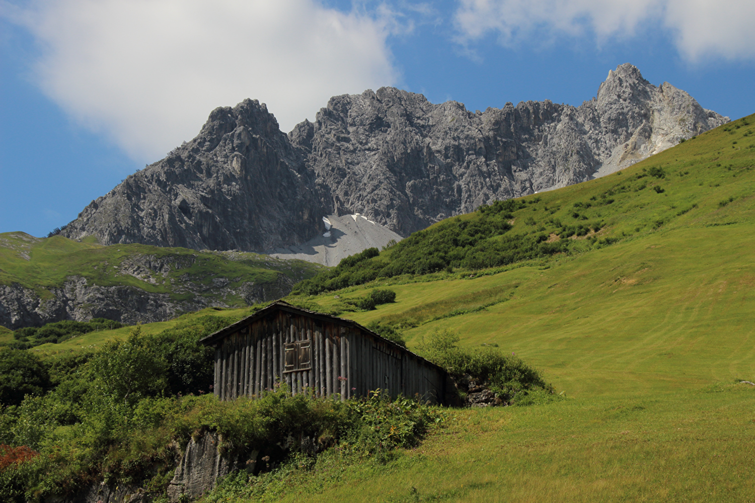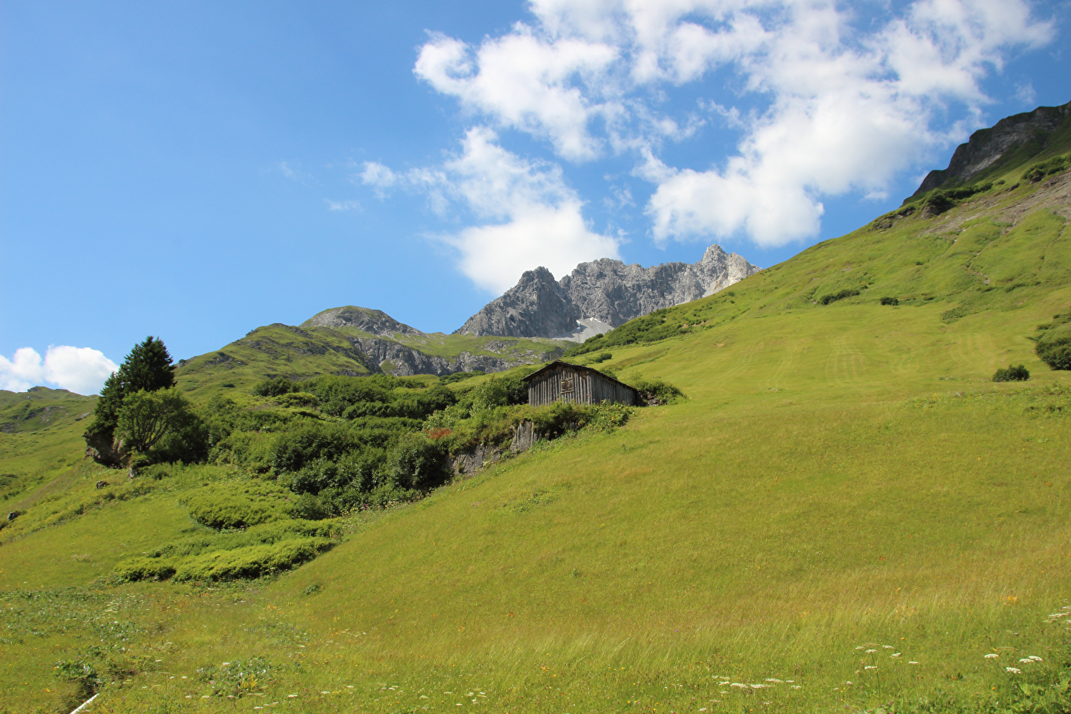 in Alpe Rauz, Blick auf v. l. n. r. Ochsenbodenkopf, Guggahüreli, Trittkopf und Pazüelfernerspitze ![]() 300 dpi JPEG |