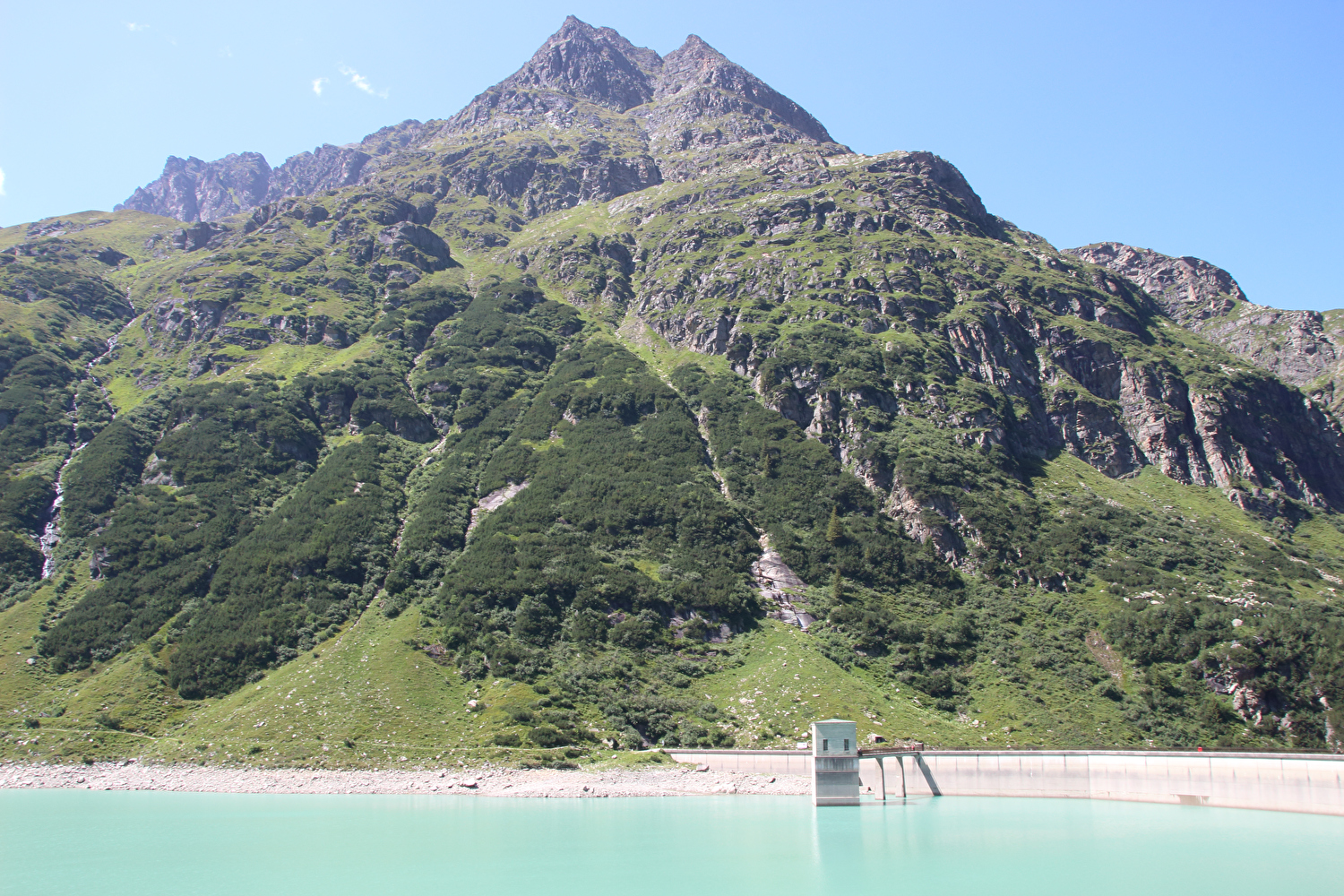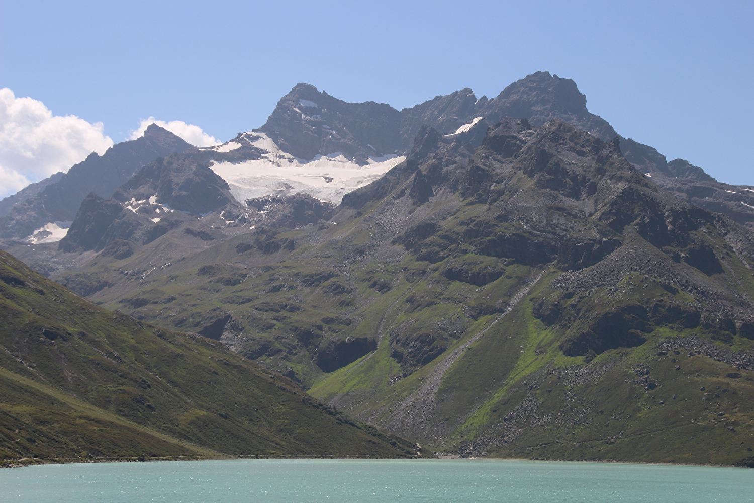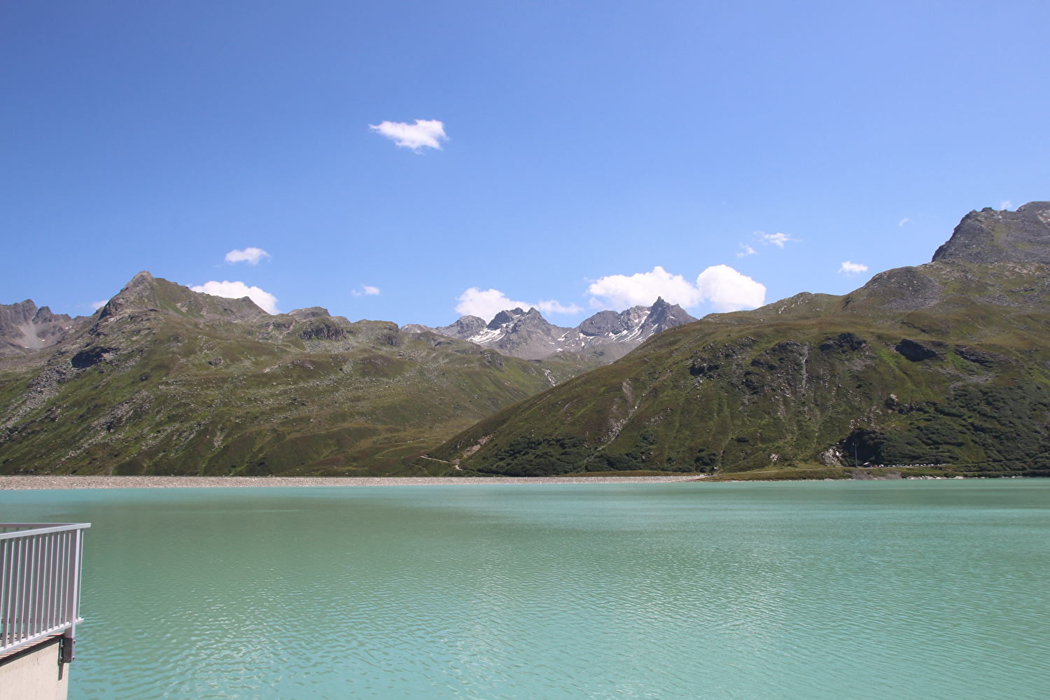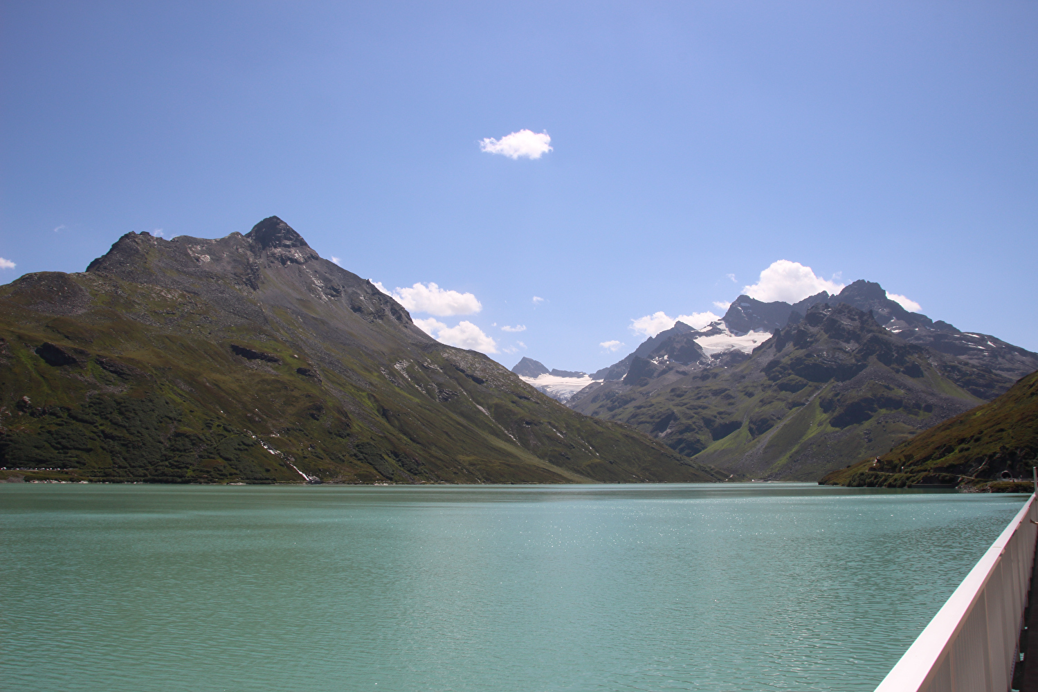 Blick über den Stausee auf v. l. n. r. Radkopf, Hohes Rad, Kleiner Piz Buin mit Ochsentaler Gletscher und Schattenspitze mit Schattenspitzgletscher und Klostertaler Egghorn, davor Kleine Schattenspitze und Kleine Egghörner ![]() 300 dpi JPEG |