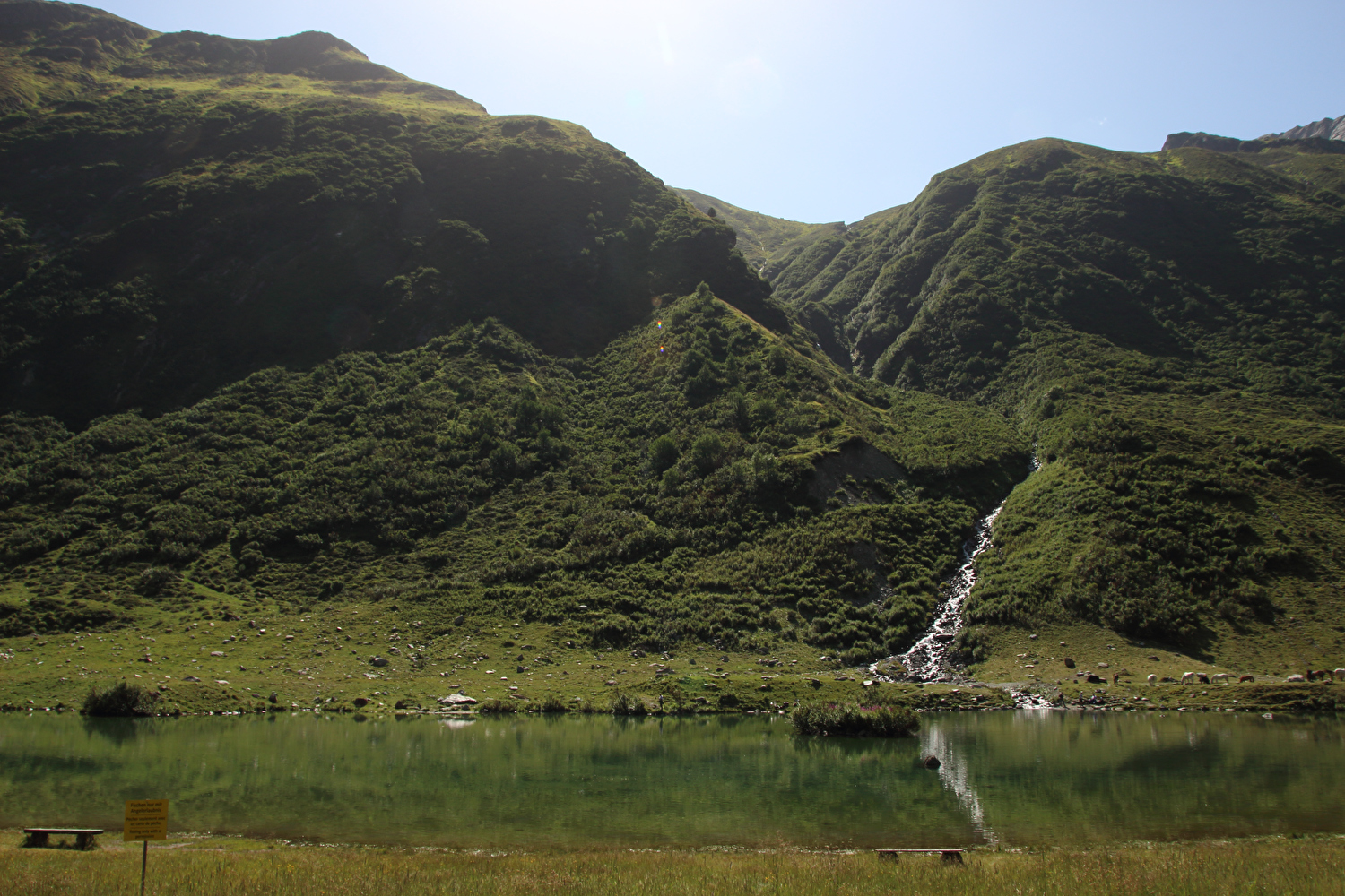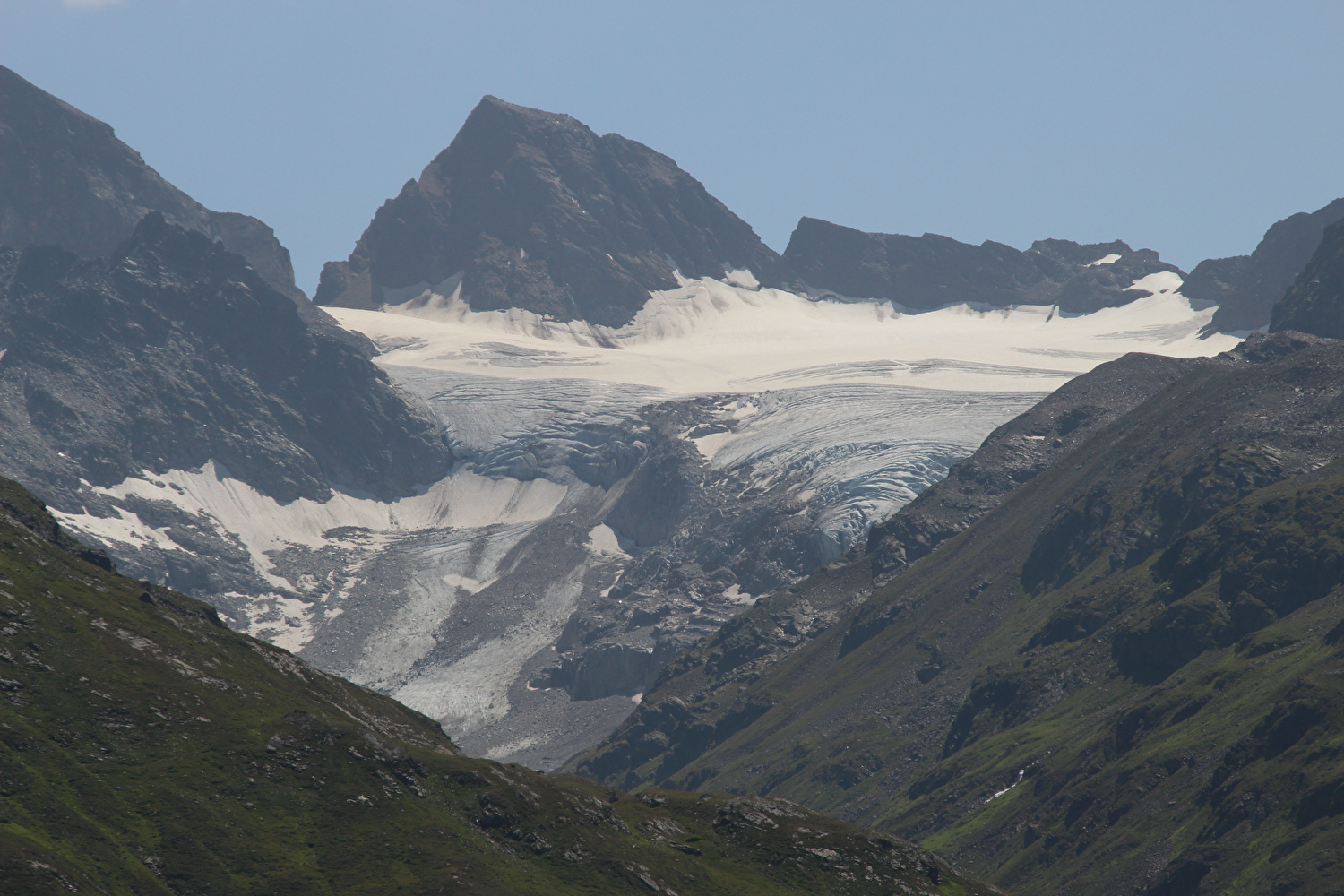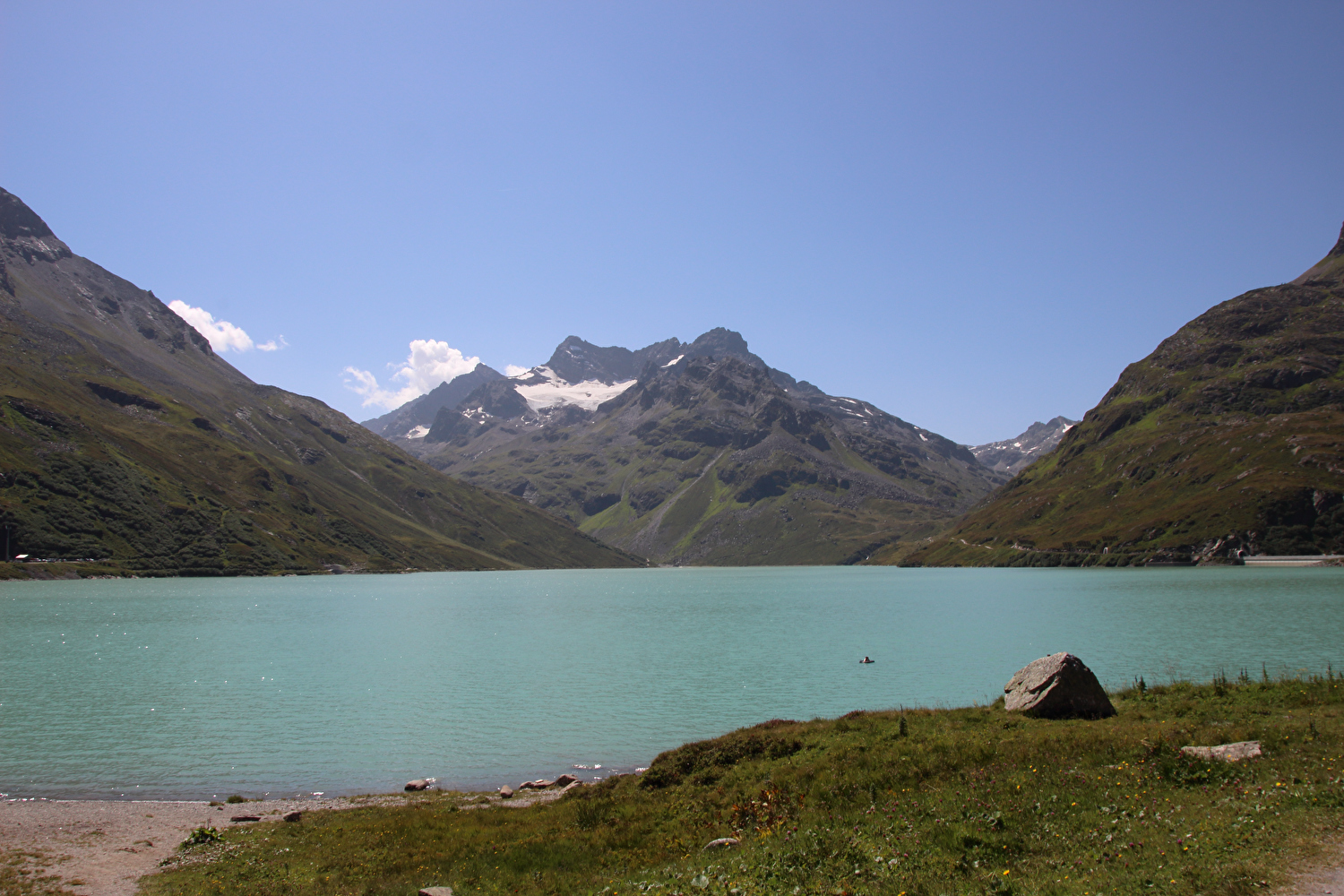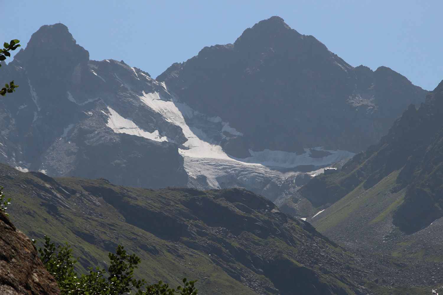 Blick über den Stausee auf v. l. n. r. Radkopf, Hohes Rad, Kleiner Piz Buin mit Ochsentaler Gletscher und Schattenspitze mit Schattenspitzgletscher und Klostertaler Egghorn, davor Kleine Schattenspitze und Kleine Egghörner ![]() 300 dpi JPEG |