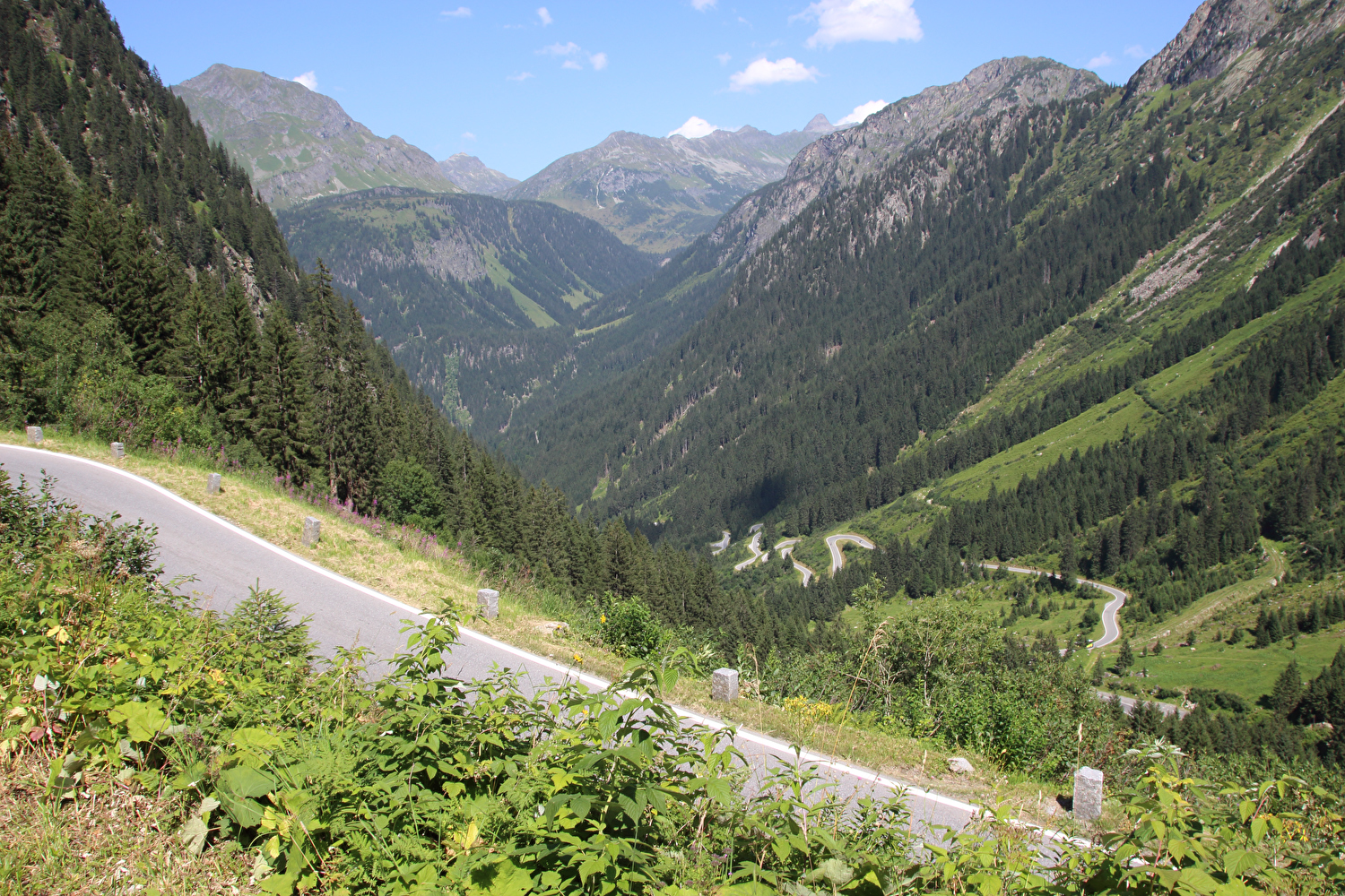 Blick über die zweitoberste Kehre auf v. l. n. r. Mittlere und Hintere Getschnerspitze und Madlenerspitze ![]() 300 dpi JPEG |
