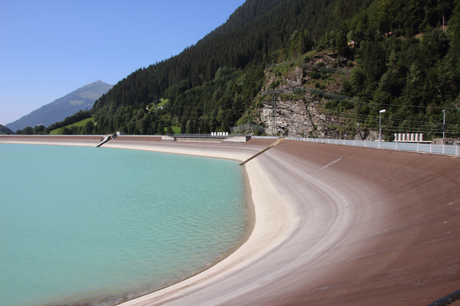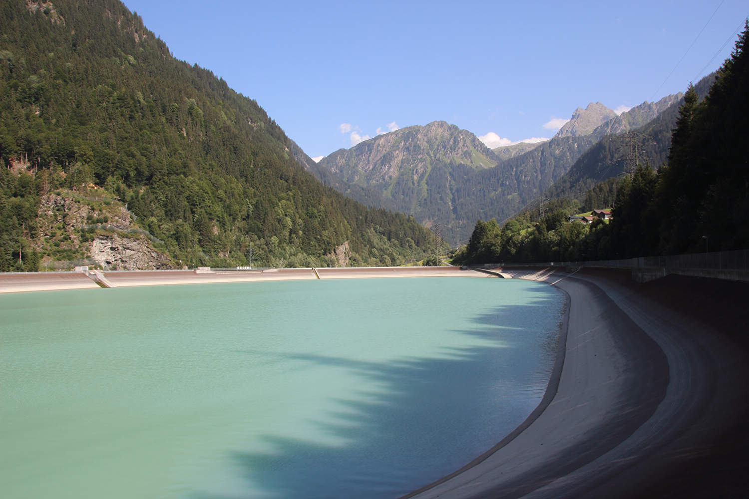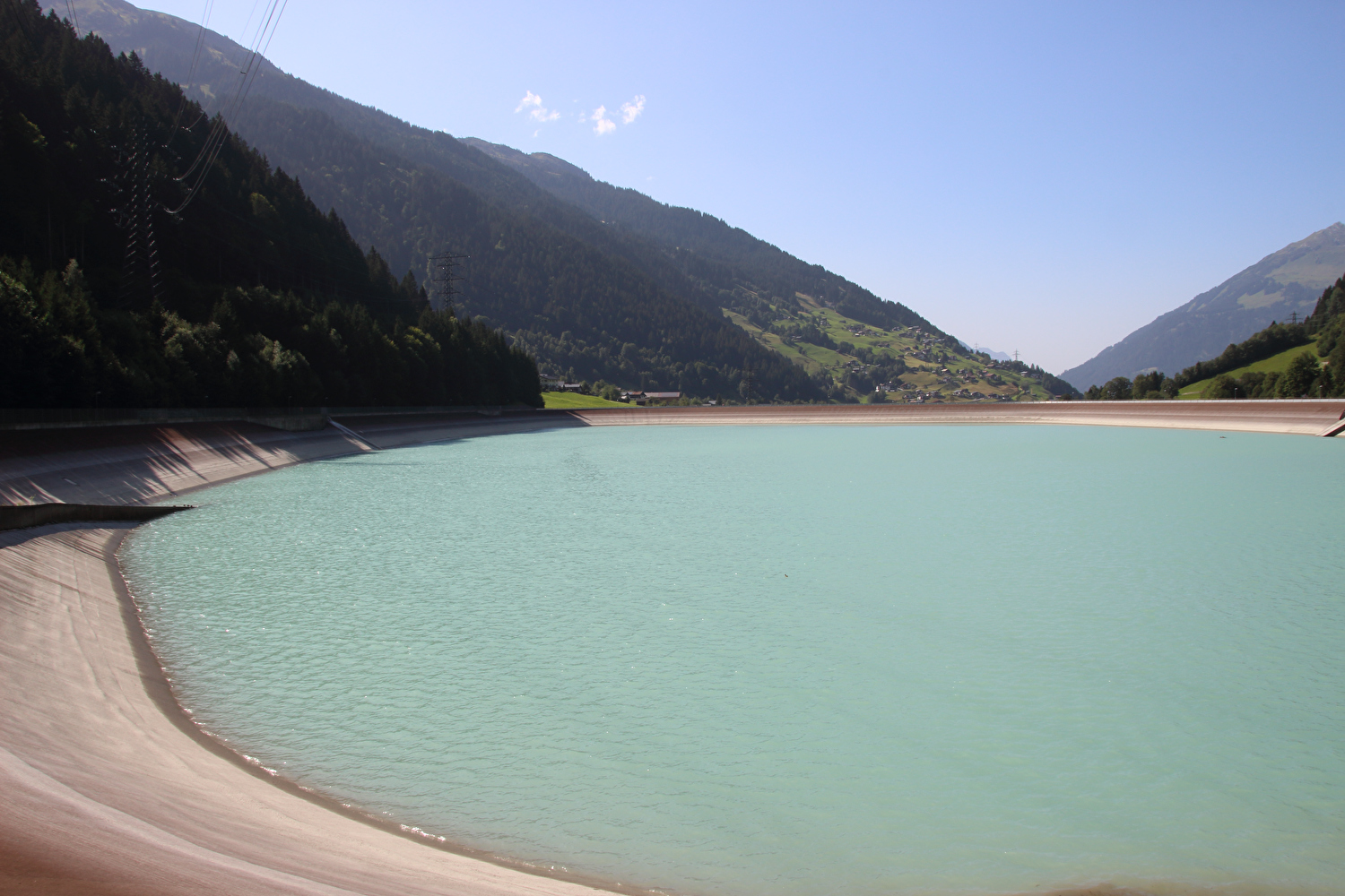 … Blick auf Westufer und Staumauer, darüber Stritkopf und Tschambreuspitze … ![]() 300 dpi JPEG |