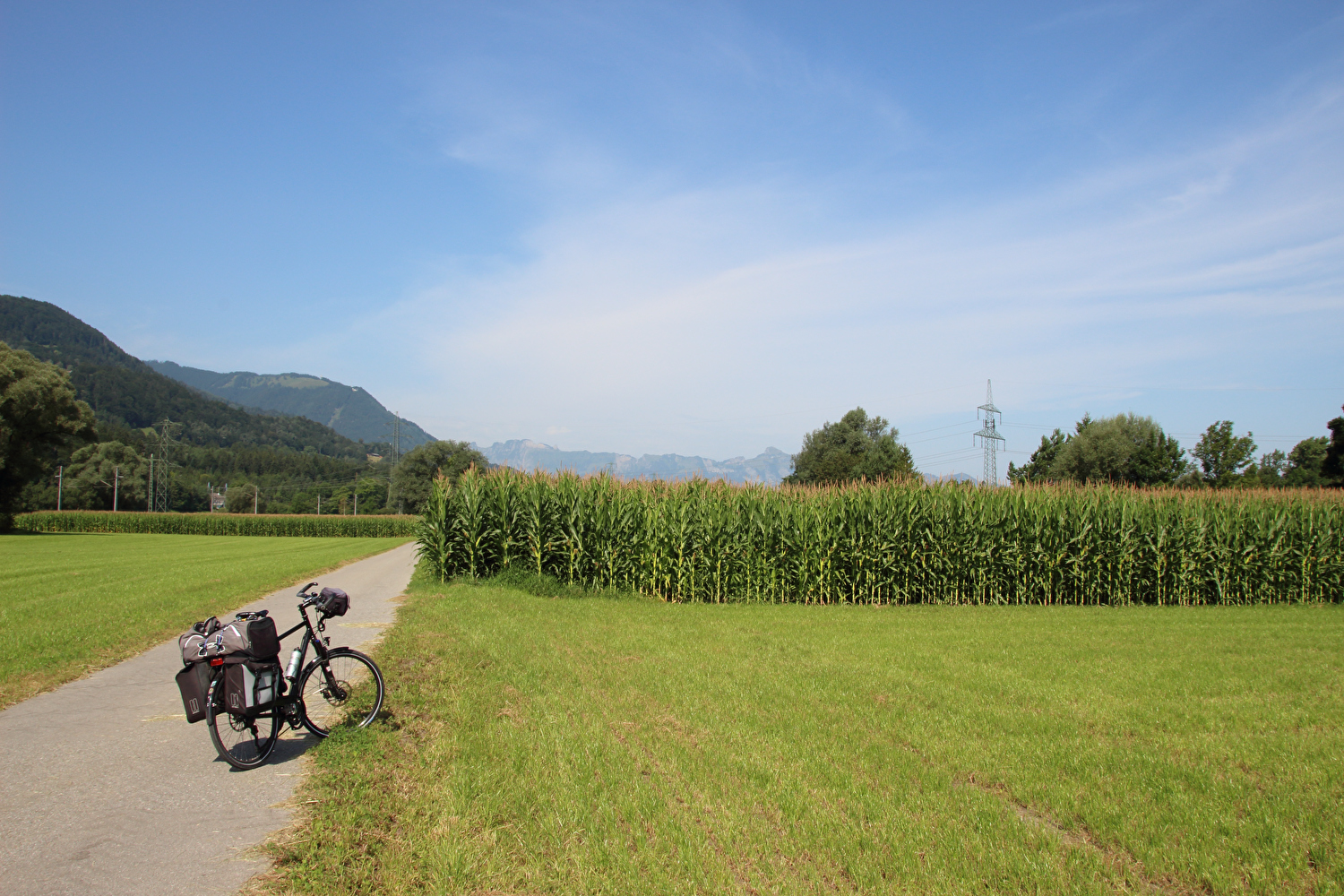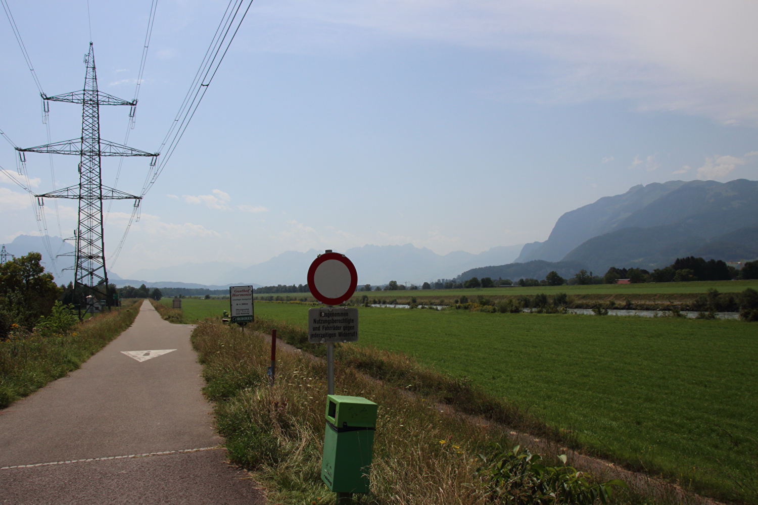 Beschreibung | Mit dieser letzten Etappe stand nun der vierte und letzte Teil dieser „4 in 1“-Tour an. Nach den fünf Etappen in den Alpen war diese Etappe eine Flachetappe zum Ausrollen. Da diese Etappe von den Alpen weg führte, waren die Blicke zurück wesentlich schöner als der beim Fahren notwendigerweise voraus gerichtete Blick. Gefahren wurde nahezu durchgängig auf Radwegen, zunächst dem Illradweg, dann der Rhein-Route und bis Lindau dem Bodensee-Radweg. Zwischen Frastanz und Feldkirch erfolgte eine Umleitung über Felsenau. Als Entschädigung dafür bot sich von Felsenau aus noch ein schöner Blick talaufwärts über das Walgau ins Montafon. Im historischen Ortskern von Feldkirch wurde die Mittagspause mit Mahlzeit eingelegt. Mit der Passage des Illdurchbruchs am Westrand von Feldkirch war dann entgültig Schluss mit alpiner Landschaft. Das Alpenrheintal wurde erreicht. Die Rote Au ist ein teilweise sumpfiges Waldgebiet, das im Europaschutzgebiet Bangs–Matschels liegt. Stinkeverkehr ist dort verboten. Dies ist möglicherweise auch ein Grund dafür, dass der sonst durchgängig asphaltierte Illradweg in der Roten Au auf Schotterpisten verläuft. An diesem Tag war die Fahrt dort mit reichlich Staubentwicklung verbunden. Von Westen her zog über der Schweiz auf Höhe Montlingen ein Schlechtwettergebiet auf, was zu einem Blick auf die Landkarte hinschtlich des nächsten erreichbaren Bahnhofs mit Anbindung nach Bregenz führte. Das Schlechtwettergebiet zog dann jedoch nordwestlich der Route vorbei, sodass die Tour nicht vorzeitig mit einer Bahnfahrt beendet werden musste. Zwischen Koblach und Mäder folgte eine weitere Umleitung. Zwischen Koblach und Mäder liegt der Kummenberg, ein Inselberg, der trotz seiner geringen Höhe recht auffällig ist. Der Kummenberg trennt das Vorarlberger Rheintal, das ein Teil des Alpenrheintals ist, in das südlich gelegene Oberland und das nördlich gelegenen Unterland. In der Flussmitte des Rheins verläuft die Staatsgrenze zwischen Österreich und der Schweiz im Flussabschnitt zwischen Bangs (Österreich) | Lienz (Schweiz), wo sich südlich auf der östlichen Rheinseite Liechtenstien anschließt, bis Mäder (Österreich) | Kriessern (Schweiz). Weiter verläuft die Staatsgrenze in der Mitte des Alten Rhein (Diepoldsauer Durchstich) und dann wieder in der Flussmitte des Rheins im Flussabschnitt zwischen Lustenau (Österreich) | Heerbrugg (Schweiz) bis Lustenau (Österreich) | Sankt Margarethen (Schweiz). Weiter verläuft die Staatsgrenze in der Mitte des Alten Rheins (Fußacher Durchstich) in den Bodensee mit dort unklarem Grenzverlauf. Alter Rhein (Diepoldsauer Durchstich) und Alter Rhein (Fußacher Durchstich) waren Flussabschnitte des Rheins, die im Rahmen der Internationalen Rheinregulierung vom Rhein mit dem Fußacher Durchstich im Jahr 1900 und dem Diepoldsauer Durchstich im Jahr 1923 abgetrennt wurden. Gefahren wurde diese Etappe gänzlich auf der österreichischen Seite der Staatsgrenze. Eine abschnittsweise Fahrt auf der Schweizer Seite hätte sich optisch sehr wahrscheinlich nicht gelohnt, da dieser untere Teil des Alpenrheintals eine insgesamt reizarme Landschaft bietet. Und auch wegen der Coronavirus-Pandemie wurde auf die dann notwendigen zwei weiteren Grenzübertritte verzichtet, obwohl die Grenzübergänge soweit aus der Entfernung erkennbar unbesetzt waren. Der Blick im Alpenrheintal zwischen Meiningen (Österreich) | Oberriet (Schweiz) und Hard talabwärts erinnert streckenweise an langweiligere Abschnitte des Wesertals. Nur Blicke talaufwärts oder nach Osten lassen erkennen, dass man sich gerade im Alpenrheintal aufhält. Direkt hinter dem Deich zwischen Lustenau und Hard wirkt die Landschaft bei entsprechender Blickrichtung wie an der Nordsee hinter dem Deich. Das wiederum passt irgendwie, da der Rhein in die Nordsee mündet. Die Fahrt am Ostufer des Bodensees in Bregenz und Lochau war eine inverse Streckenwiederholung, dieser Abschnitt war in der Gegenrichtung im Verlauf der 07. Etappe gefahren worden. Da diese letzte Etappe bis Lindau auf Radwegen gefahren wurde, wurde zumindest kleinräumig betrachtet eine inverse Streckenwiederholung zwischen Lochau und Lindau vermieden, womit auch die Staatsgrenze zwischen Österreich und Deutschland an einer anderen Stelle überquert wurde. Nach dem Durchzug des Schlechtwettergebiets war die Fernsicht in die Schweiz deutlich reduziert. Die Appenzeller Alpen waren vom Bodenseeufer aus anders als bei der 07. Etappe nicht zu sehen. Mit der Unterquerung der Eisenbahnbrücke zwischen Lustenau und Sankt Margarethen verliefen Eisenbahntrassen mehr oder weniger direkt neben den Radwegen. Die Etappe führte auch am Bahnhof Bregenz vorbei. Sankt Margarethen, Bregenz, Lindau-Insel? Da war doch was! Die wegen Zugausfalls ab Hannover Hbf. chaotische Anreise zur Alpenfahrradtour 2017 ausschließlich mit Nahverkehrszügen am 24.07.2017 enthielt Umstiege in den Bahnhöfen Lindau-Insel, Bregenz und Sankt Margarethen. Dies sollte sich am folgenden Abreisetag noch als böses Omen heraus stellen. Während der Etappe selbst blieb es bei der Erkenntnis, dass Bahnstrecken vom Fahrrad aus schöner anzusehen sind als aus dem Zugfenster heraus. Und wieder eine FFP2-Maske für die Tonne … ☹ |