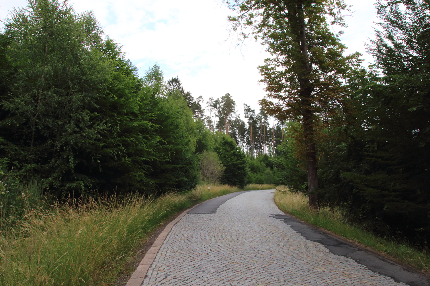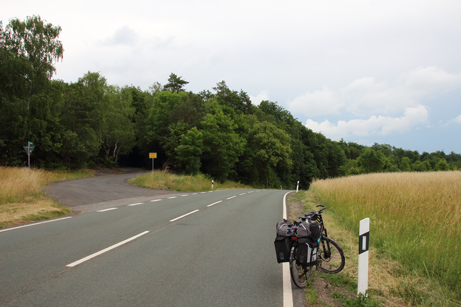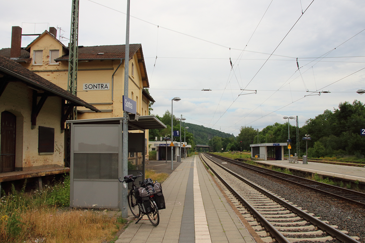 Beschreibung | Kurzfristig angesetzt wurde eine Viertagestour gefahren. Die Wahl fiel auf den Thüringer Wald. Zur Vermeidung einer überlangen Bahnanreise wurde mit nur einem Umstieg in Göttingen die Tour im Westen, also außerhalb des Thüringer Waldes gestartet. Die Tour begann am äußert einladenden Bahnhof in Sontra bei bedecktem Himmel. Nach ca. 4 km fiel ein erster Regenschauer, dessen stärkster Teil unter einem Baum abgewartet wurde, wobei auch das Gepäck regenfest verpackt wurde. Bei Bauhaus, also noch im Westen, wurde auf einem namenlosen Pass das „Dach der Etappe“ erreicht. In der Abfahrt vom „Dach der Etappe“ zur Werra wurde zwischen Richelsdorf und Gerstungen die Zonengrenze überquert. Zwischen Gerstungen und Berka/Werra führte die Route noch einmal etwa einen halben Kilometer durch den Westen. Da es in diesem Bereich einen Verkehrsunfall gegeben hatte, nur Fahrradfahrer und Fußgänger passieren durften und vor allem der Feuerwehreinsatz noch lief, gibt es von diesen beiden Überquerungen der Zonengrenze keine Fotos. Ab Berka/Werra verlief der Rest der Tour in der Zone. Der Streckenabschnitt zwischen Gerstungen bis zum Abzweig der K106 von der L1022 im Frauenseer Forst war eine inverse Streckenwiederholung. In der Gegenrichtung war dieser Streckenabschnitt am 02.07.2015 gefahren worden. Kurz nach dem Ende der inversen Streckenwiederholung rückte der Große Inselsberg im Thüringer Wald zum ersten Mal im Rahmen dieser Tour ins Blickfeld. Auf dem Weg nach Tiefenort zog im Nordwesten der nächste Regenschauer auf. In Tiefenort erfolgte zu allem Überfluss noch eine wegverlägernde Umleitung des Fahrradverkehrs Richtung Bad Salzungen. In Hämbach war der Regen dann da. Da die Fahrradumleitung schlecht bis gar nicht ausgeschildert war und wegen des Regens auch keine Fahrt auf einer Schotterpiste erfolgen sollte, wurde bis Leimbach auf der stark befahrenen B62 gefahren. Vor Leimbach hörte der Regen wieder auf. Und wieder eine FFP2-Maske für die Tonne … ☹ |