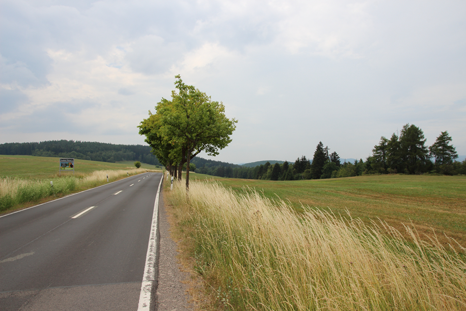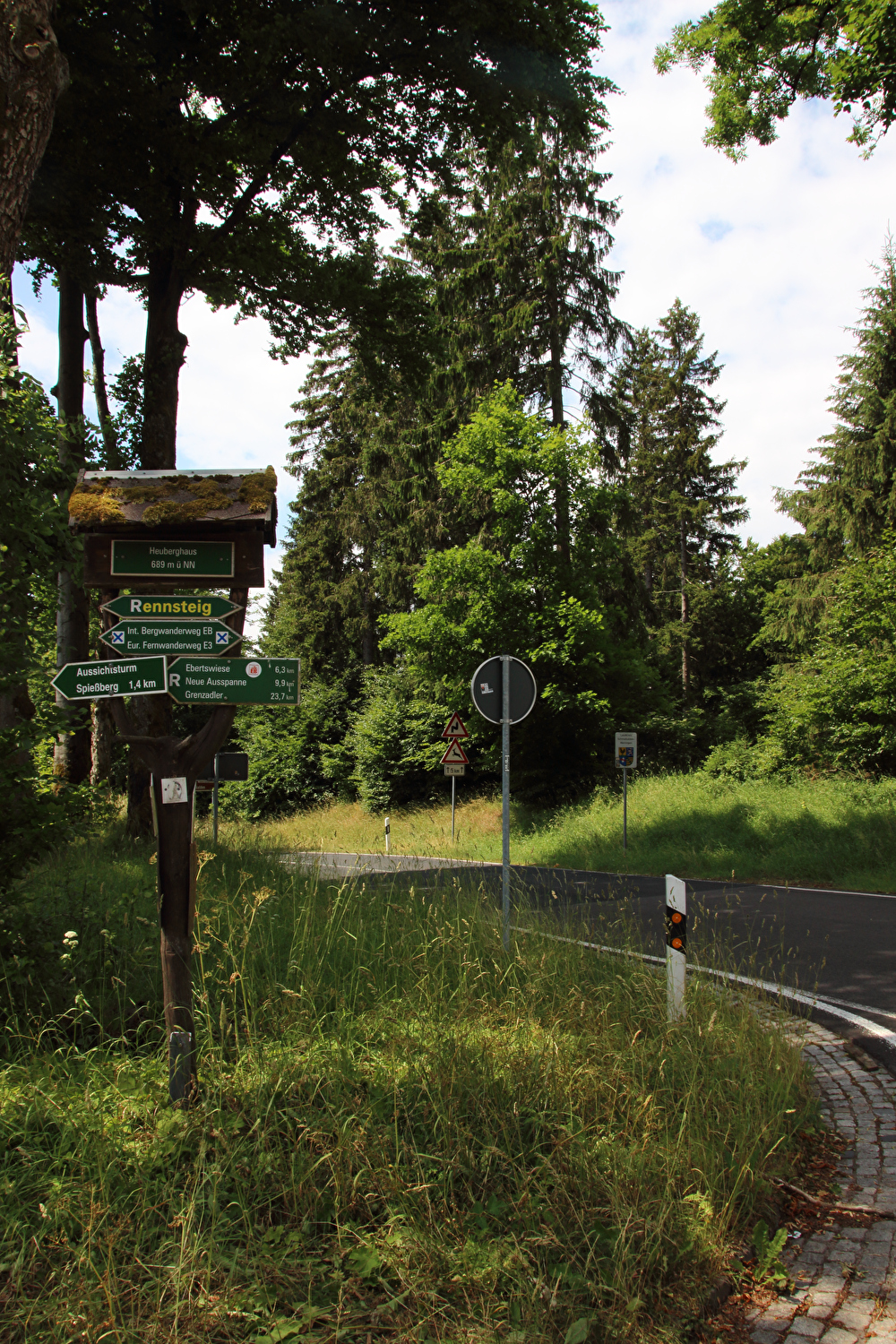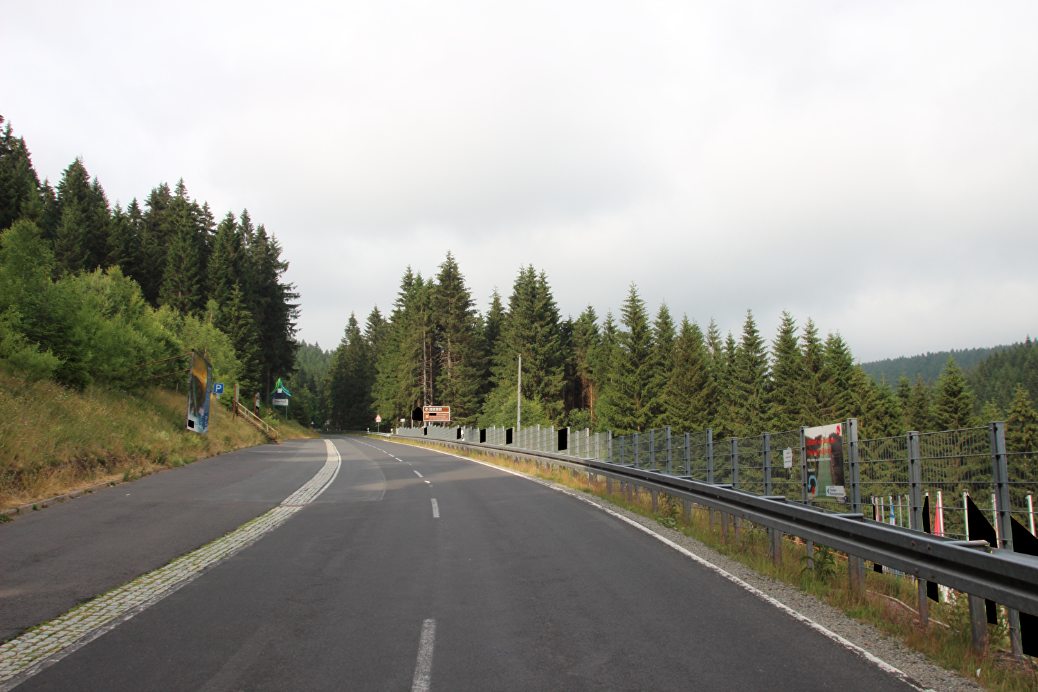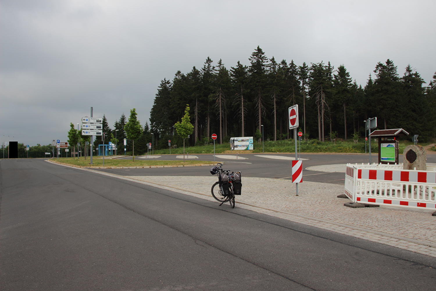 Beschreibung | Der Himmel zeigte sich etwas wolkiger als am Vortag, was bei der Wärme vor allem bergauf ganz angenehm war. Immerhin stand die Königsetappe, also die Etappe mit den meisten Höhenmetern bergauf an. Kurz nach Etappenstart musste in Bad Tabarz einer Umleitung gefolgt werden. Wieder auf der geplanten Strecke führte die Etappe am Endpunkt Tabarz der Thüringerwaldbahn vorbei. Die Thüringerwaldbahn ist eine meterspurige Überlandstraßenbahn, die vom Straßenbahnetz Gotha ausgehend in Bad Tabarz endet. Das teilweise historisch anmutende Rollmaterial verkehrt im Regelbetrieb. Zwischen Bad Tabarz und Friedrichroda begann der erste Anstieg der Etappe. Auf der Passhöhe Heuberghaus wäre eigentlich Zeit zum Mittagessen gewesen, aber das dortige Restaurant war – mittlerweile wenig überraschend – geschlossen. Auch in den in der Abfahrt talwärts gelegenen Orten gab es kein einziges geöffnetes Restaurant. Somit blieb es bei einer geschmacklich grenzwertigen Bratwurst beim Fleischer neben einem Supermarkt in Floh-Seligenthal. Nach der Überquerung eines namenlosen Passes am Südrand von Struth-Helmershof gefolgt von einer kurzen kurvigen und recht steilen Abfahrt schloss sich der Anstieg zur Rotteroder Höhe an, der sich etwas in die Länge zieht. In Steinbach-Hallenberg war eine Sperrung der Straße nach Oberhof samt Umleitung über Zella-Mehlis ausgeschildert. Diese Umleitung hätte zusätzlich 8,8 km Strecke und 190 Höhenmeter bergauf mit sich gebracht, was zeitlich kaum zu schaffen gewesen wäre und zu einer Spätankunft in Oberhof geführt hätte. Daher wurde wie geplant weiter gefahren. Tatsächlich bestand die Straßensperrung aus einer ca. 300 m langen Straßenbaustelle am oberen Ende von Oberschönau, die schiebend passiert werden konnte und mit entsprechender Ortskenntnis hätte umfahren werden können. Im Bereich der „Schanzenanlage im Kanzlersgrund“, aber auch an einer Stelle im Bereich des Grenzadler war extrem aufdringlich Werbung für ein Produkt mit hohem Suchtpotential platziert, die in den Fotos geschwärzt ist. Nach der Überquerung der bereits in Oberhof liegenden Passhöhe Grenzadler, auf der auch ein „Grenzadler“, ein Grenzstein mit dem (historischen) preußischen Staatswappen steht, war das Abendessen wenigstens kein Problem. Oberhof war der erste Ort im Rahmen der Tour, der über ein breiteres gastronomisches Angebot verfügte. |